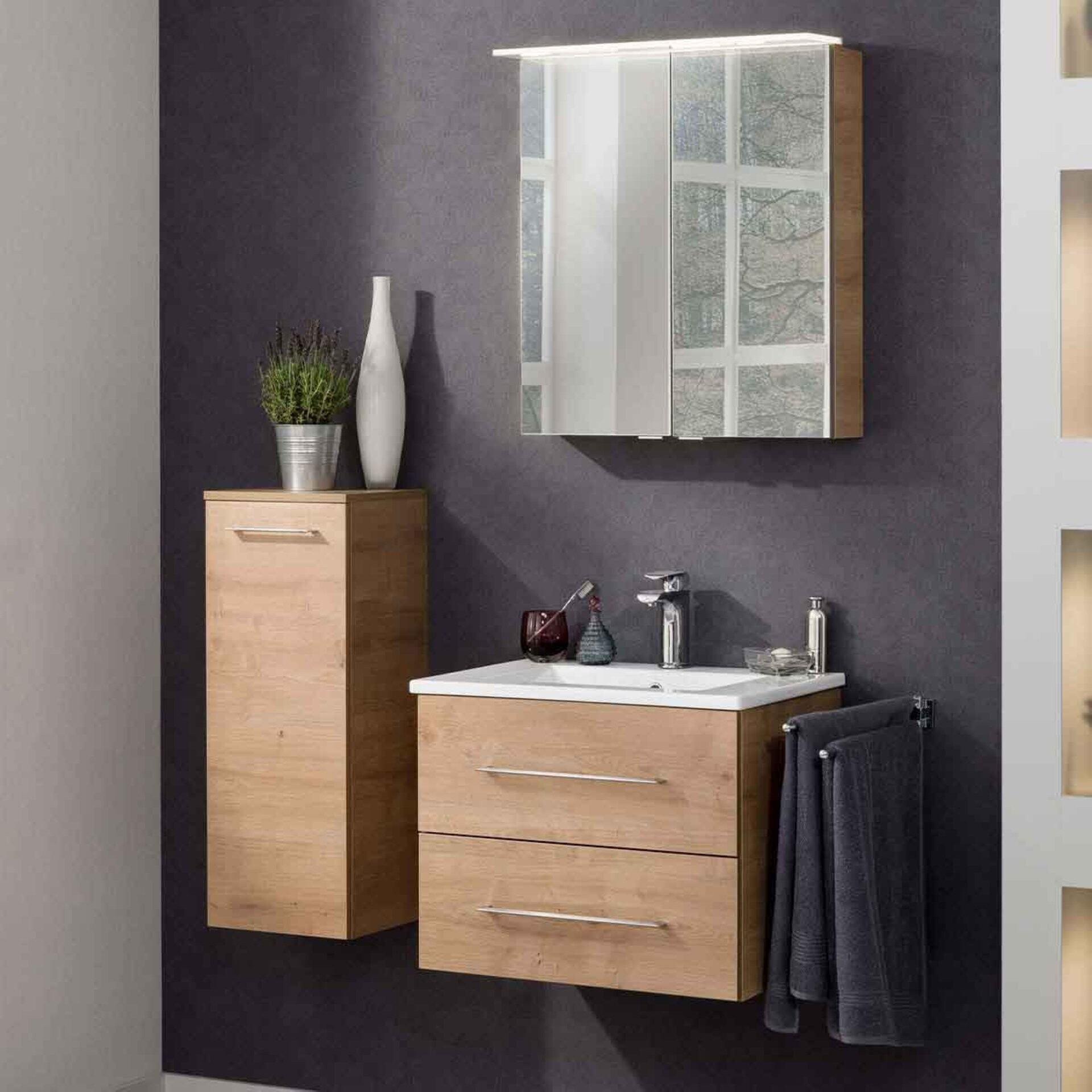 Das 3-teilige 60 cm breite Badmöbel Set aus der Serie B.perfekt von Fackelmann besticht durch seine symmetrische Gestaltung. Auf Grund seiner Maße ist es das perfekte Set für kleine Bäder oder Gäste WCs. Die Breite des Waschtischunterschrank mit Waschbecken wird von dem 60 cm breiten LED Spiegelschrank aufgenommen. So entsteht eine perfekte Harmonie. Das helle Braun des Unterschranks nimmt gekonnt den Trend zu natürlichen Tönen im Badezimmer auf. Holzstrukturen der Eiche sind deutlich zu erkennen. Zwei Schubladen mit chromglänzenden Griffen bieten ausreichend Platz für Deine Badaccessoires. Perfekt auf den Waschtischunterschrank passt das hochwertige Keramikbecken. Gekrönt wird Dein Badmöbel Set mit dem modernen Spiegelschrank von Fackelmann. Er ist mit einer LED-Paneelleuchte aus Acrylglas ausgestattet. Ein Blickfang für Dein neues Bad. Beim Öffnen der Türen zeigen sich die Innenspiegel. Dadurch entsteht ein sogenannter 3D-Effekt, der ein 180 Grad Rundum-Styling gestattet. Badmöbel von Fackelmann werden mit viel Liebe zum Detail in Deutschland hergestellt. Eine perfekte und leicht verständliche Aufbauanleitung hilft Dir beim Aufbau Deines zerlegten Fackelmann B.perfekt Badmöbel Set 3-teilig, 60 cm, Braun hell, LED-Spiegelschrank.