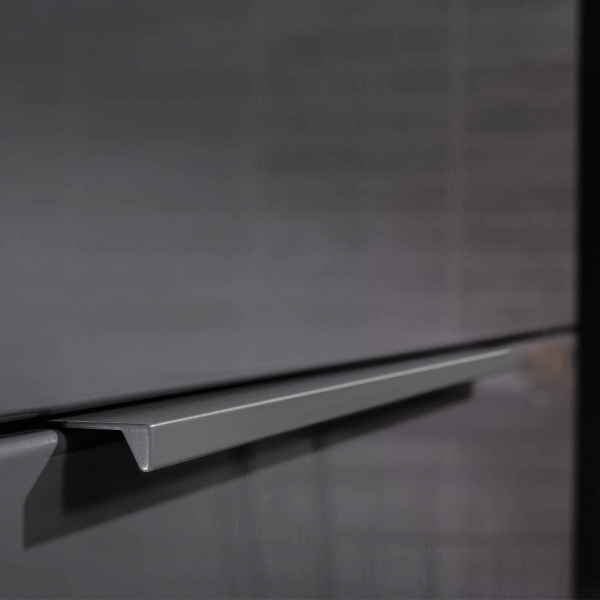 Maße: 80 cm Breite, 61 cm Höhe, 49 cm Tiefe, 2 Schubladen mit Soft-Close-System, Querteile und Rückwand silbergrau, Griffe Aluminium in Frontfarbe matt lackiert, Farbe: Korpus Schwarz/Anthrazit matt, Front Schwarz/Anthrazit Hochglanz, zerlegt
