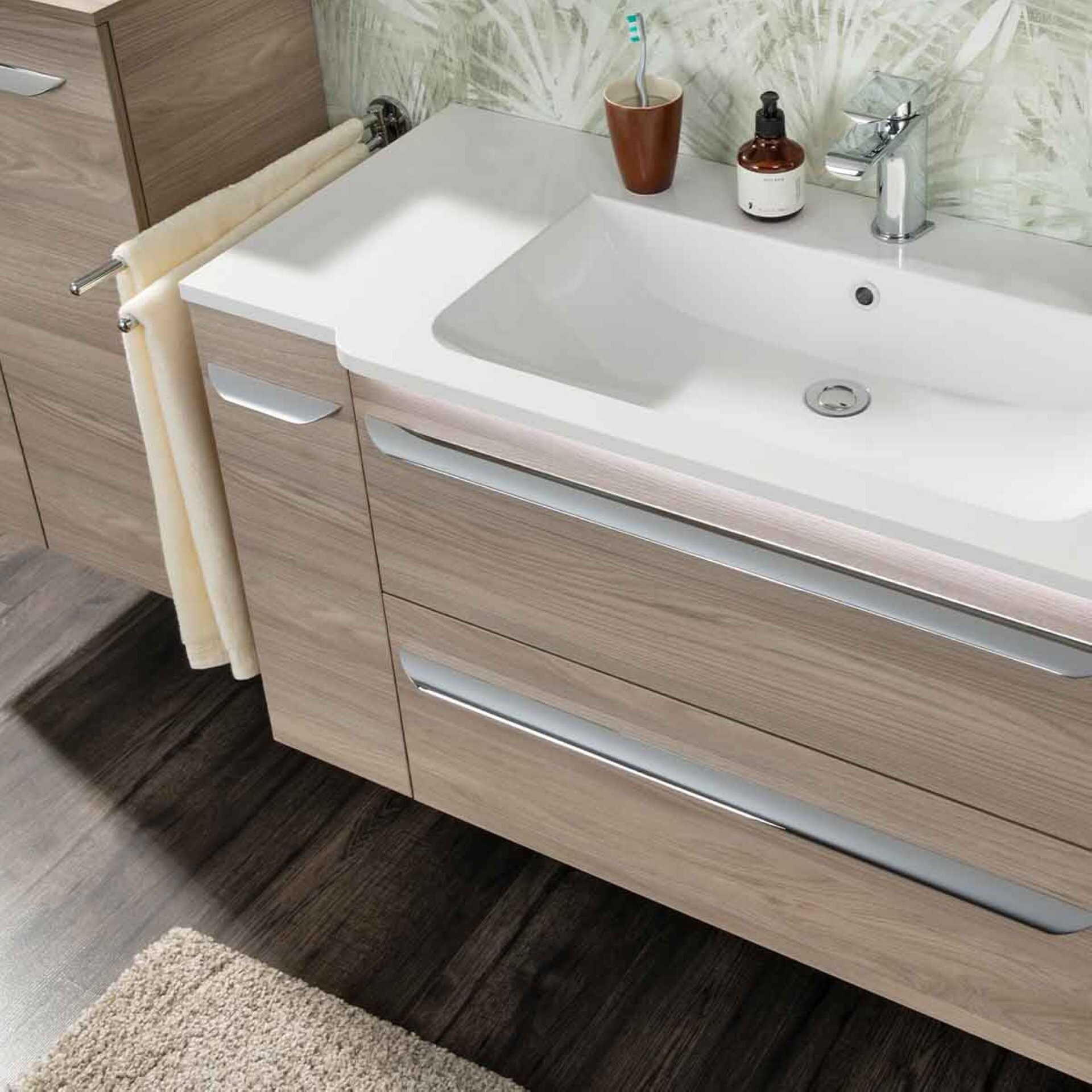 - Besonderheit: Türanschlag links, als Waschtisch-Unterschrank-Ergänzung, Querteile und Rückwand silbergrau