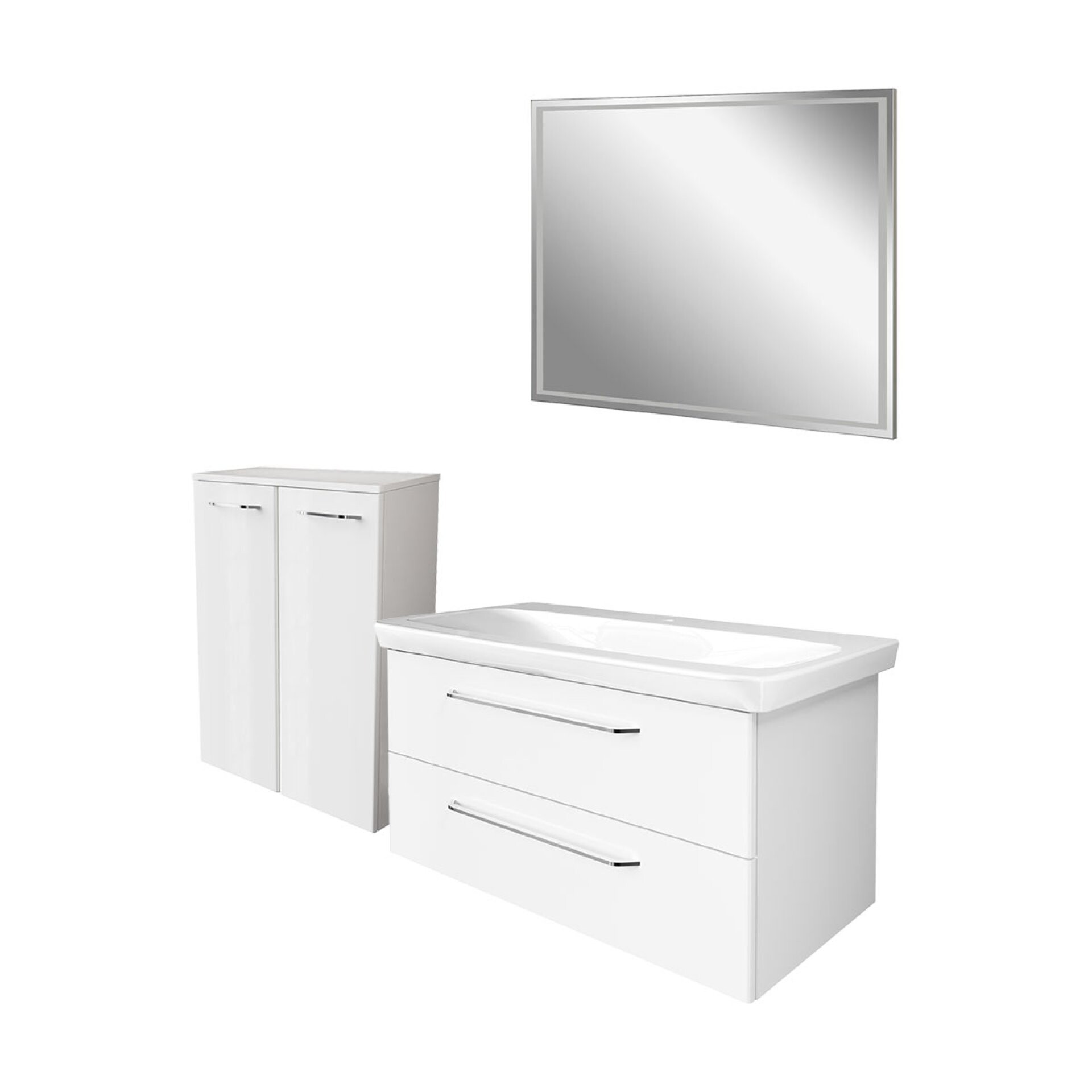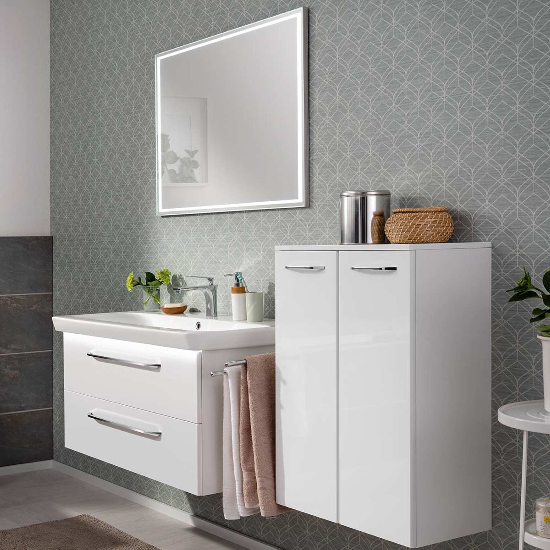 Fackelmann MILANO Badmöbel Set 4-teilig 107 cm breit, Weiß, Waschbecken Keramik inkl. LED-Spiegel + Doppel-Midischrank