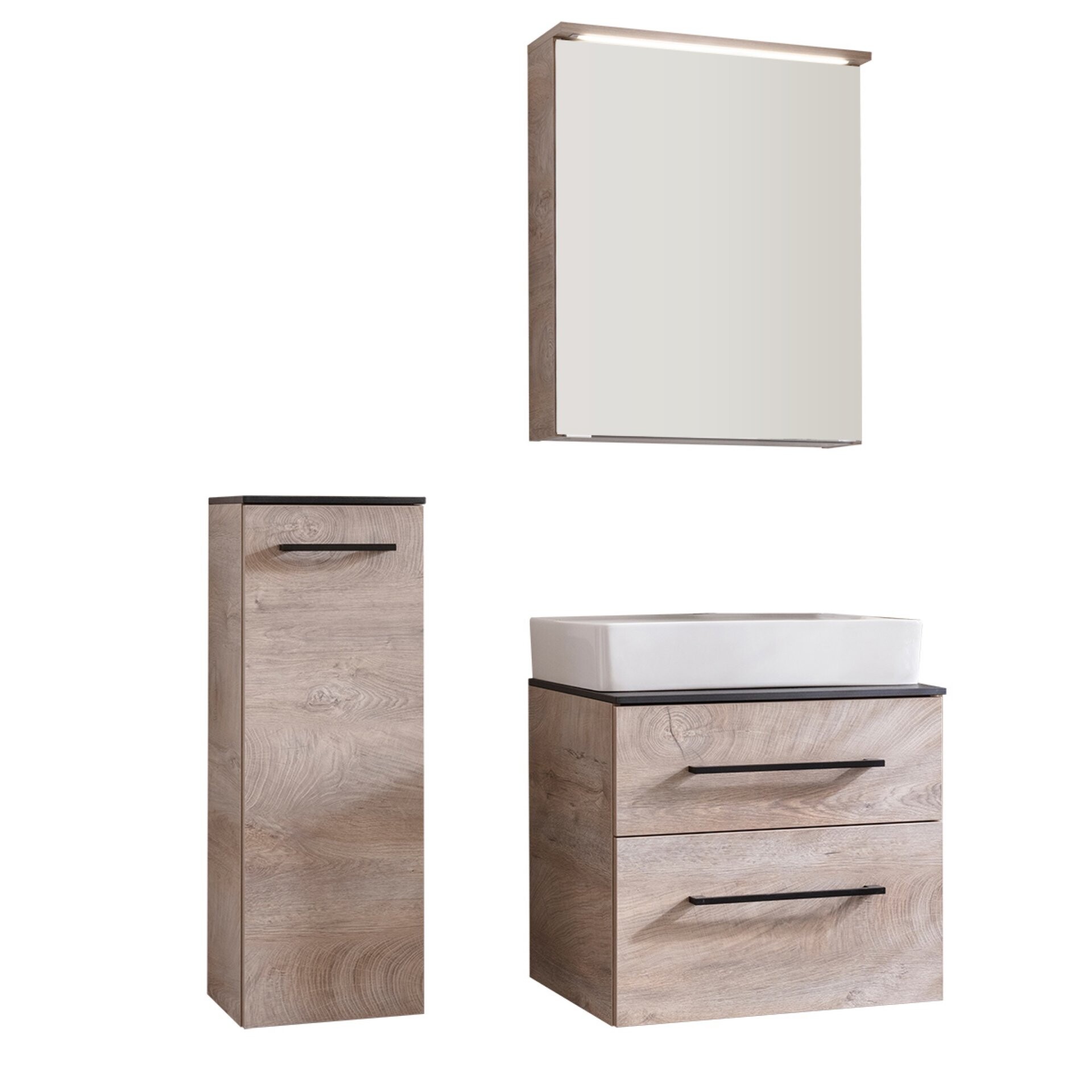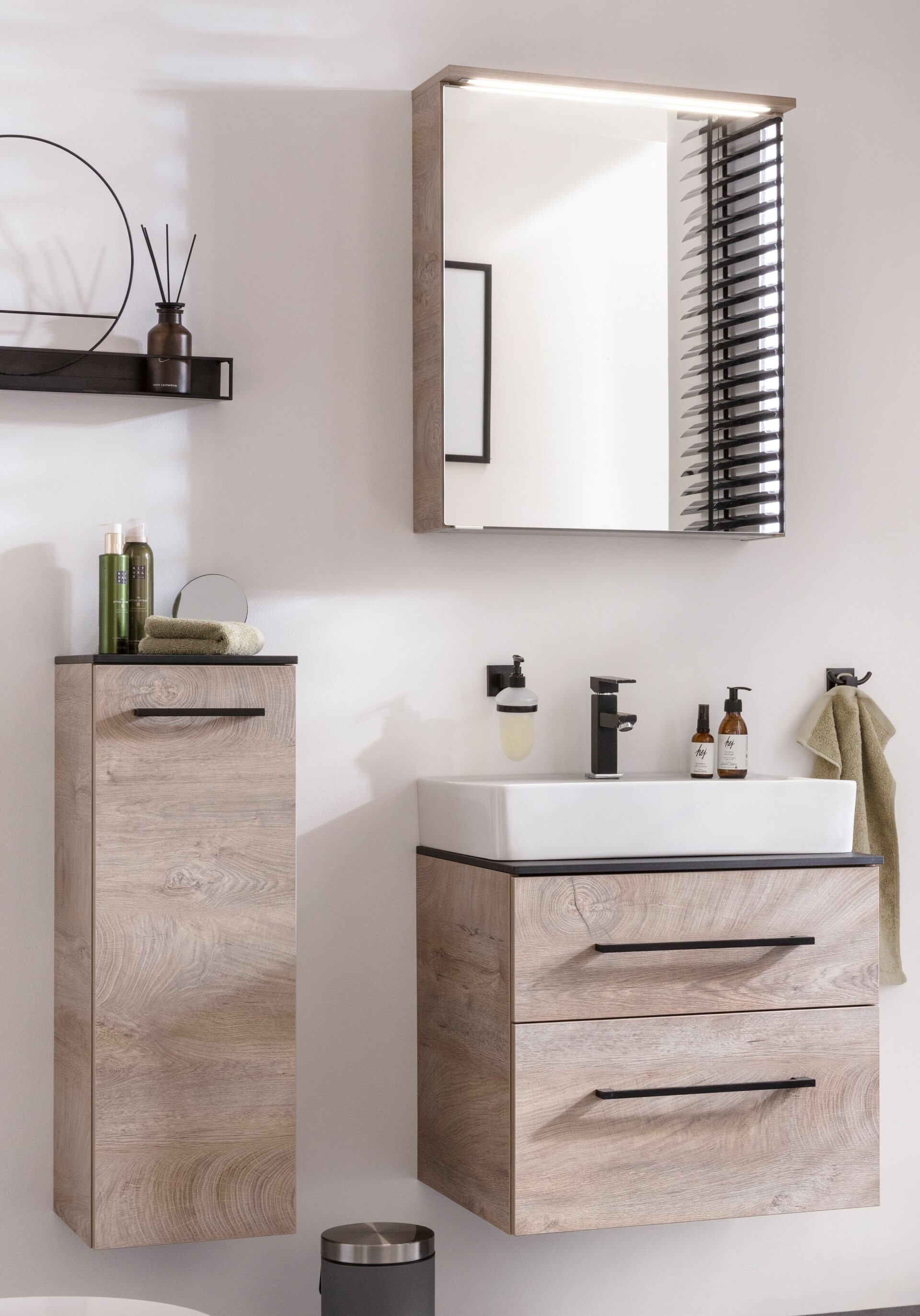 Ein überragendes Angebot an Stauraum und endlich alles aufgeräumt! Mit dem 5-teiligen Set aus der Serie OXFORD von Fackelmann kannst Du Dir diesen Wunsch erfüllen. Und dazu liegst Du mit der Farbwahl voll im Trend. Ein geräumiger Midischrank, ein moderner Spiegelschrank und ein Waschtischunterschrank mit zwei Schubladen lassen keine Wünsche offen. Die edle, schwarze High-Tech-Waschtischplatte mit einer Höhe von nur 12 mm verleiht dem Set Leichtigkeit und ist gleichzeitig ein außergewöhnlicher Blickfang. Sie eignet sich optimal für den Einsatz in Deinem Bad, da sie über eine kratzfeste und lösungsmittelbeständige Oberfläche verfügt, die leicht zu reinigen ist. Unterstrichen wird das Design durch das quadratische, weiße Keramikwaschbecken. Auf Grund seines Materials und der damit verbundenen Eigenschaften haben Keime und Bakterien keine Chance. Die beiden Schubladen des hellbraunen Waschtischunterschranks bieten ausreichend Platz für unterschiedliche Badaccessoires. Mit den beiden schwarzen Griffen lassen sich die Schubladen einfach öffnen und durch das Soft-Close System sanft schließen. Für Ordnungsliebhaber bietet der 82 cm hohe Midischrank mit seinen zwei Glaseinlegeböden ein überragendes Platzangebot. Der 60 cm breite LED-Spiegelschrank von Fackelmann mit seinem hellbraunen Korpus überzeugt durch seine extra breite Spiegeltür mit Innenspiegel. Die LED Leuchtpaneele sorgt für ausreichend Licht für Dein perfektes Styling. Mit viel Liebe zum Detail werden die Möbel in Deutschland hergestellt. Sie werden zerlegt und mit einer leicht verständlichen Anleitung zum Selbstaufbau geliefert. So ist Dein neues modernes Fackelmann OXFORD Badmöbelset 5-teilig, 60 cm, Braun hell, Keramik breit rasch in Deinem Badezimmer integriert.