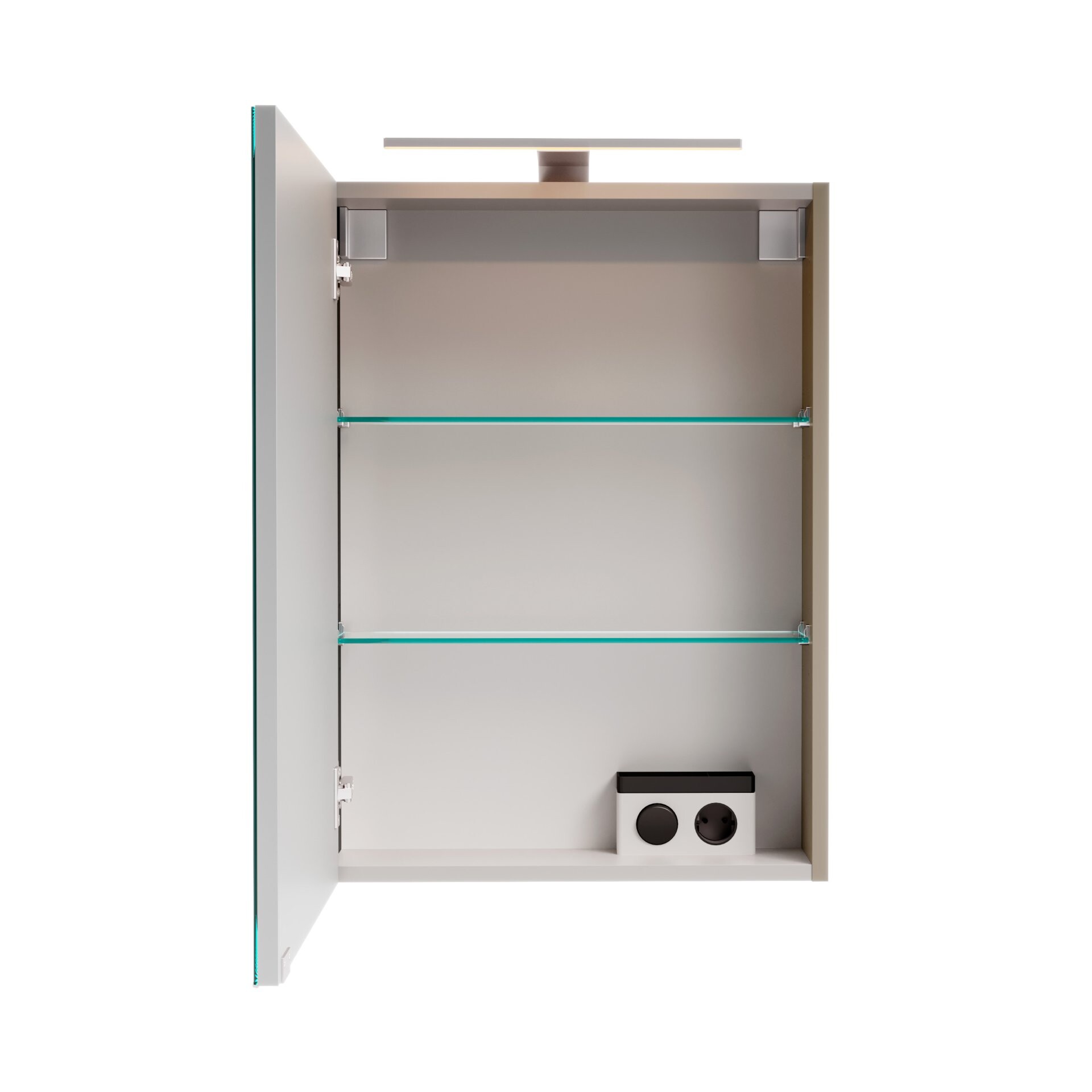 - Ausstattung: 1 Tür, LED-Aufsatzleuchte (3,3W), 2 Glaseinlegeböden, E-Box, Schalter, Kabellänge 0,8m