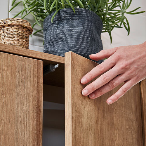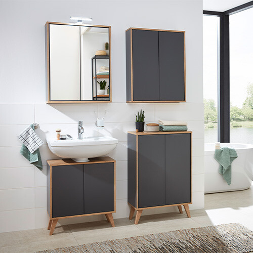 Der nordischen Lebensweise entsprechend bestechen die skandinavischen Badmöbel der Serie Finn durch Ruhe und Sachlichkeit, bringen jedoch auch einen gewissen Retro-Flair mit sich. Die Produkte kommen in schlichtem Weiß und elegantem Anthrazit daher, stets kombiniert mit rustikaler Asteiche. Die Türen der Schränke sind mit einer modernen Push-to-open Technik ausgestattet: Ein leichter Druck genügt, um sie sanft zu öffnen. Wähle diese Badmöbel und Du holst Skandinavien sozusagen in Dein Badezimmer!