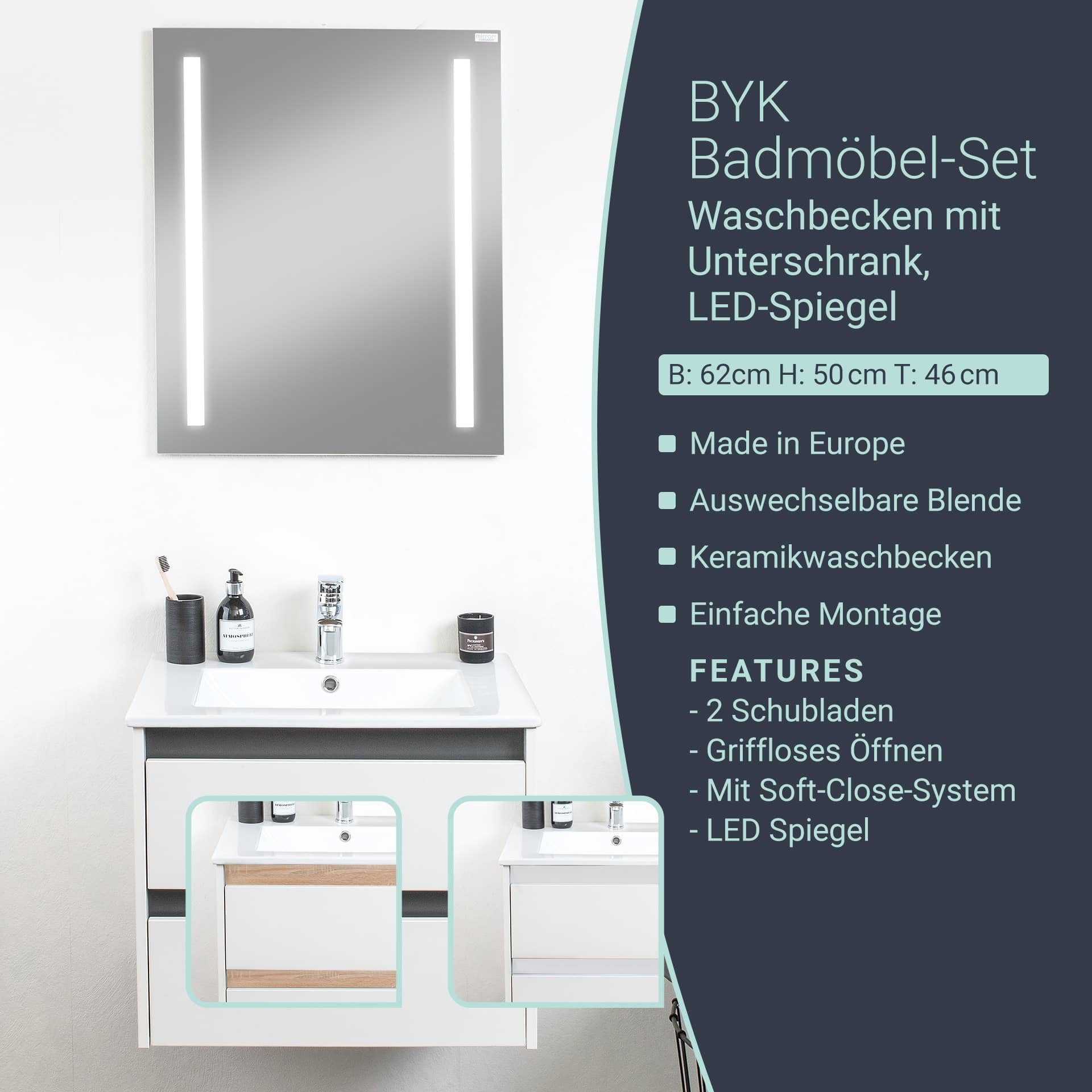 Schlicht und abwechslungsreich, dafür steht die Badmöbelserie BYK von BadeDu. Verleihe Deinem Badezimmer einen neuen Look mit dem 3-teiligen Badmöbel-Set BYK. Mit einer Breite von 60 cm passt das Set perfekt in jedes moderne Badezimmer. Es besteht aus einem Waschbeckenunterschrank mit 2 grifflosen Schubladen und einem hochwertigen Waschtisch aus Keramik in Weiß sowie einem LED-Spiegel. Jede Menge Stauraum für Badutensilien bietet der Unterschrank mit seinen beiden Schubladen, ausgestattet mit Soft-Close-System für ein leises Schließen. Das Highlight dieses Sets? Die auswechselbare Blende. Setze farbliche Akzente in natürlicher Holzoptik (Eiche), modernem Anthrazit oder klassischem Weiß und verändere das Aussehen des weißen Unterschranks. Über dem Waschtisch sorgt ein LED-Spiegel mit moderner Beleuchtungstechnik für eine optimale Ausleuchtung der Spiegelfläche. Das Badezimmermöbel-Set wird in Europa hergestellt und zerlegt geliefert. Mit der beiliegenden Montageanleitung und dem Montagematerial kannst Du das Waschbecken mit Unterschrank in kürzester Zeit in Deinem Badezimmer aufstellen.