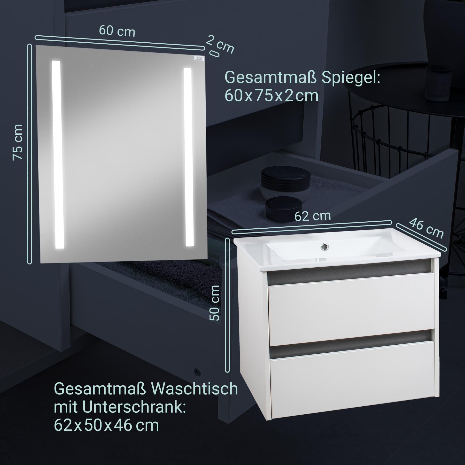 • Ausstattung: LED-Beleuchtung rechts und links, 2 x 3,5 Watt, 4250 Kelvin (Neutralweiß), Anschlusskabel Länge ca. 50 cm, anschlussfertig