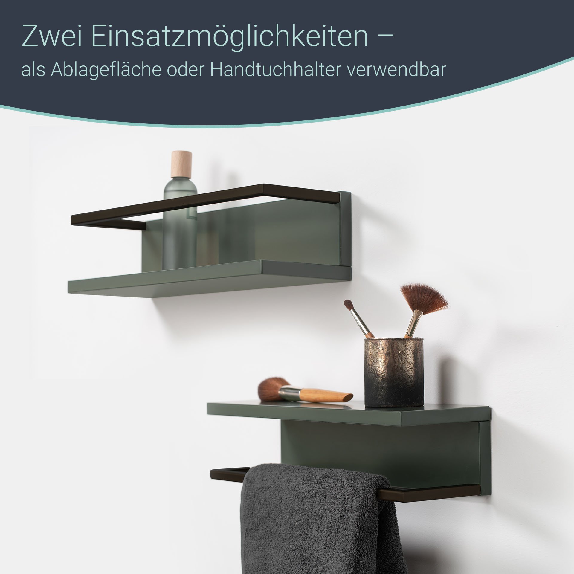 Passend zum Design und der Farbe von Waschtischunterschrank und Badschrank aus der Serie DUNA von BadeDu bringt das 40 cm breite Badregal mit seinem frischen Grün einen zusätzlichen Blickfang in Dein Badezimmer. Das Badregal von BadeDu bietet zwei Einsatzmöglichkeiten. Einmal kann es als Ablage- oder Abstellfläche genutzt werden. Hier finden die elektrische Zahnbürste, Parfums, Cremes oder Rasierer einen geeigneten Platz. So hast Du schnellen Zugriff auf Deine Badaccessoires. Weiterhin eignet sich dieses Badregal als exklusiver Handtuchhalter. Du hast die Wahl. Dabei ist die Montage des BADEDU DUNA Badregal 40 cm breit, Grün kinderleicht.