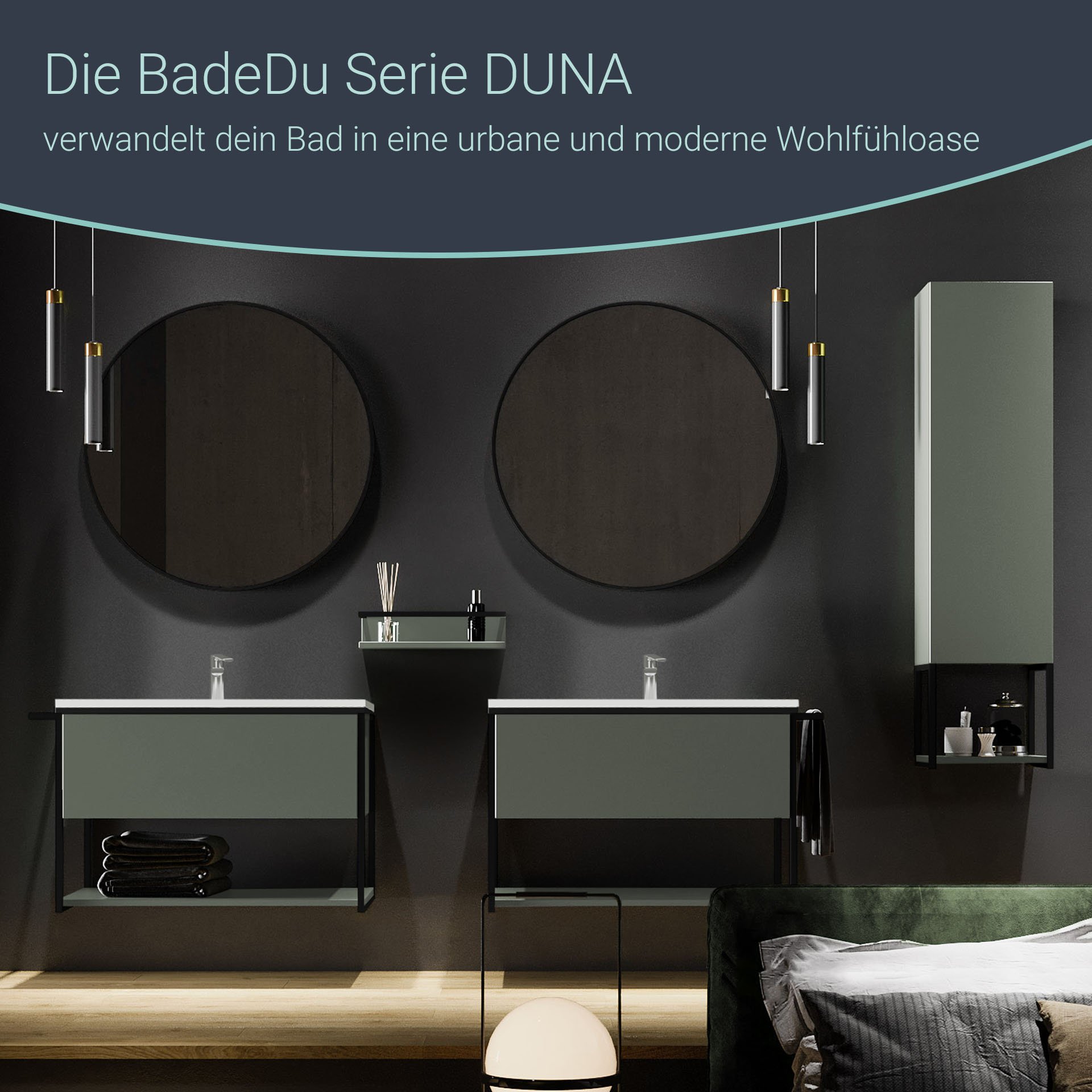 Die außergewöhnliche Farbwahl des 80 cm breiten Waschtischunterschranks harmoniert perfekt mit neutralen Tönen und bringt Frische in Dein Bad. Die Farbe Grün wirkt beruhigend und schafft eine Oase der Entspannung. Das zweiteilige Set im Industrial Style zeichnet sich durch sein minimalistisches Design aus. Metallakzente und klare Linien schaffen eine urbane, moderne Atmosphäre. Eine voll ausziehbare Schublade und ein Regal im unteren Bereich des Waschtischunterschranks bieten Dir ausreichend Platz für Deine Badaccessoires. Im Design integriert ist ein praktischer Handtuchhalter. Das hochwertige Keramikwaschbecken überzeugt durch seine pflegeleichte Oberfläche und seine Langlebigkeit. Seine makellose Optik wird Dich bei der richtigen Pflege viele Jahre lang begleiten. Der BADEDU DUNA Waschbecken mit Unterschrank 82 cm breit, Grün, Waschbecken Keramik Weiß wirkt beruhigend in Deinem Badezimmer. Frische und Naturverbundenheit gehören nun zu den ständigen Gästen in Deinem Bad.