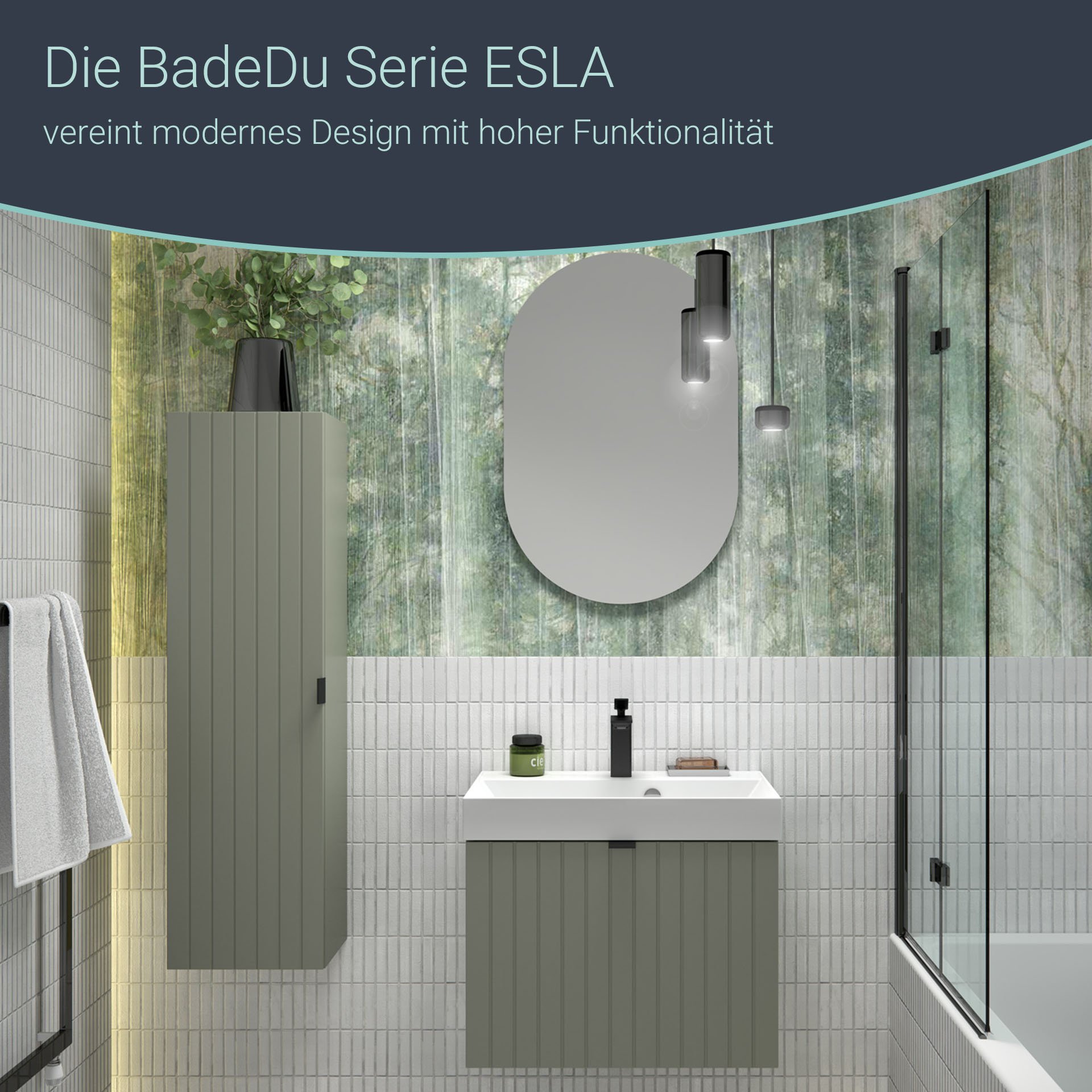 Auf Grund seines Rahmens in mattiertem Grau-Grün harmoniert der ovale Spiegel von BadeDu wunderbar mit verschiedenen Einrichtungsstilen. Von Modern bis rustikal. Die geschwungene, ovale Form verleiht Deinem Badezimmer einen besonderen Charme. Aber nicht nur im Bad macht der Spiegel einen guten Eindruck. Sein Design verzaubert auch andere Räume Deiner Wohnung oder Deines Hauses. Lass Dich von der einzigartigen Ausstrahlung des BADEDU ESLA Spiegel 50 cm breit, Grün inspirieren und verleihe Deinem zu Hause eine anmutige und verspielte Note.