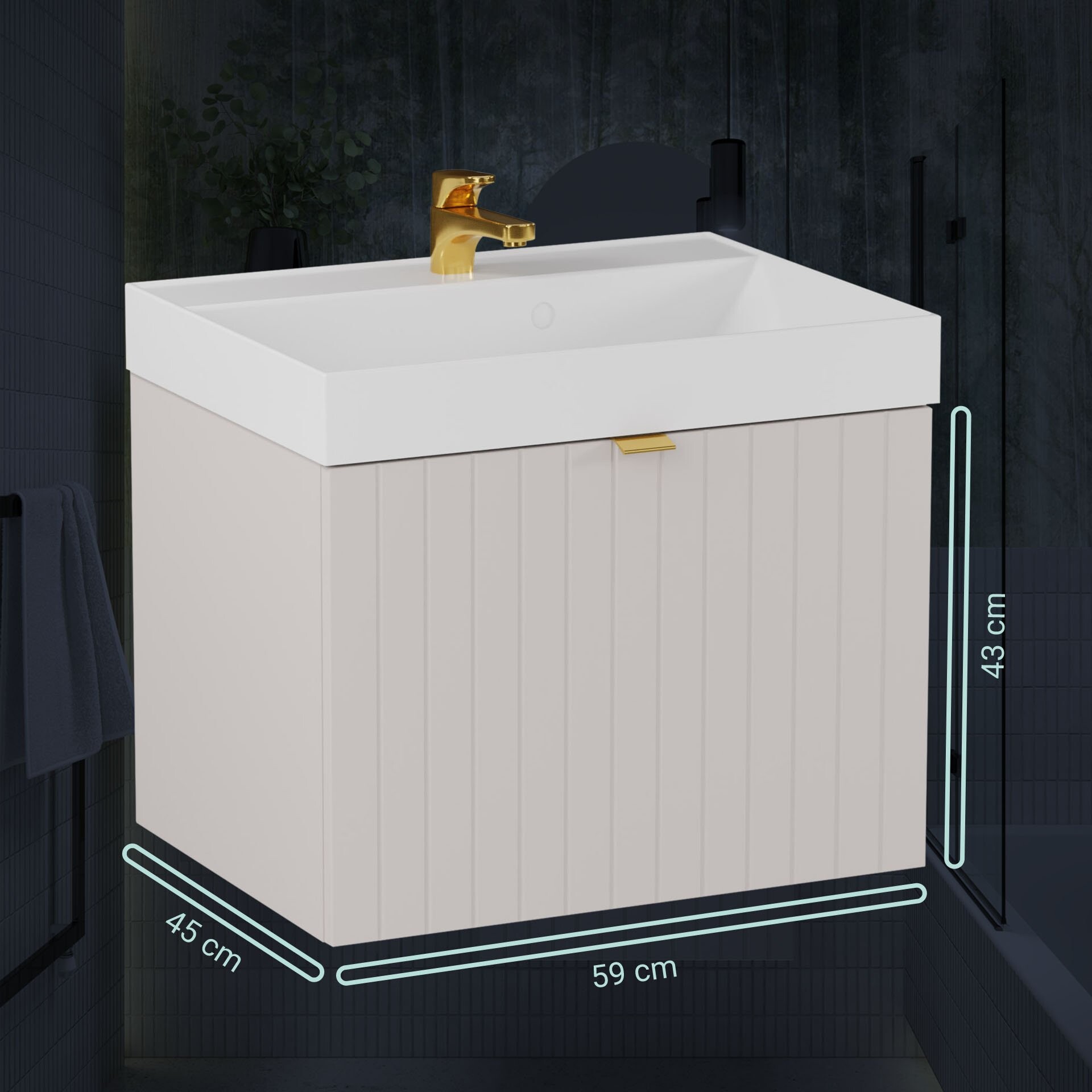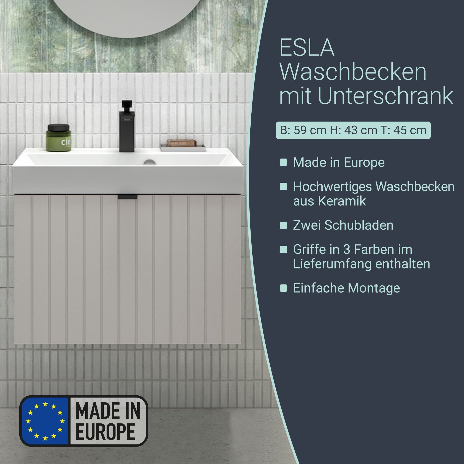 Natürliche Farbtöne bis hin zu pastelligen Nuancen sind en vogue in modernen Bädern. Das 59 cm breite 2-teilige Badmöbel Set aus der Serie ESLA von BadeDu trifft mit seinem Farbspiel genau den Trend der Zeit. Die Farbe Kaschmir sorgt für Leichtigkeit und bringt einen Hauch von Luxus im skandinavischen Stil in Deine neue Badeinrichtung. Hinter dem großen Auszug verbirgt sich eine weitere Schublade. Diese lässt sich mit der Technik push to open leicht öffnen. Beide Schubladen bieten ausreichend Stauraum für kleine Bäder. So sind Deine Badaccessoires immer ordentlich aufgeräumt. Durch die elegante Linienführung in der Front wirkt der Waschtischunterschrank Geradlinig und strahlt eine zeitlose Eleganz aus. Drei verschiedene Griffe in den Farben Schwarz, Gold und Silber sind fester Bestandteil jeder Lieferung. Du kannst individuell entscheiden und die passende Farbe für Dein Bad wählen. Das weiße Waschbecken punktet mit einer tiefen Waschmulde. So bleiben Wasserspritzer da, wo sie hingehören. Mit dem BADEDU ESLA Waschbecken mit Unterschrank 59 cm breit, Grau, Waschbecken Gussmarmor Weiß triffst Du genau die richtige Wahl für Dein neues trendiges und modernes Badezimmer.