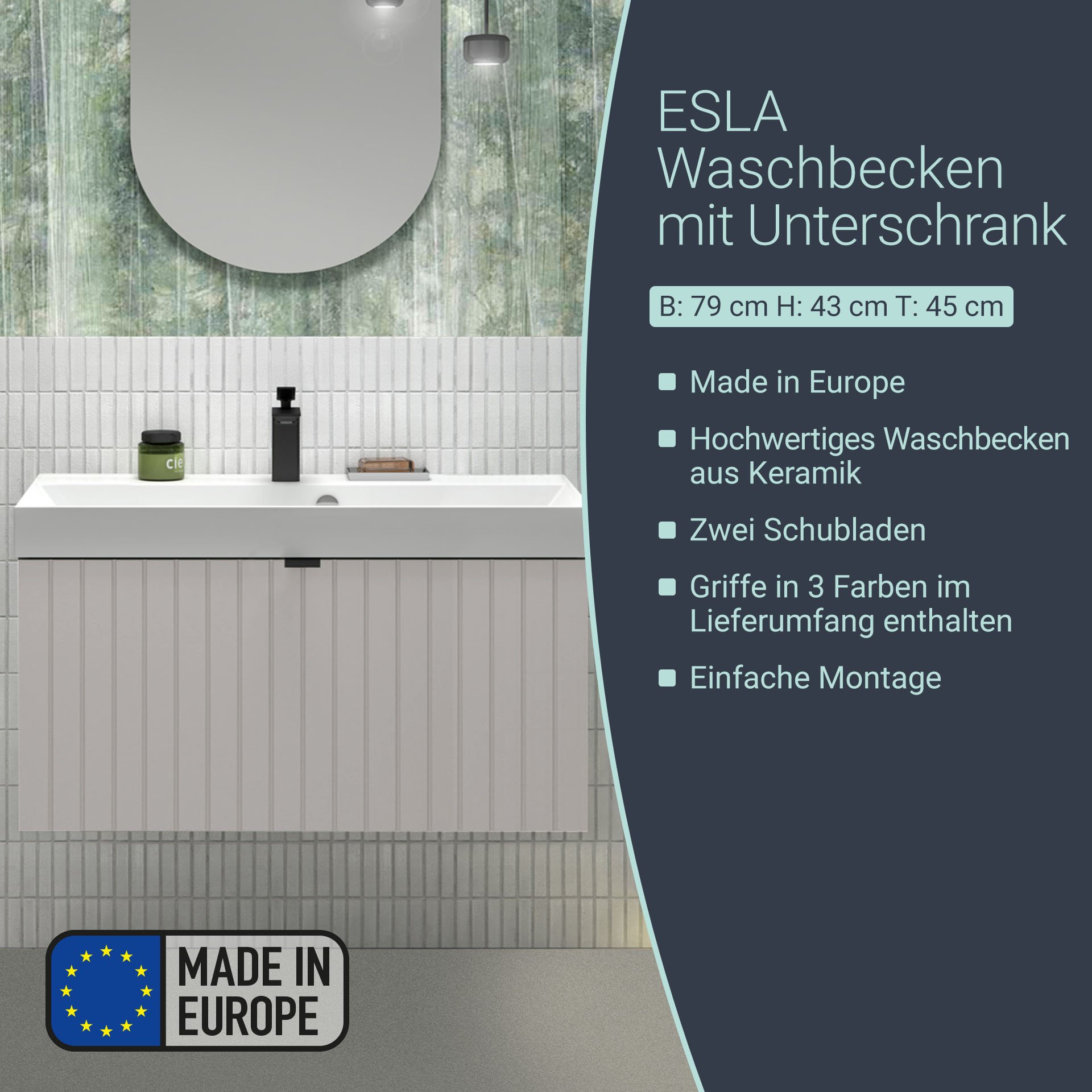 Du suchst ein modernes, attraktives Badmöbelset für Dein großes Badezimmer? Dann hast Du mit dem 79 cm breiten Badmöbelset im skandinavischen Stil genau das Richtige gefunden. Natürliche Farbtöne bis hin zu pastelligen Nuancen sind en vogue in modernen Bädern. Das 2-teilige Badmöbel Set aus der Serie ESLA von BadeDu trifft mit seinem Farbspiel genau den Trend der Zeit. Die Farbe Kaschmir sorgt für Leichtigkeit und bringt einen Hauch von Luxus in Deine neue Badeinrichtung. Hinter dem großen Auszug verbirgt sich eine weitere Schublade. Diese lässt sich mit der Technik push to open leicht öffnen. Beide Schubladen bieten ausreichend Stauraum für kleine Bäder. So sind Deine Badaccessoires immer ordentlich aufgeräumt. Durch die elegante Linienführung in der Front wirkt der Waschtischunterschrank geradlinig und strahlt eine zeitlose Eleganz aus. Drei verschiedene Griffe in den Farben Schwarz, Gold und Silber sind fester Bestandteil jeder Lieferung. Du kannst individuell entscheiden und die passende Farbe für Dein Bad wählen. Das weiße Waschbecken punktet mit einer tiefen Waschmulde. So bleiben Wasserspritzer da, wo sie hingehören. Mit dem BADEDU ESLA Waschbecken mit Unterschrank 79 cm breit, Grau, Waschbecken Gussmarmor Weiß triffst Du genau die richtige Wahl für Dein neues trendiges und modernes Badezimmer.