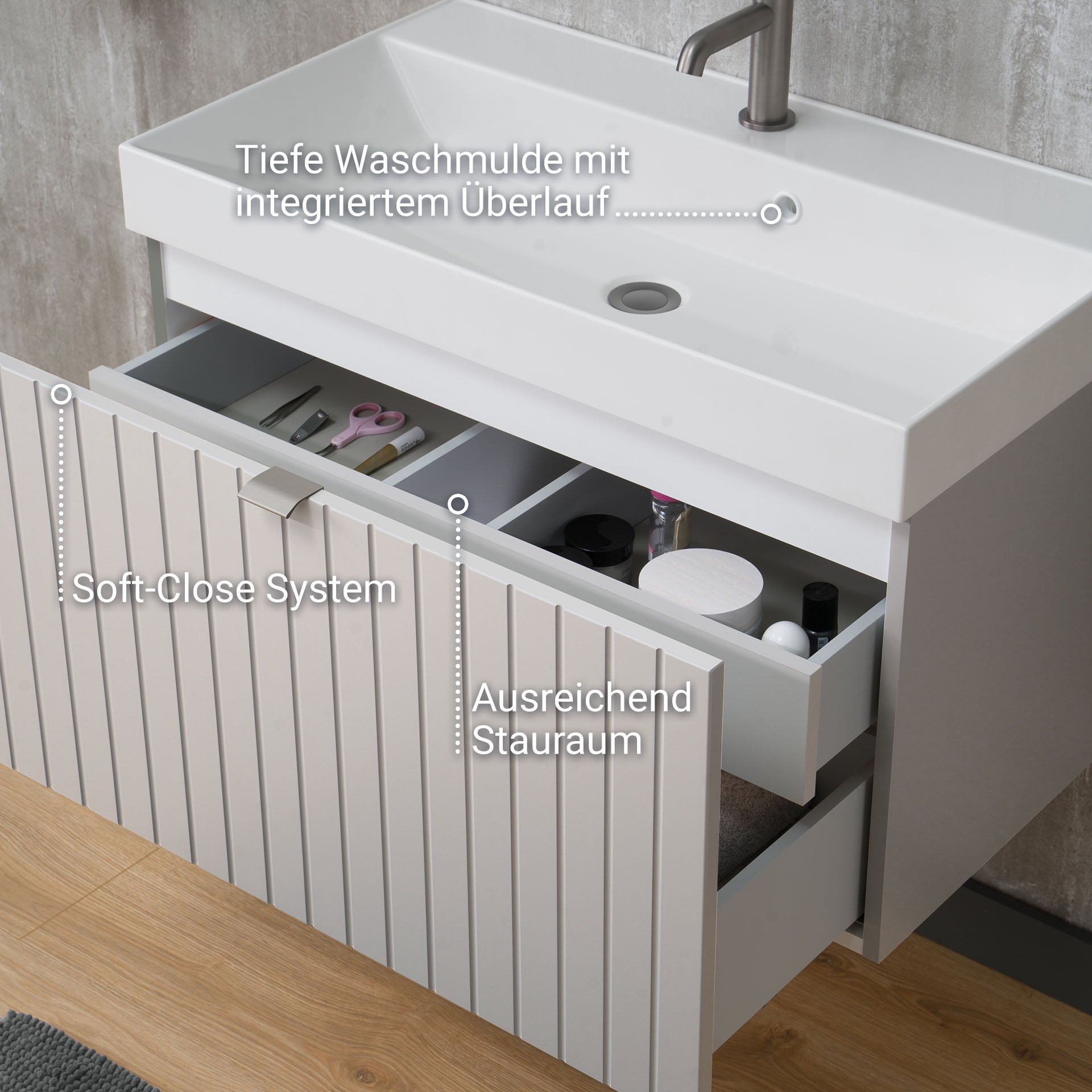 - Besonderheit: tiefe Waschmulde