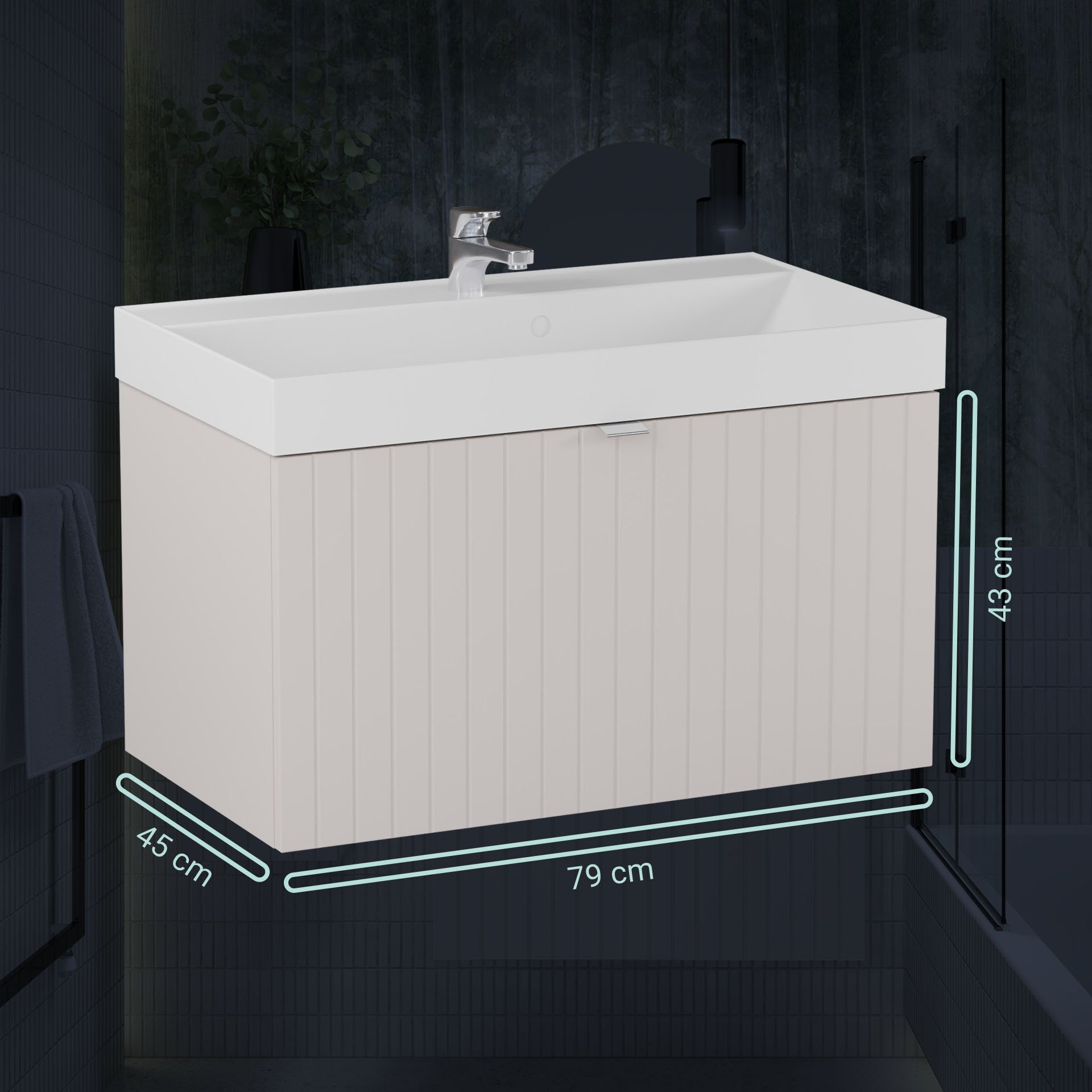 BadeDu ESLA Waschbecken mit Unterschrank 79 cm breit, Grau, Waschbecken Gussmarmor Weiß