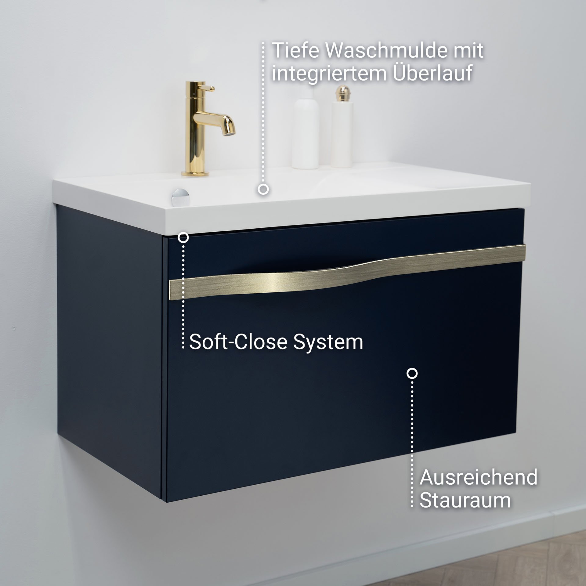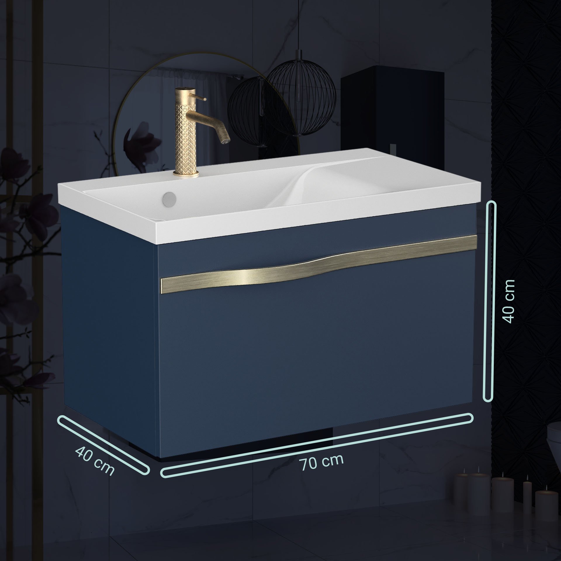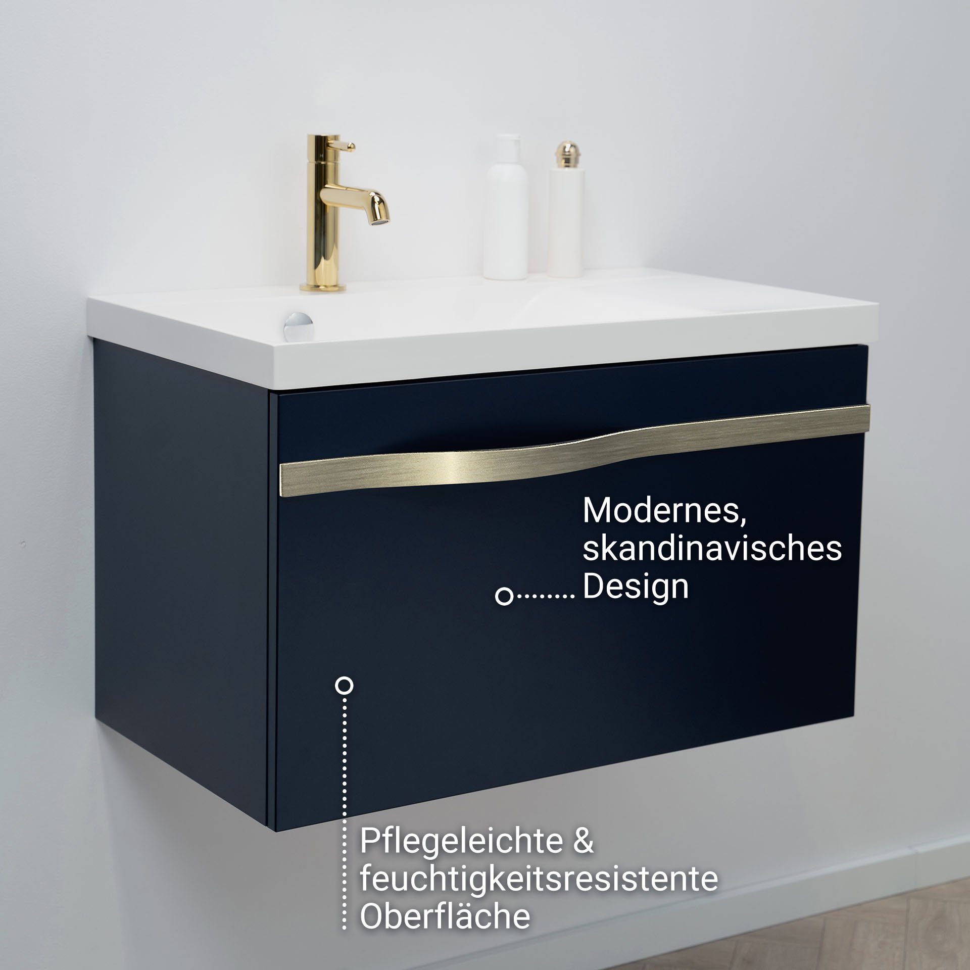 Mit diesem atemberaubenden Badmöbelset aus der Serie FILS von BadeDu holst Du Dir die Welt maritimer Eleganz in Dein Badezimmer. Auf dem tiefen Nachtblau des Korpus ist der Griff in mattem Silber ein Statement. Die geräumige Schublade bietet Platz für Deine Badutensilien. Integrierte Einsätze aus Holz organisieren die kleinen Dinge, wie Lippenstift, Cremes, Makeup und andere Dinge für das tägliche Pflegeritual. Das Waschbecken aus strapazierfähigem Mineralguss sitzt formvollendet auf dem modernen Waschtischunterschrank. Mit diesem Badmöbel-Set in maritimem Blau und Silber setzt Du nicht nur ein Zeichen für Deinen individuellen Stil, sondern beweist einen einzigartigen Geschmack. Die hochwertige Verarbeitung des BADEDU FILS Waschbecken mit Unterschrank 69 cm breit, Blau, Waschbecken Gussmarmor Weiß, Griff Silber garantiert eine lange Lebensdauer und ein perfektes Nutzungserlebnis.