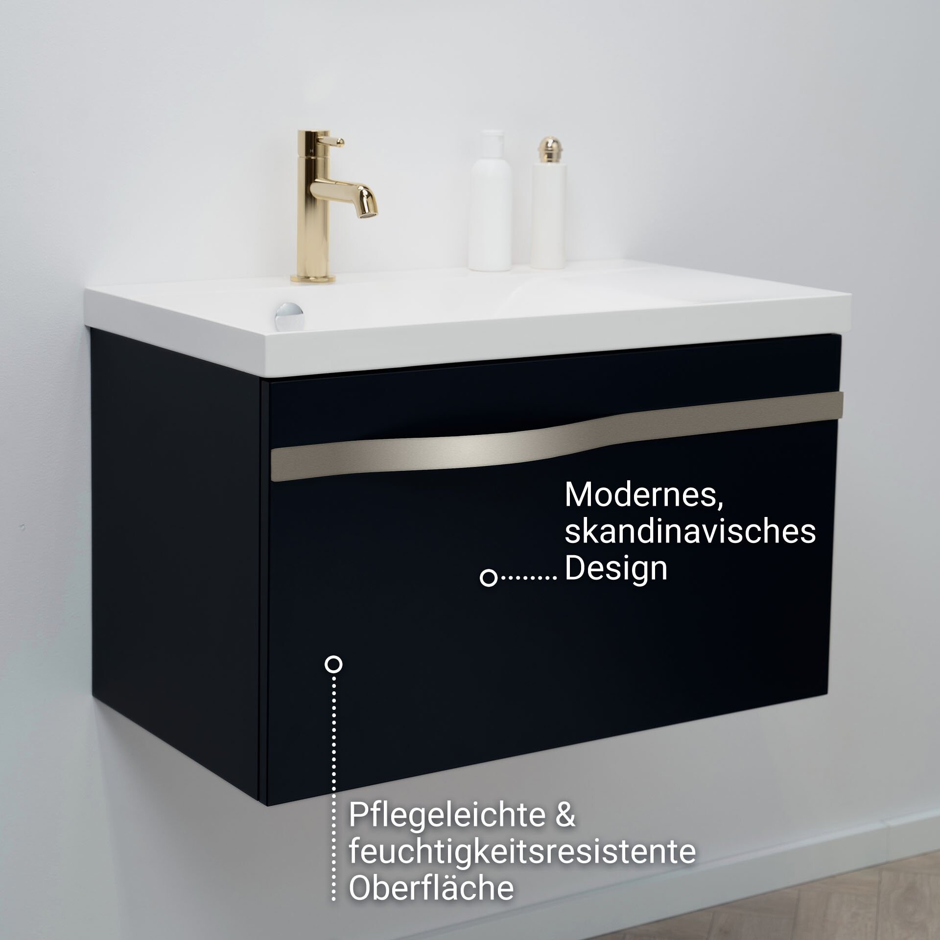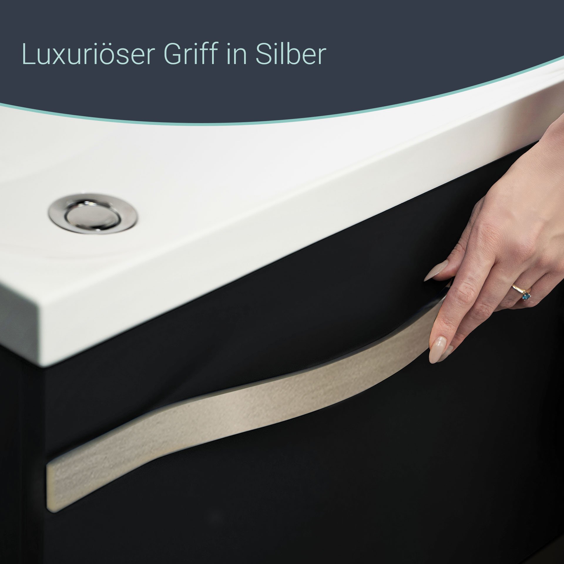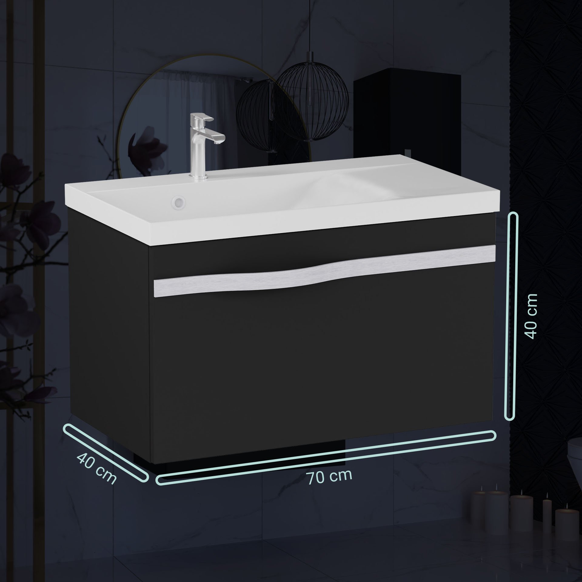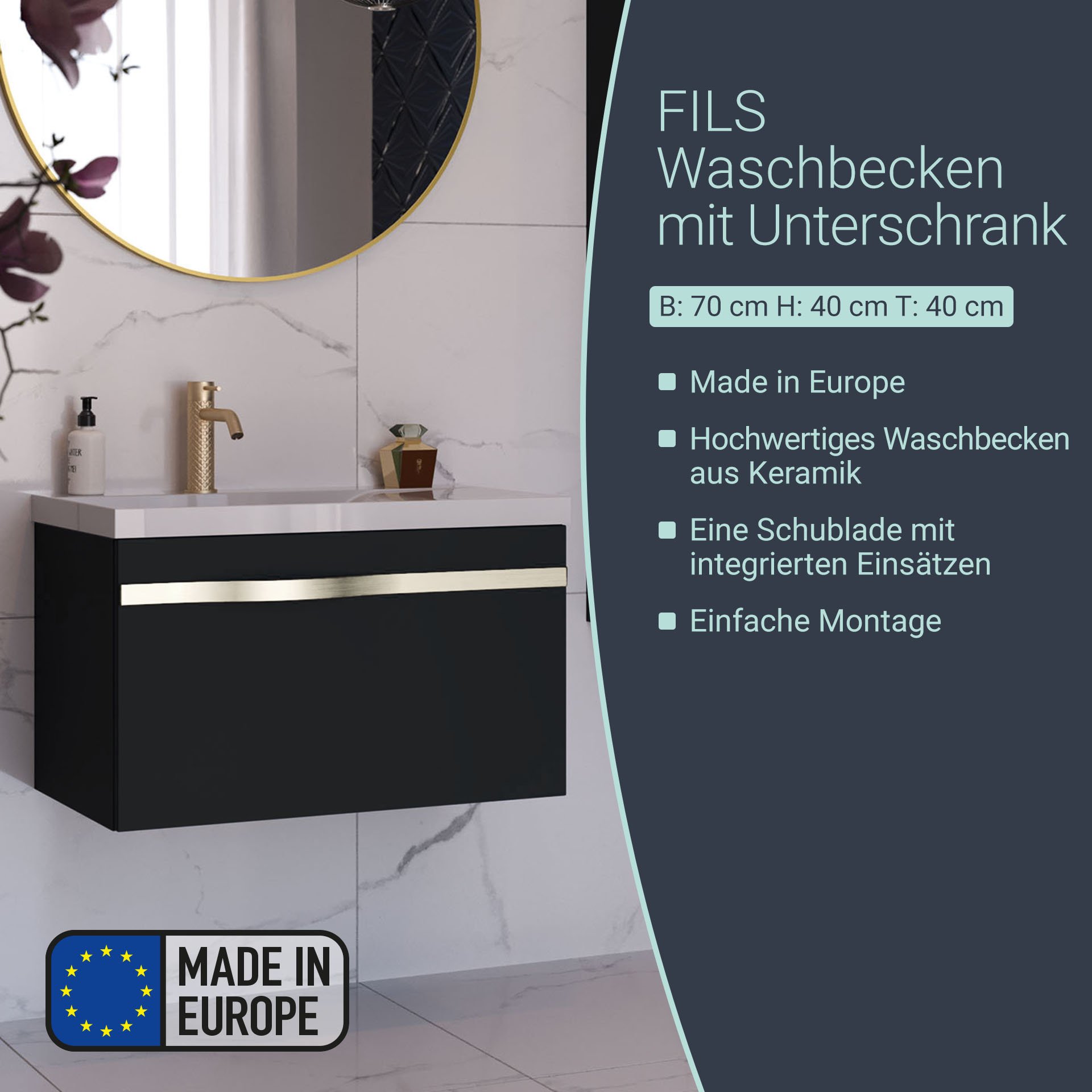 BadeDu FILS Waschbecken mit Unterschrank 69 cm breit, Schwarz, Waschbecken Gussmarmor Weiß, Griff Silber