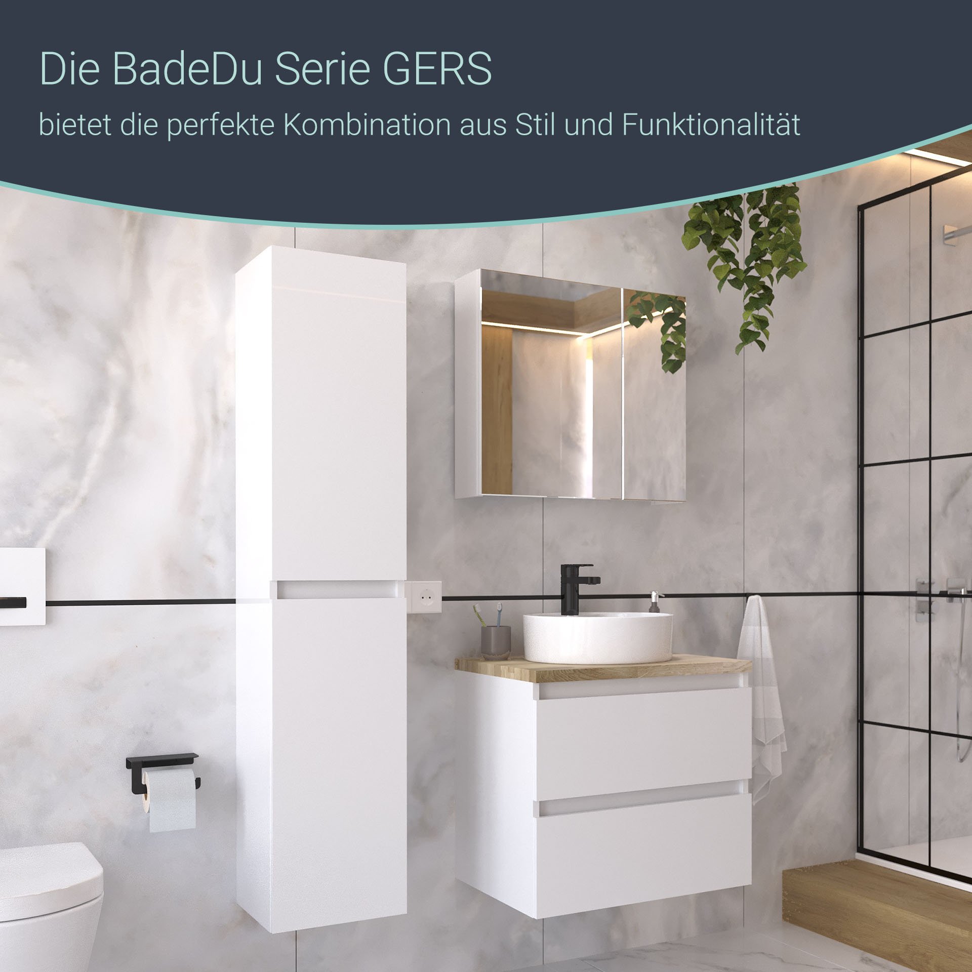 Der 60 cm breite, moderne Spiegelschrank aus der Serie GERS von BadeDu fällt durch seine asymmetrische Gestaltung der Front auf. Beide Spiegeltüren lassen sich mit einer einfachen Handbewegung leicht öffnen. Das innovative Soft-Close-System garantiert ein sanftes Schließen der Türen. Auf Grund der Bauweise des Spiegelschranks hast Du die freie Wahl der Spiegeltüren. Du kannst den großen Spiegel auf der rechten oder linken Seite platzieren. Im Innenraum befinden sich zwei Einlegeböden. Sie sorgen dafür das Deine Badaccessoires ordentlich aufgeräumt sind. Und gleichzeitig hast Du alle Deine Kosmetikartikel griffbereit. Sein weißer Korpus passt hervorragend zu dem Badmöbelset aus der Serie GERS von BadeDu. Sowohl die Farbe als auch die Breite des BADEDU GERS Spiegelschrank 60 cm breit, Weiß bilden mit dem 60 cm breiten Badset ein harmonisches Bild.
