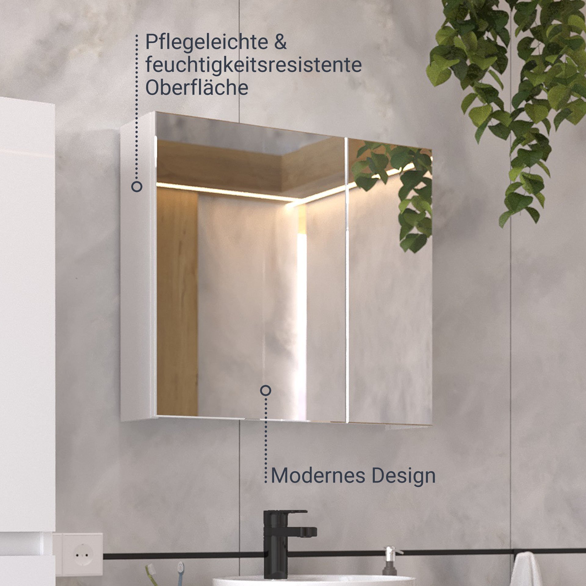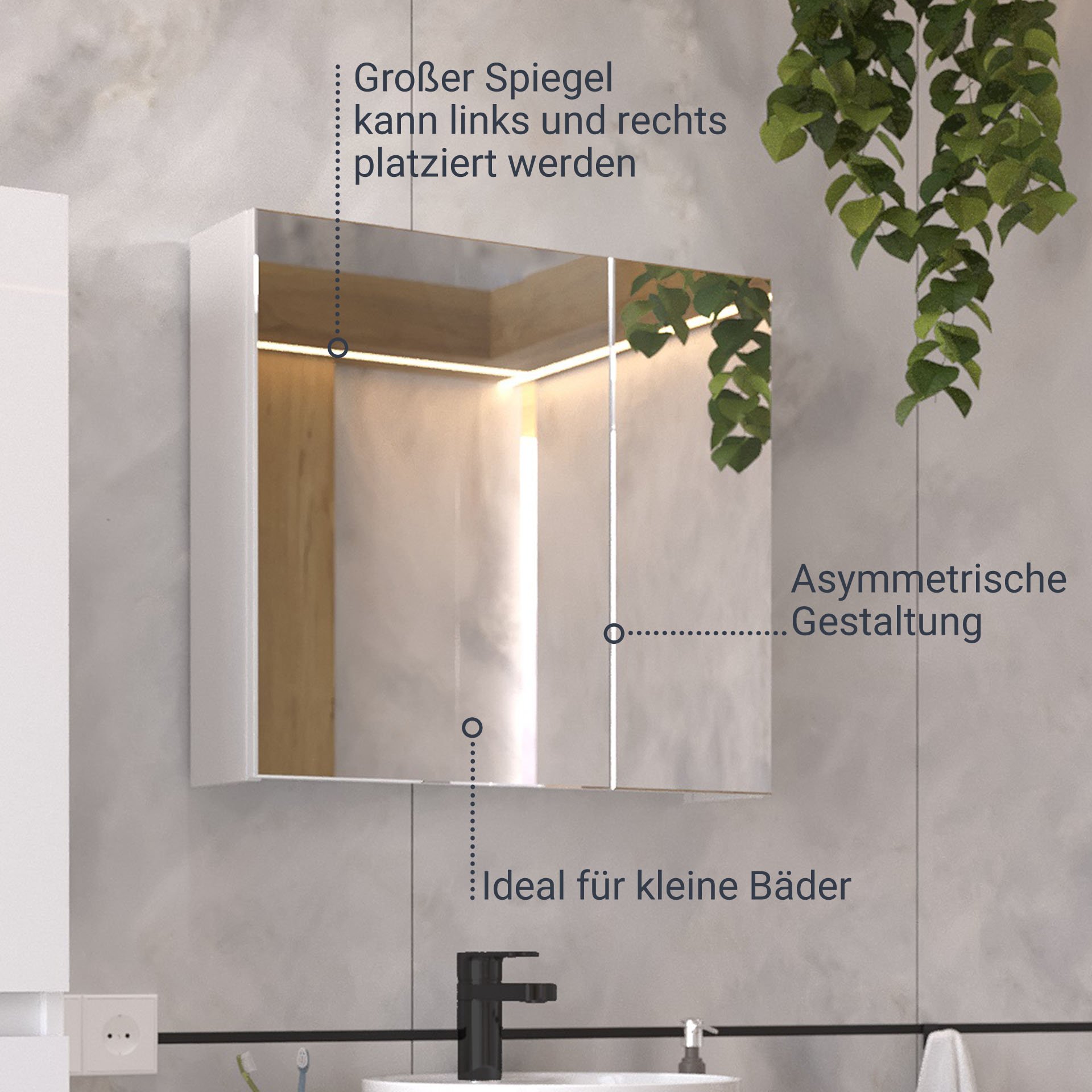 - Besonderheit: Türanschlag links oder rechts, grifflos, ohne Beleuchtung