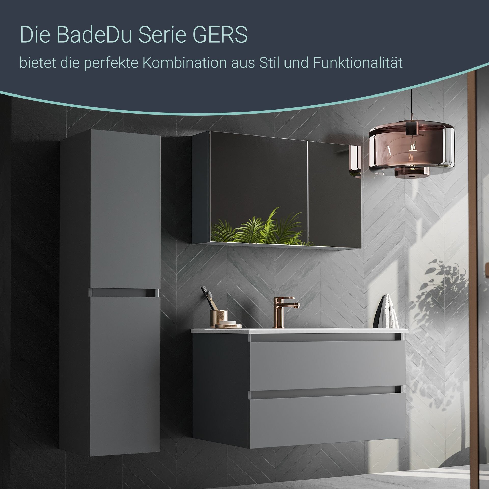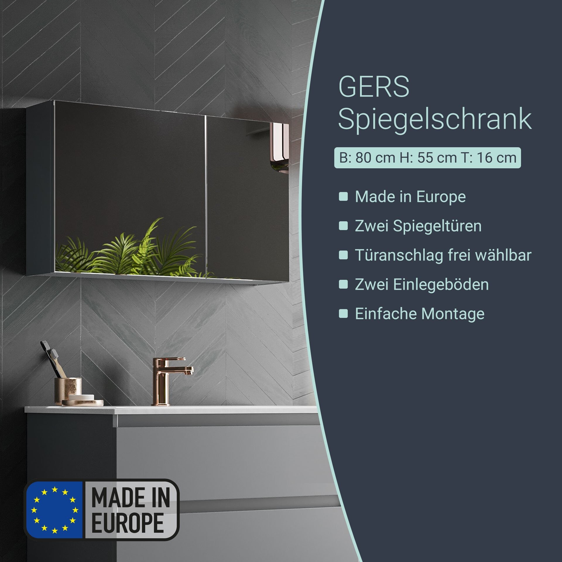 Der 80 cm breite, moderne Spiegelschrank aus der Serie GERS von BadeDu fällt durch seine asymmetrische Gestaltung der Front auf. Beide Spiegeltüren lassen sich mit einer einfachen Handbewegung leicht öffnen. Das innovative Soft-Close-System garantiert ein sanftes Schließen der Türen. Auf Grund der Bauweise des Spiegelschranks hast Du die freie Wahl der Spiegeltüren. Du kannst den großen Spiegel auf der rechten oder linken Seite platzieren. Im Innenraum befinden sich zwei Einlegeböden. Sie sorgen dafür das Deine Badaccessoires ordentlich aufgeräumt sind. Und gleichzeitig hast Du alle Deine Kosmetikartikel griffbereit. Sein Korpus in modernem Graphit passt hervorragend zu dem Badmöbelset aus der Serie GERS von BadeDu. Sowohl die Farbe als auch die Breite des BADEDU GERS Spiegelschrank 80 cm breit, Grau bilden mit dem 80 cm breiten Badset ein harmonisches Bild.