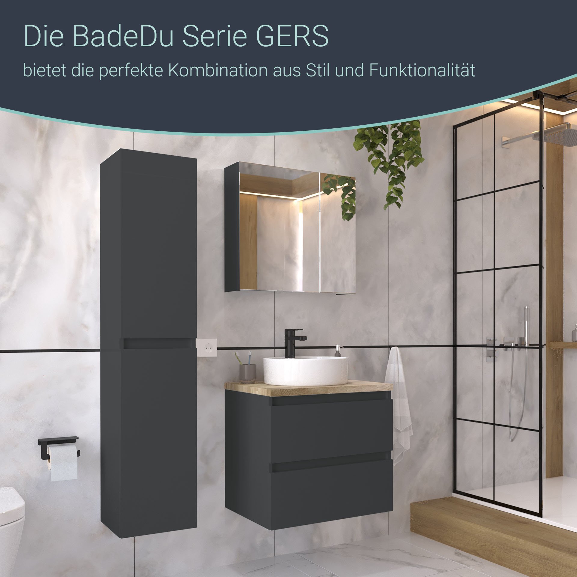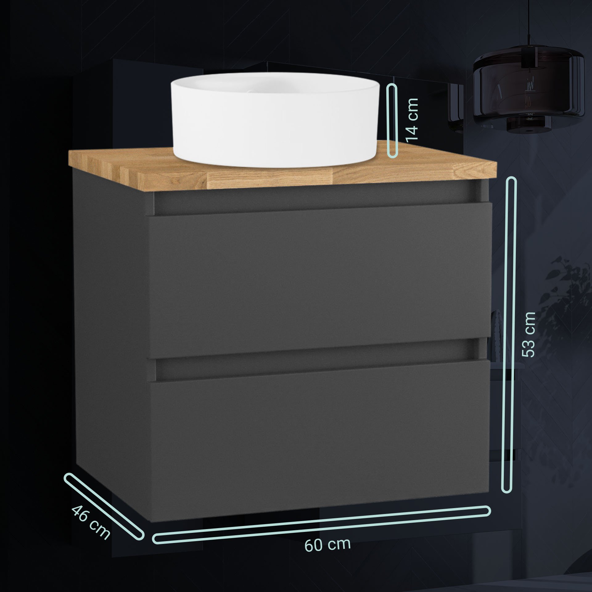 Ein runde Waschschüssel aus feiner weißer Keramik und eine 28 mm starke Waschtischplatte aus Eichenholz krönen das 2-teilige Badmöbelset aus der Serie GERS von BadeDu. Der Waschtischunterschrank ist grifflos und wirkt dadurch minimalistisch im Design. Farbwirkung und die Formensprache kommen effektiv zur Geltung. Das 60 cm breite 2-teilige Badmöbelset überzeugt durch seine Zeitlosigkeit und Raffinesse. Kleinere Badezimmer sind mit diesem Set exklusiv ausgestattet. Die Farbe Graphit, eine Spielart von Grau, schafft optische Reize und verleiht Deinem Badezimmer eine ansprechende Tiefe. Zwei grifflose Schubladen bieten ausreichend Stauraum für Deine Badaccessoires. Ein Einsatz mit unterschiedlich großen Fächern aus Holz organisiert die kleinen Dinge, wie Lippenstift, Cremes, Makeup und andere Dinge für das tägliche Pflegeritual. So ist alles ordentlich aufgeräumt und immer griffbereit. Das Badmöbelset in seiner Kombination BADEDU GERS Waschbecken mit Unterschrank 60 cm breit, Grau, Aufsatzwaschbecken Keramik Weiß Waschtischplatte Braun hell lässt Dein Bad in neuem Glanz erstrahlen.