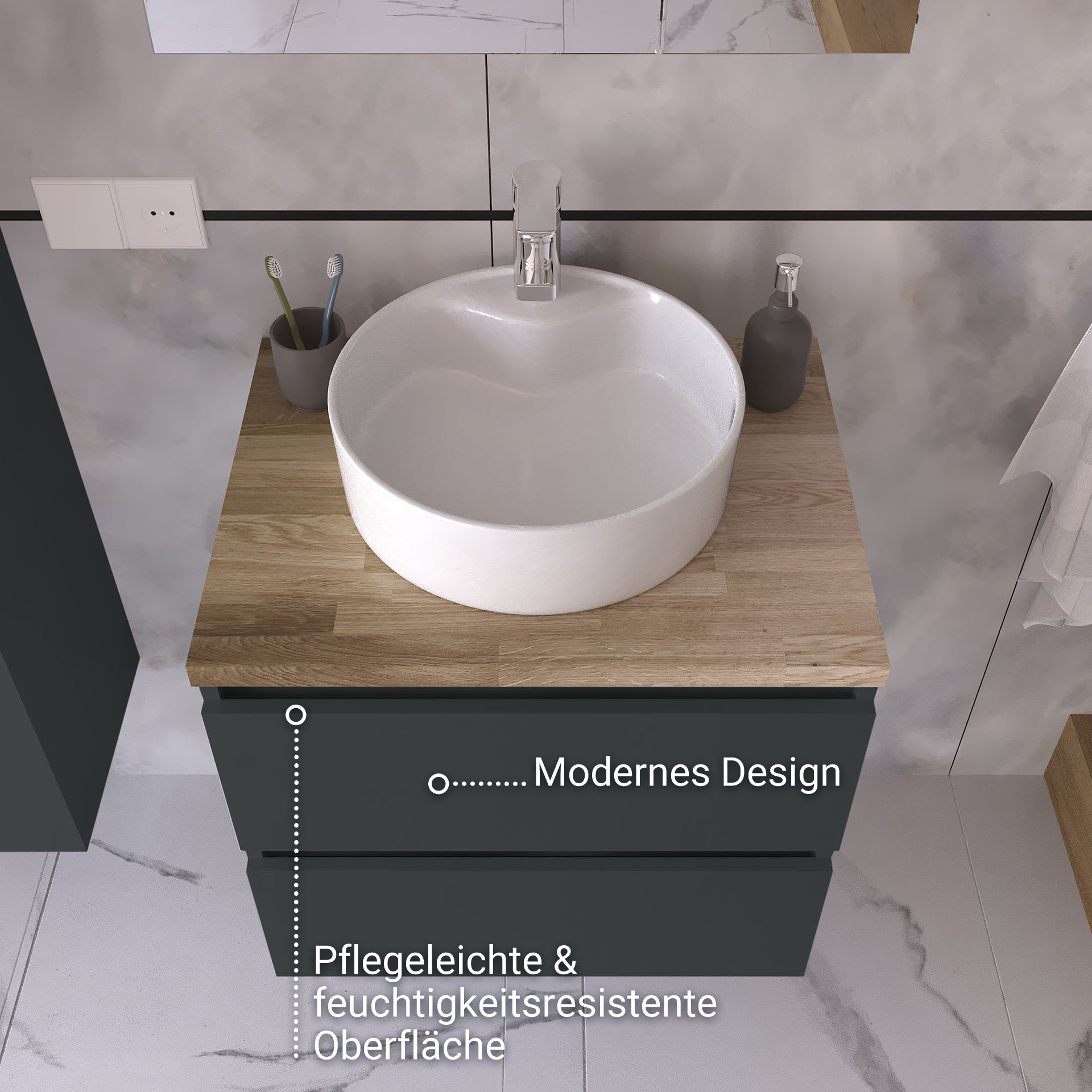 BadeDu GERS Waschbecken mit Unterschrank 60 cm breit, Grau, Aufsatzwaschbecken Keramik Weiß, Waschtischplatte Braun hell
