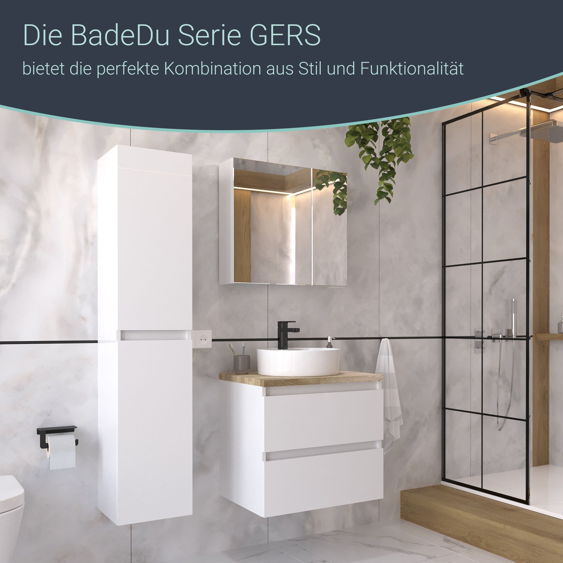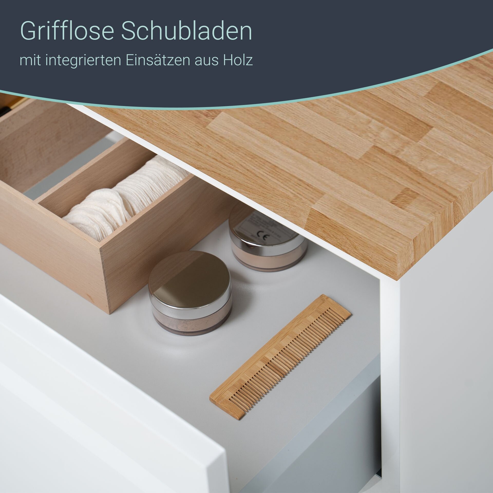 Eine runde Waschschüssel aus feiner weißer Keramik und eine 28 mm starke Waschtischplatte aus Eichenholz krönen das weiße, 2-teilige Badmöbelset aus der Serie GERS von BadeDu. Die Farbe Weiß vermittelt Badezimmern ein Gefühl von Sauberkeit und Frische. In Verbindung mit grifflosen Badmöbel entsteht ein minimalistisches, zeitloses Design. Farbwirkung und die Formensprache kommen effektiv zur Geltung. Das weiße, 60 cm breite 2-teilige Badmöbelset aus der Serie GERS von BadeDu überzeugt durch seine Zeitlosigkeit und Raffinesse. Kleinere Badezimmer sind mit diesem Set optimal ausgestattet. Zwei grifflose Schubladen bieten ausreichend Stauraum für Deine Badaccessoires. Ein Einsatz mit unterschiedlich großen Fächern aus Holz organisiert die kleinen Dinge, wie Lippenstift, Cremes, Makeup und andere Dinge für das tägliche Pflegeritual. So ist alles ordentlich aufgeräumt und immer griffbereit. Das Badmöbelset in seiner Kombination BADEDU GERS Waschbecken mit Unterschrank 60 cm breit, Weiß, Aufsatzwaschbecken Keramik Weiß, Waschtischplatte Braun hell erzeugt Wohlbefinden und Exklusivität.