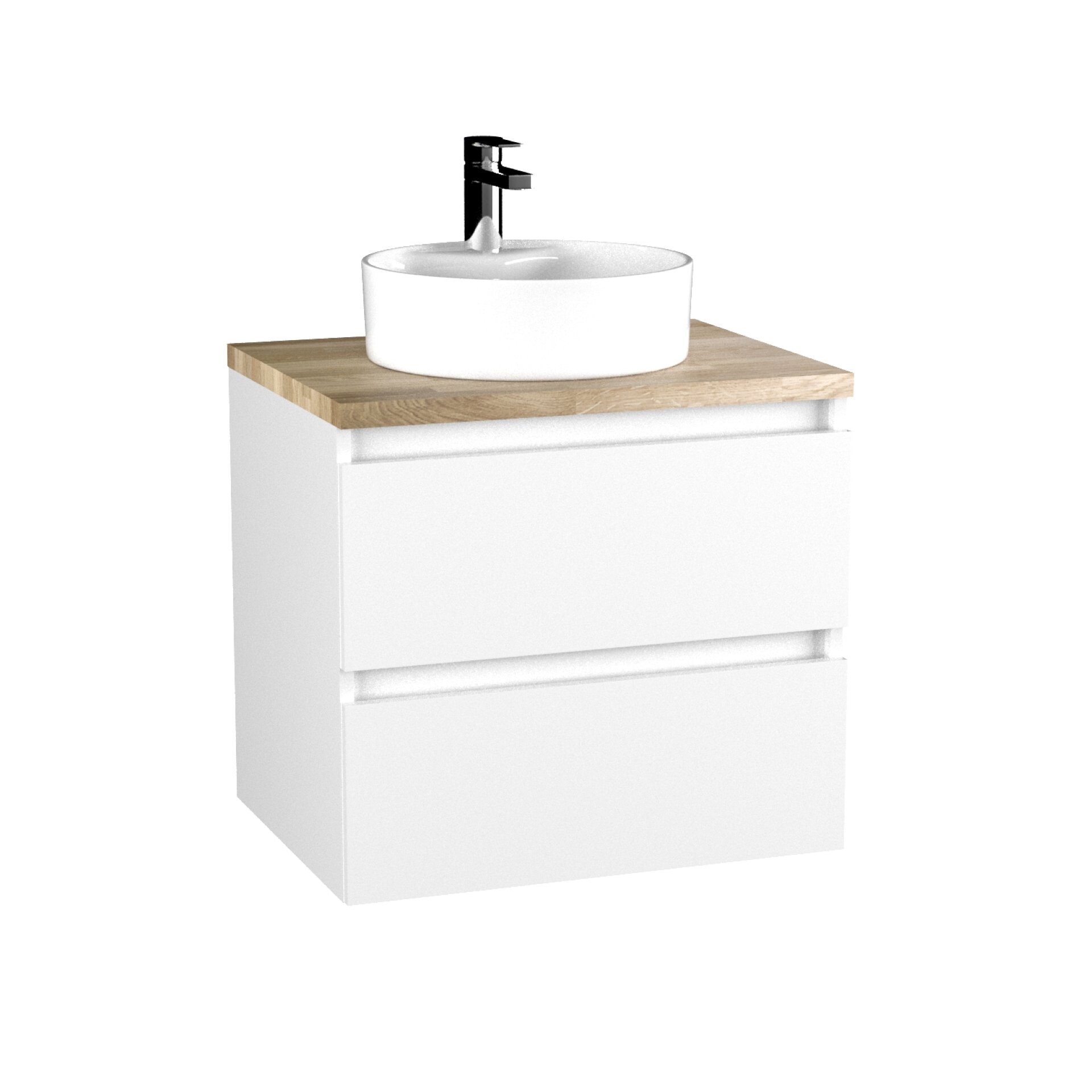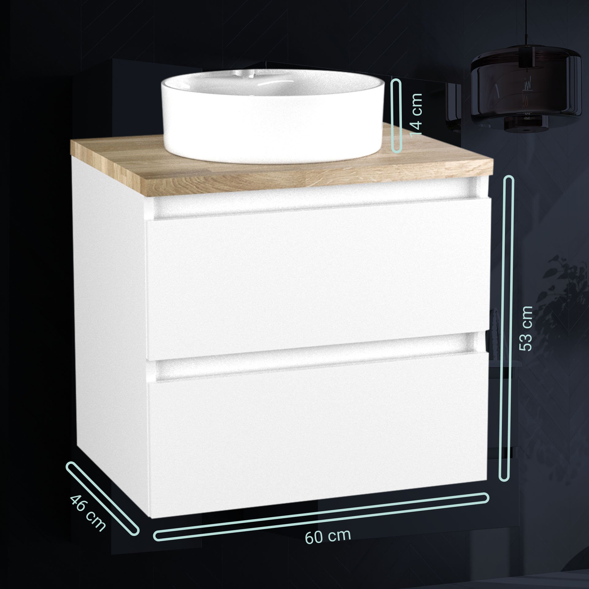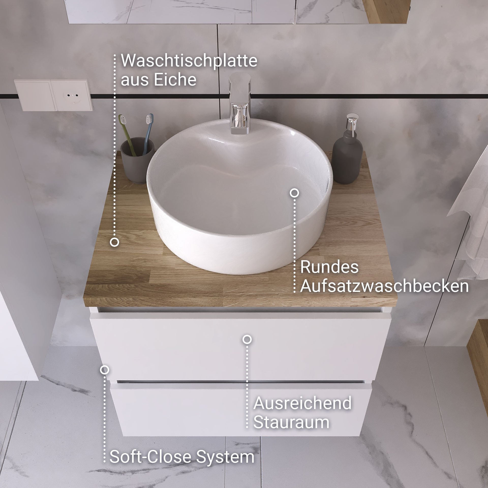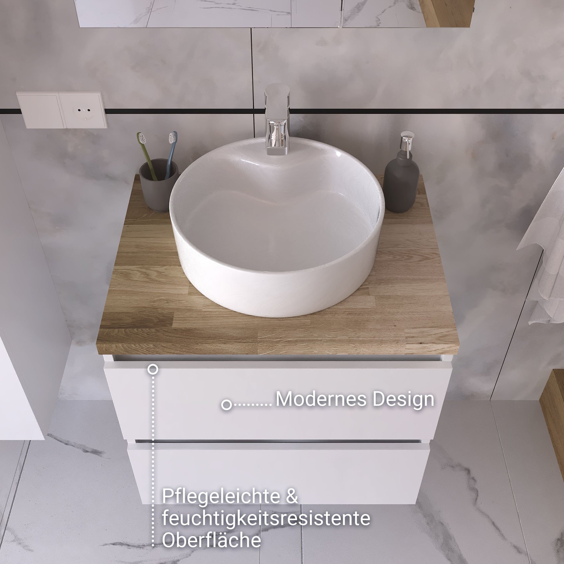 BadeDu GERS Waschbecken mit Unterschrank 60 cm breit, Weiß, Aufsatzwaschbecken Keramik Weiß, Waschtischplatte Braun hell