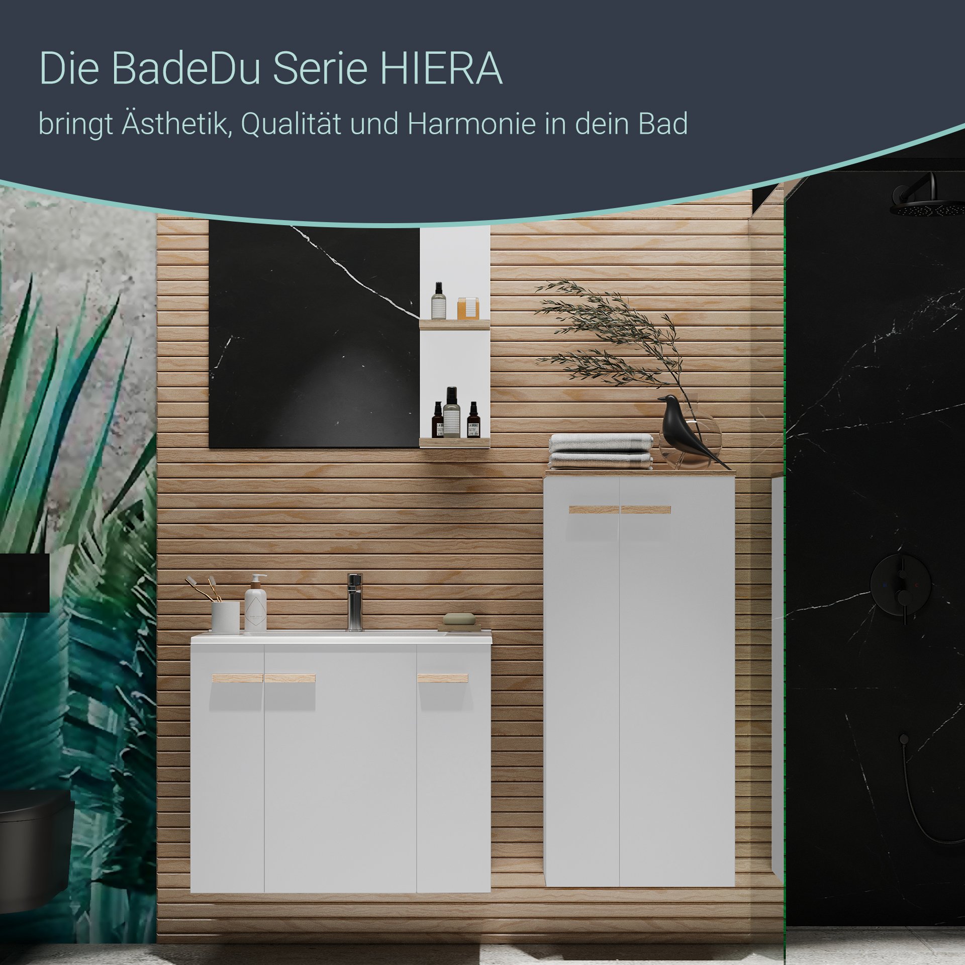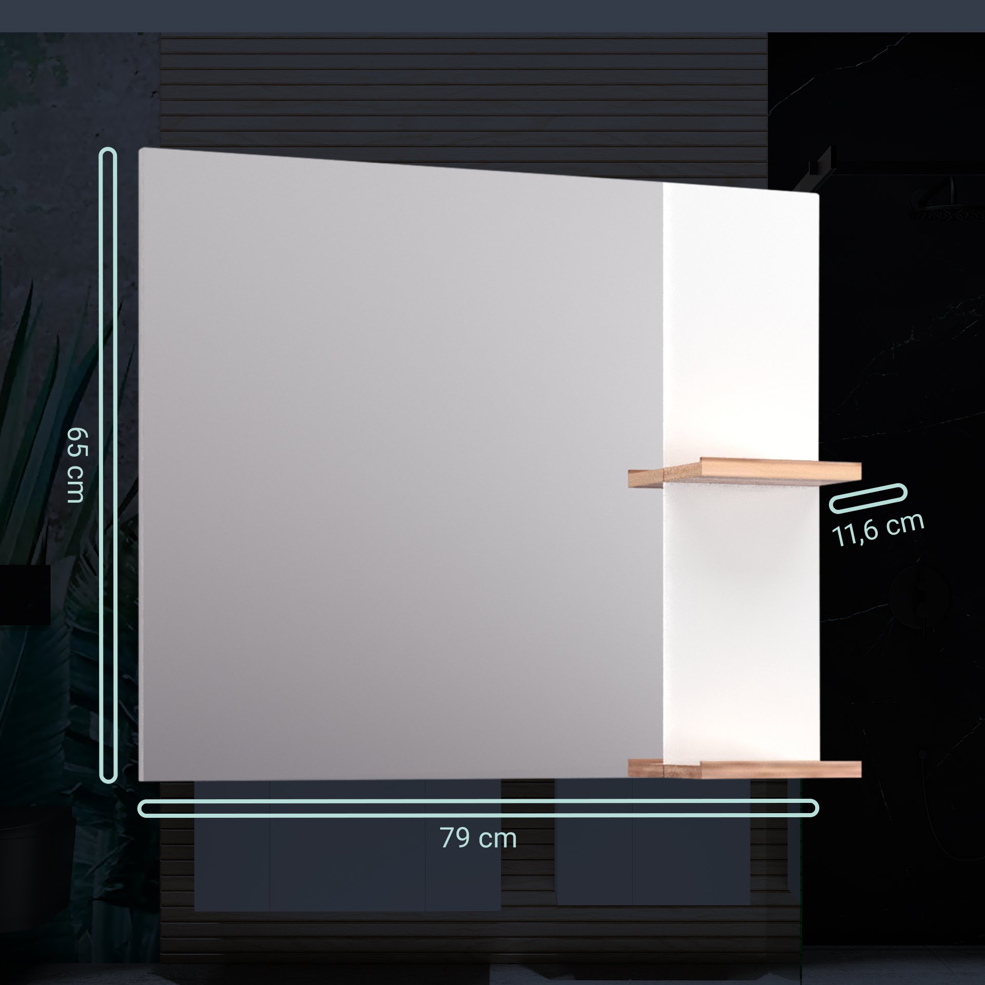 Hier findet Design und Alltag eine perfekte Harmonie - Der 79 cm breite BADEDU HIERA Spiegel mit einer weißen Seitenwand. Dieser Spiegel zeichnet sich durch seine klare Form und seine durchdachten Details aus. Auf Grund seiner Maße eignet sich der Badspiegel hervorragend für kleine Räume oder zur Vervollständigung eines Waschtischsets. Ein besonderes Highlight des Badezimmerspiegels mit Ablage sind die beiden offenen Fächer. Ein idealer Platz für Parfums oder dekorative Badaccessoires. Die Ablagen aus Holz setzen einen warmen, natürlichen Akzent zum klaren, reinen Weiß der Rückwand. Sie verleihen dem Spiegel eine wohnliche und moderne Ausstrahlung. Durch die Kombination aus Funktionalität und Design ist dieser Badspiegel mit Ablagen aus Holz nicht nur praktisch, sondern schafft eine warme Atmosphäre im Badezimmer. Der BADEDU HIERA Spiegel 79 cm breit, Weiß, zwei Ablagen ist mit der mitgelieferten Wandbefestigung schnell und sicher montiert.
