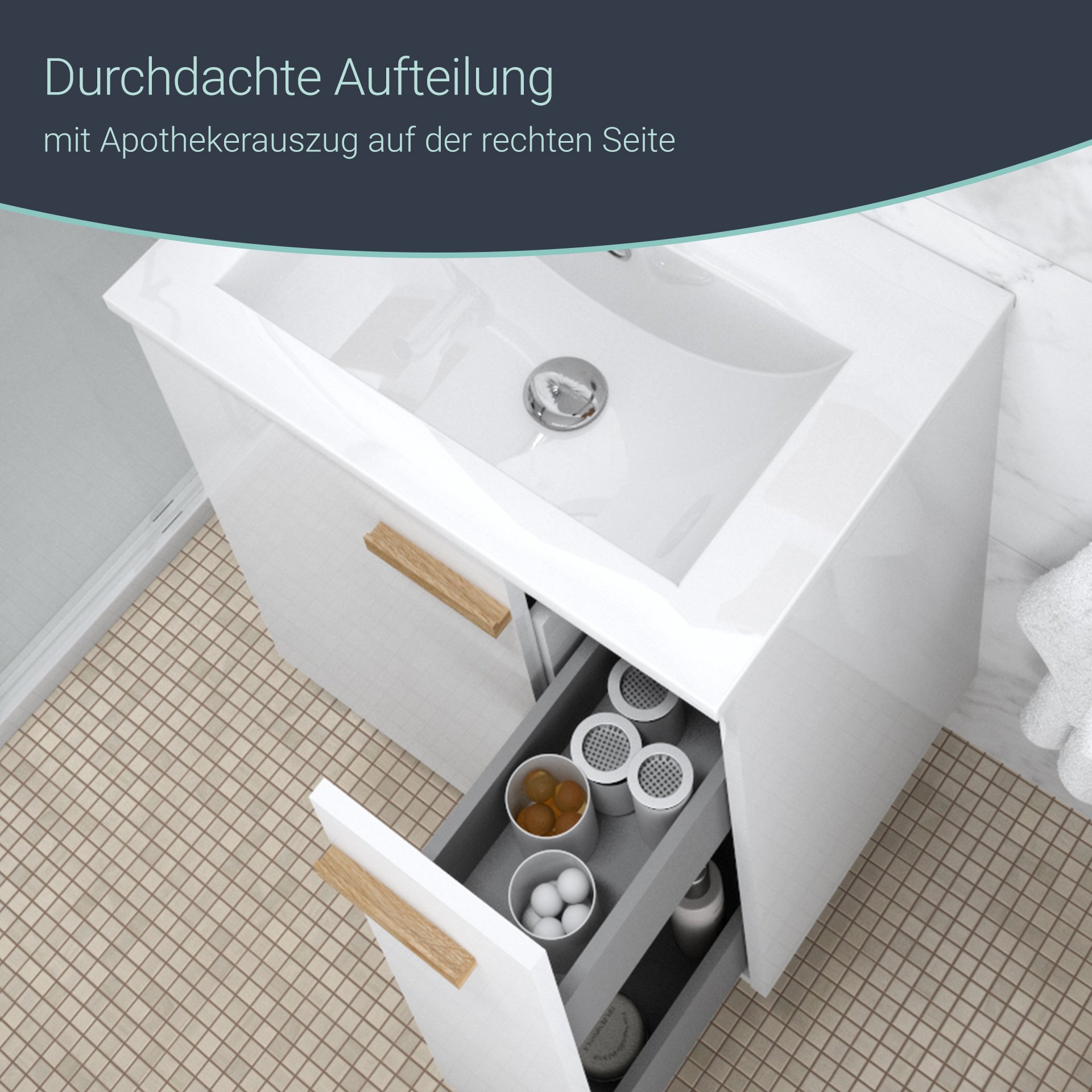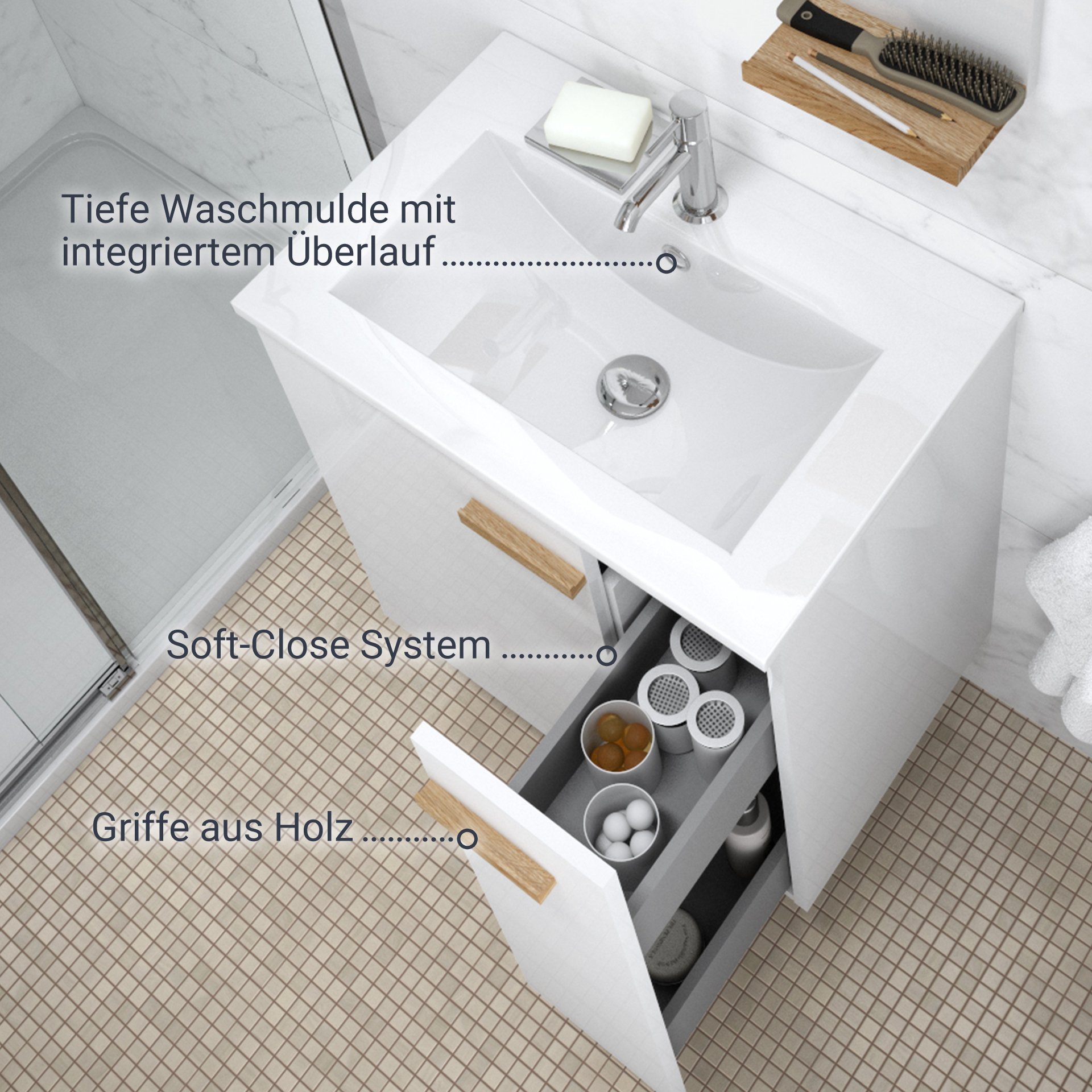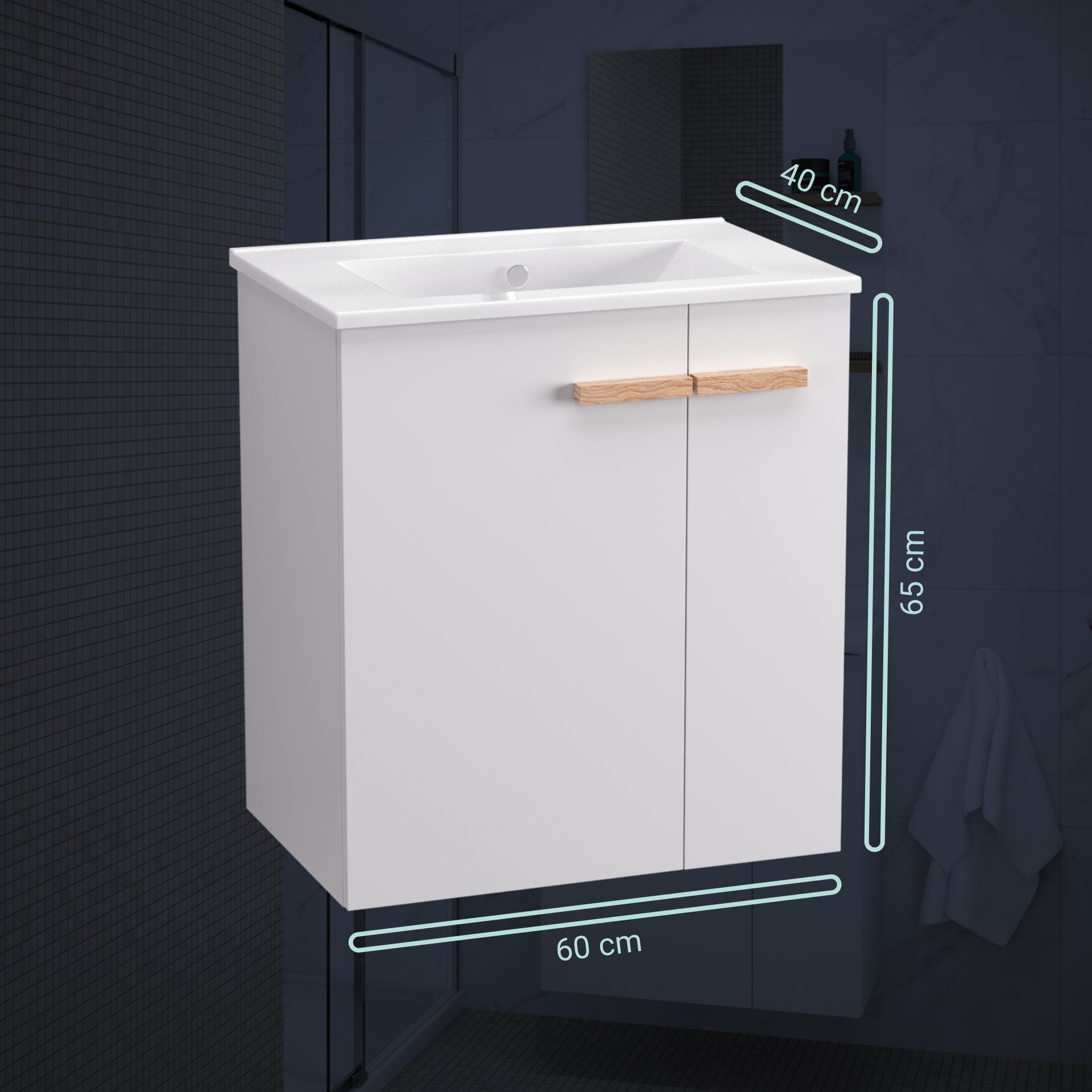 BadeDu HIERA Waschbecken mit Unterschrank 60 cm breit, Weiß, Waschbecken Keramik Weiß
