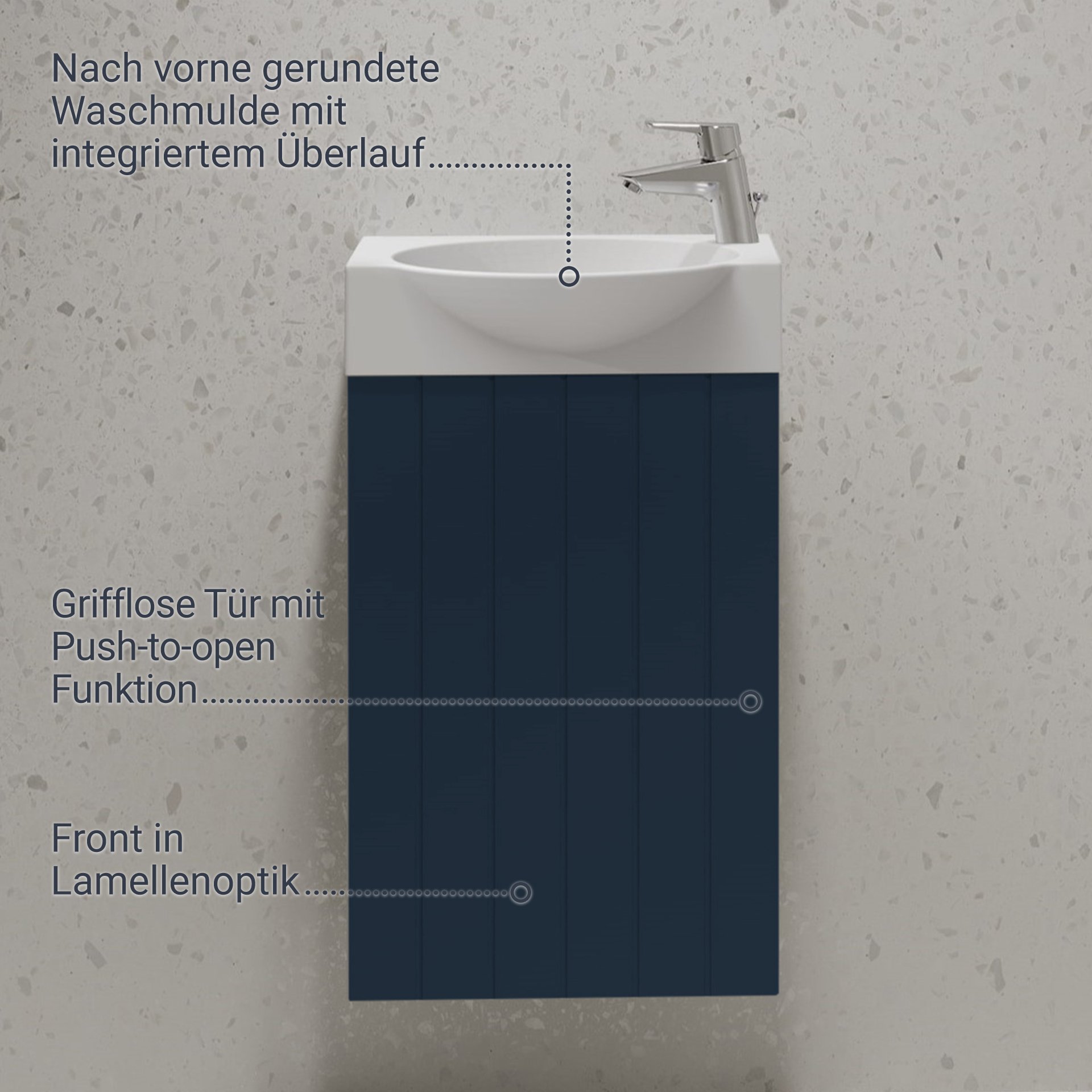 Eine Rhapsodie in Blue - elegant und harmonisch! Das vermittelt das zweiteilige Gäste WC Set aus der Serie IMPERO von BadeDu. Dieses 40 cm breite Badmöbel Set in Navy Blue ist ein stilvolles Ensemble mit beruhigender Wirkung. Hochwertige Materialien und funktionales Design sind ein Statement für kreative Bäder. Mit dem dunklen, satten Blau des Waschtischunterschranks zieht ein modernes Farbgefühl in Dein Badezimmer. Die dunkle Nuance steht für Stilbewusstsein und vermittelt Ruhe verbunden mit einem modernen Farbgefühl. Dieser edle Farbton lässt sich wunderbar mit Weiß, Naturmaterialien und Accessoires in Messing oder Chrom kombinieren. Kein Griff stört die Optik. So kommen Farbe und Form optimal zur Geltung. Mit der Push-to-Open Funktion gestaltet sich das Öffnen der Tür sehr komfortabel. Im Innenraum des Schranks sorgt ein Einlegeboden für eine sinnvolle Unterteilung. All Deine Badaccessoires sind im 40 cm breiten Waschbeckenunterschrank ordentlich verstaut und immer griffbereit. Ein exquisites Farbspiel entsteht mit dem glänzend weißen Waschbecken aus Gussmarmor. Das formvollendete Waschbecken mit einer runden Waschmulde ist besonders pflegeleicht. Es zeichnet sich durch einen integrierten Überlauf und der Hahnlochbohrung auf der rechten Seite des Beckens aus. Das BADEDU IMPERO Gäste WC Waschtisch Set 40 cm breit, Blau, Waschbecken Keramik Weiß ist zerlegt und wird mit einer leicht verständlichen Aufbauanleitung zu Dir nach Hause geliefert. Mit diesem zweiteiligen Badmöbel Set in edlem Navy Blue schaffst Du Dir in kleinen Bädern eine entspannte Wohlfühlatmosphäre mit WOW-Effekt.