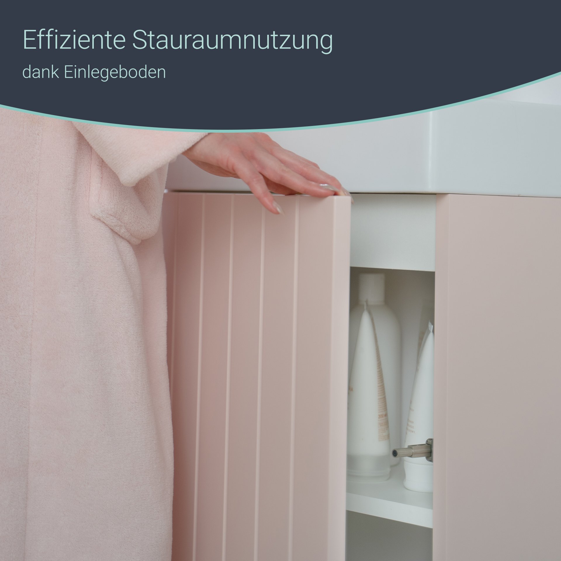 Die Trendfarbe Powder Pink in semi matt verleiht Deinem Gäste Bad eine außergewöhnlich, harmonische Wirkung. Das zweiteilige Gäste WC Set aus der Serie IMPERO von BadeDu wirkt durch seine Farbgebung beruhigend, warm und stilvoll. Ein ästhetischer Blickfang und eine moderne Alternative zu klassischen Badfarben. Um der Optik freien Raum zur Wirkung zu geben, wurde auf Griffe verzichtet. Mit einen leichten Druck öffnet sich die Tür auf Grund der modernen Push-to-Open Mechanik. Im Innenraum unterteilt ein Einlegeboden den Schrank praktisch. Das sorgt für Ordnung und Übersichtlichkeit bei all Deinen Badaccessoires. Die perfekte Harmonie bildet das weiße Waschbecken aus Gussmarmor, welches passgenau auf dem Waschtischunterschrank in zartem Rosa sitzt. Gussmarmor ist leicht, sehr pflegeleicht und langlebig. Eine gewölbte Waschmulde sorgt dafür, dass Wasserspritzer dort bleiben, wo sie hingehören. So vermittelt das Badmöbelset von BadeDu ein elegantes, modernes Bild mit Charakter und Persönlichkeit. Das BADEDU IMPERO Gäste WC Waschtisch Set 40 cm breit, Rosa, Waschbecken Keramik Weiß ist zerlegt und wird mit einer leicht verständlichen Aufbauanleitung zu Dir nach Hause geliefert. Mit diesem zweiteiligen Badmöbel Set im harmonischen Farbton Powder Pink schaffst Du Dir in kleinen Bädern eine entspannende Wohlfühlatmosphäre mit WOW-Effekt.