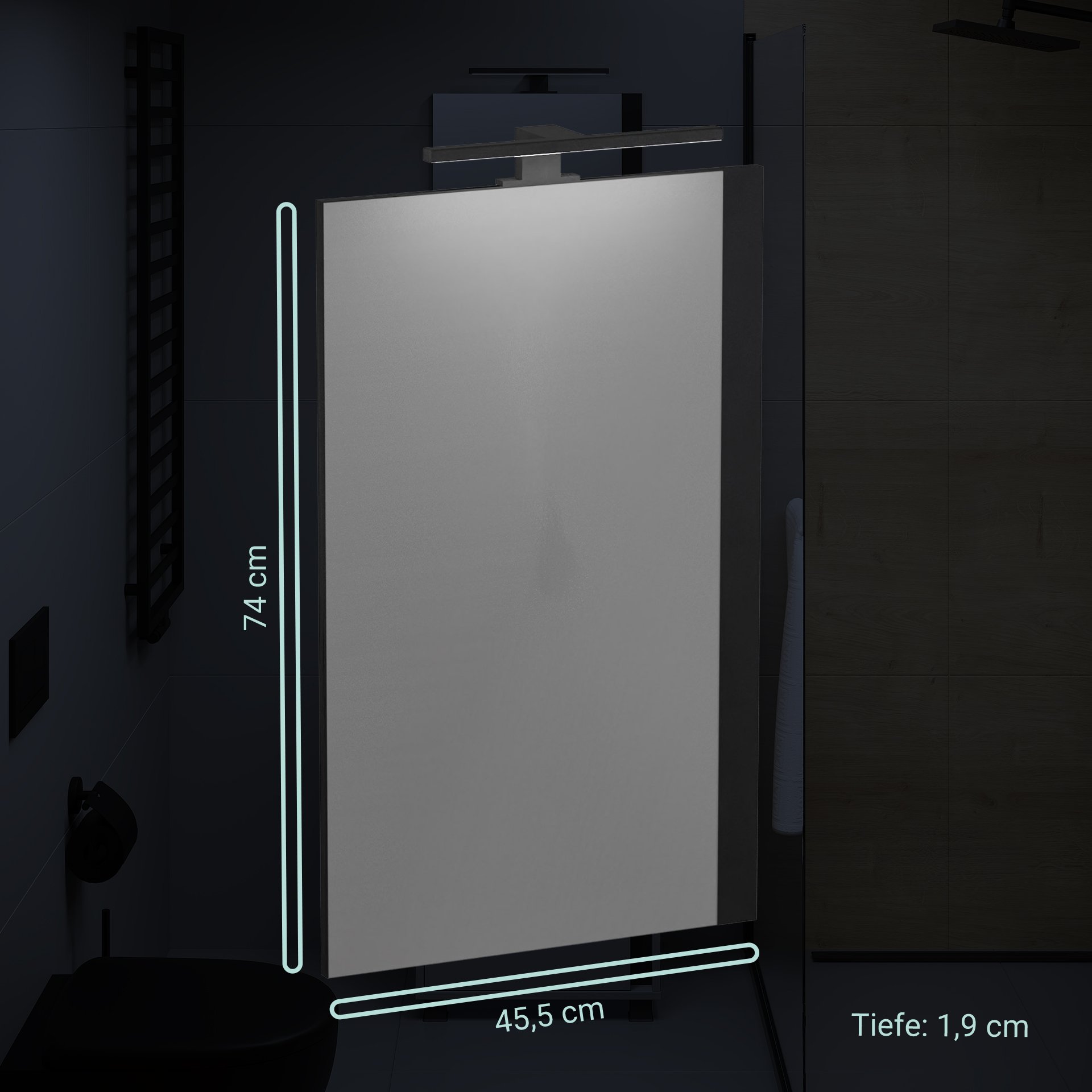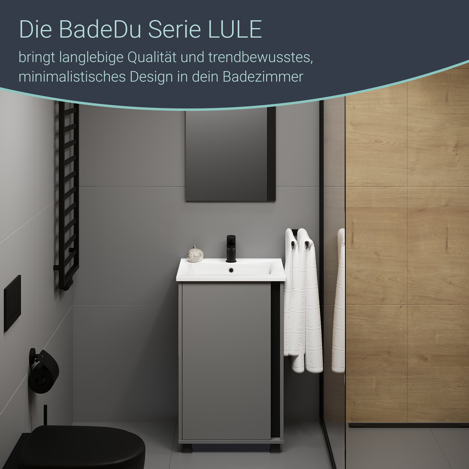 Du suchst einen Spiegel, der sich harmonisch in jedes moderne Bad einfügt und gezielt Akzente setzt? Dann ist der 45 cm breite Spiegel von BadeDu genau die richtige Wahl. Die schwarze Blende des Spiegels aus der Serie LULE von BadeDu verleiht jedem Raum Tiefe und Charakter. Sie ist wahlweise auf der rechten oder linken Seite zu montieren und vermittelt eine klare, grafische Struktur. So wird das Design der Waschtischunterschränke aus der Serie LULE gekonnt unterstützt. Auch hier ist neben der individuellen Farbgebung die senkrechte schwarze Blende ein bestimmendes Designelement. In Verbindung mit Keramikwaschbecken, Waschtischunterschrank und Spiegel aus der Serie LULE entsteht ein stimmiges, modernes Ensemble, das durch Geradlinigkeit und Ästhetik überzeugt. Der Spiegel hat eine Breite von 45, 5 cm und eine Höhe von 74 cm. Damit ist er perfekt für kleinere Bäder geeignet, die bewusst auf stimmiges Design mit passenden Proportionen setzen. An der sicheren und stabilen Aufhängevorrichtung ist der klassische Spiegel schnell und einfach im Bad integriert. Optional ist die LED-Leuchte in Chrom oder Schwarz. Sie leuchtet perfekt den Spiegel aus und taucht den Raum in ein stimmiges Lichtspiel. Besonders beeindruckend in Kombination mit den Oberflächen der Waschtischunterschränke in Evoke Eiche, Chinchilla Grau und Hochglanz Weiß. Der BADEDU LULE Spiegel 45,5 cm breit wird sicher verpackt direkt zu Dir nach Hause geliefert.