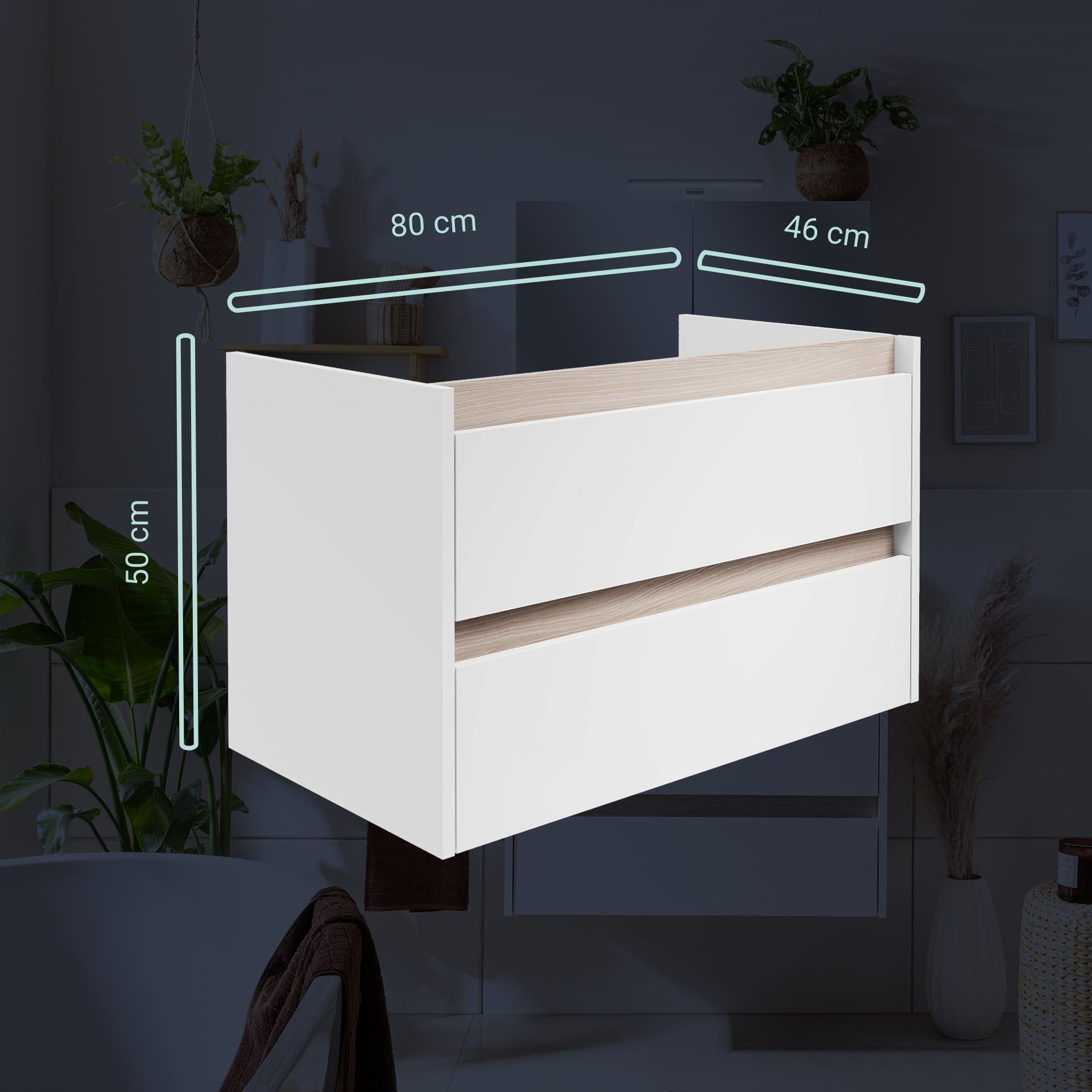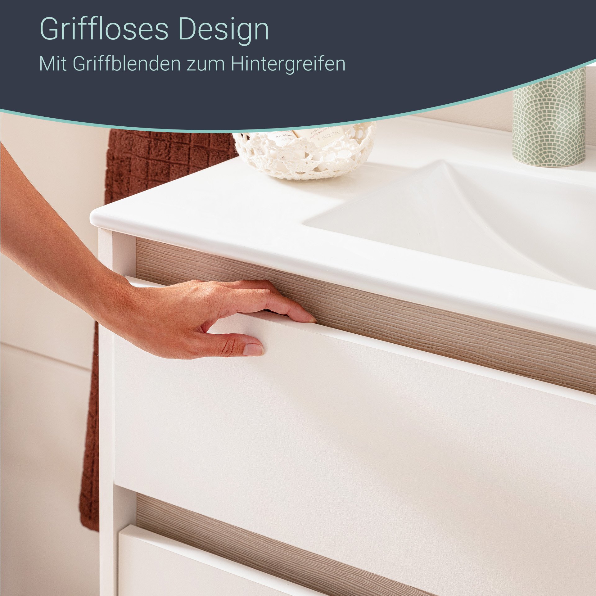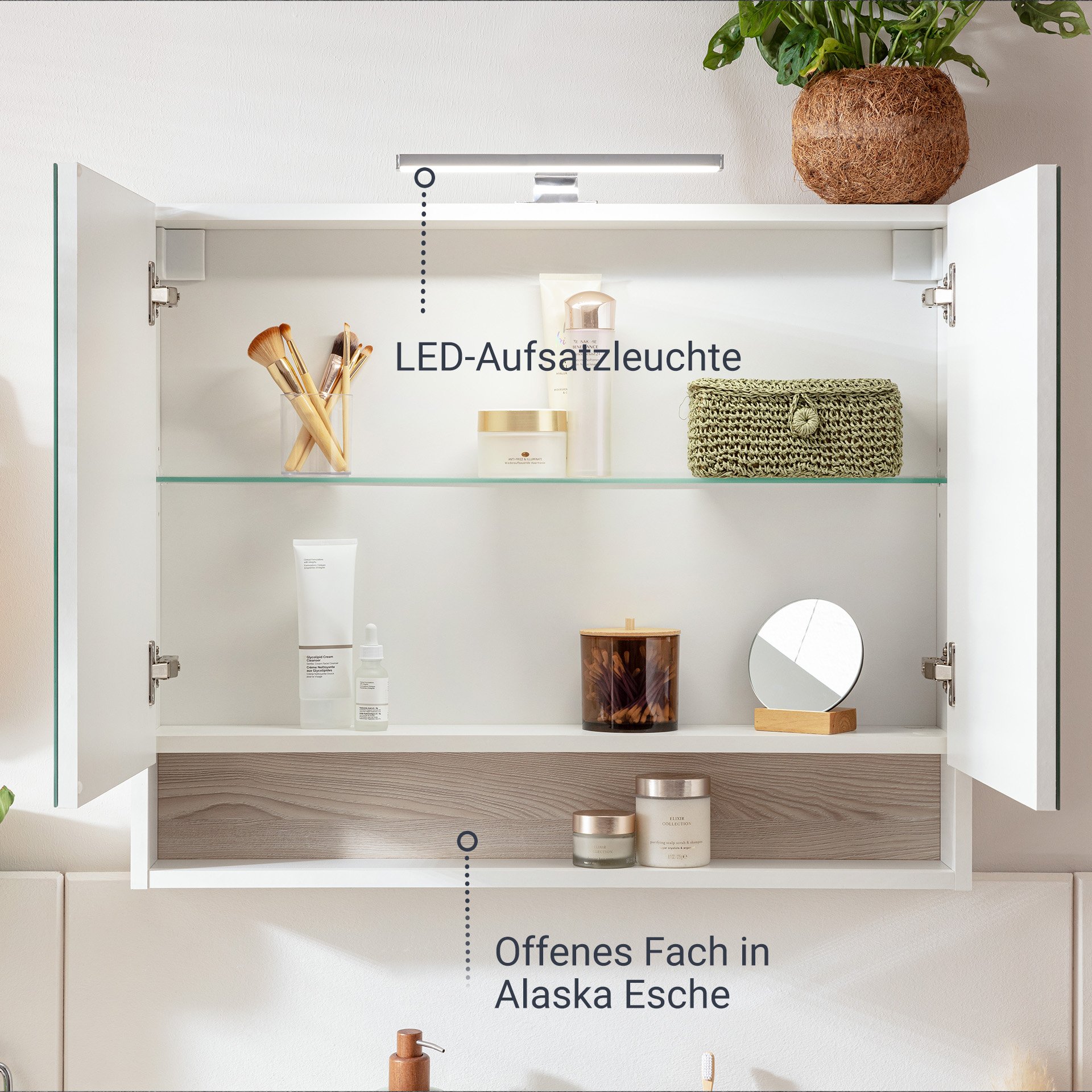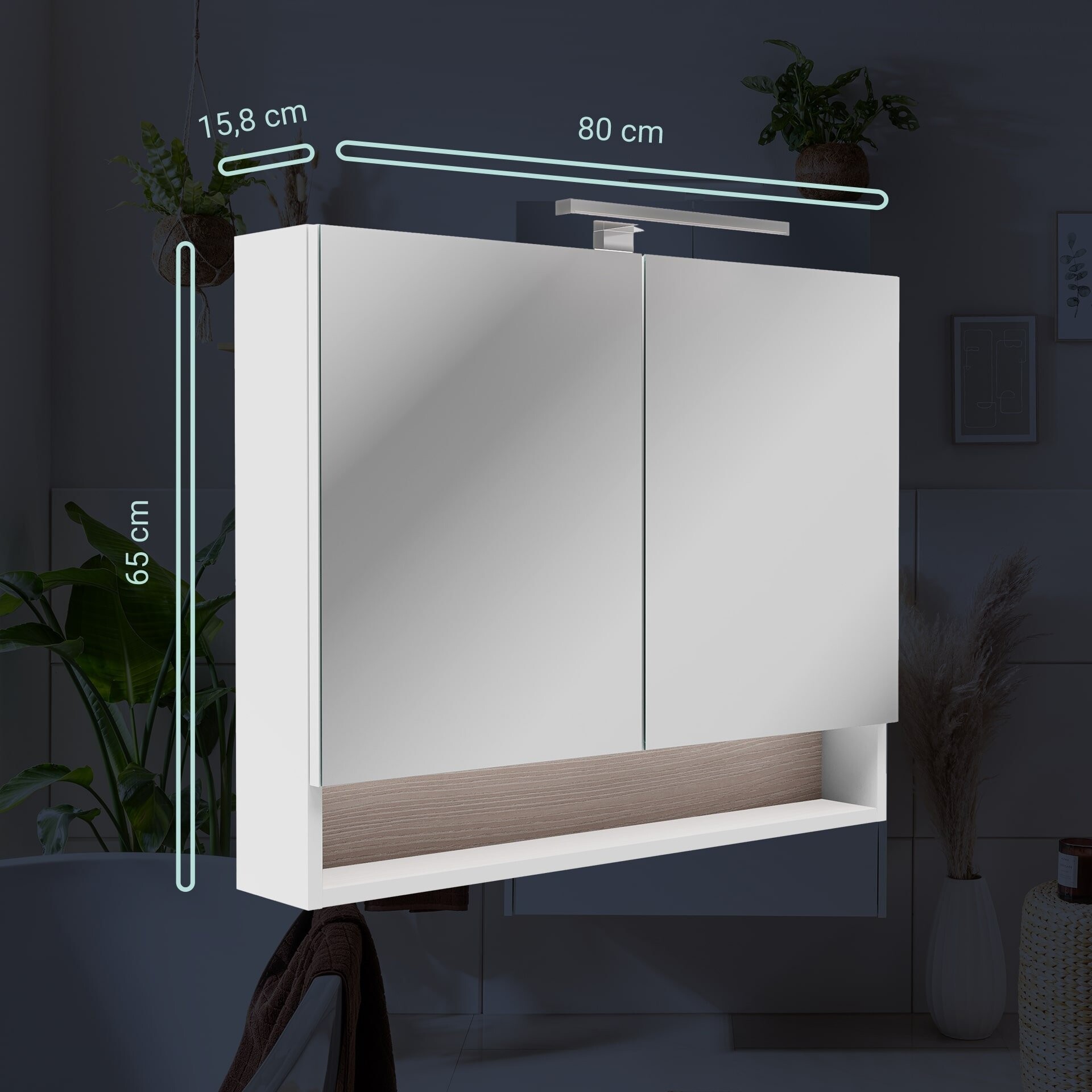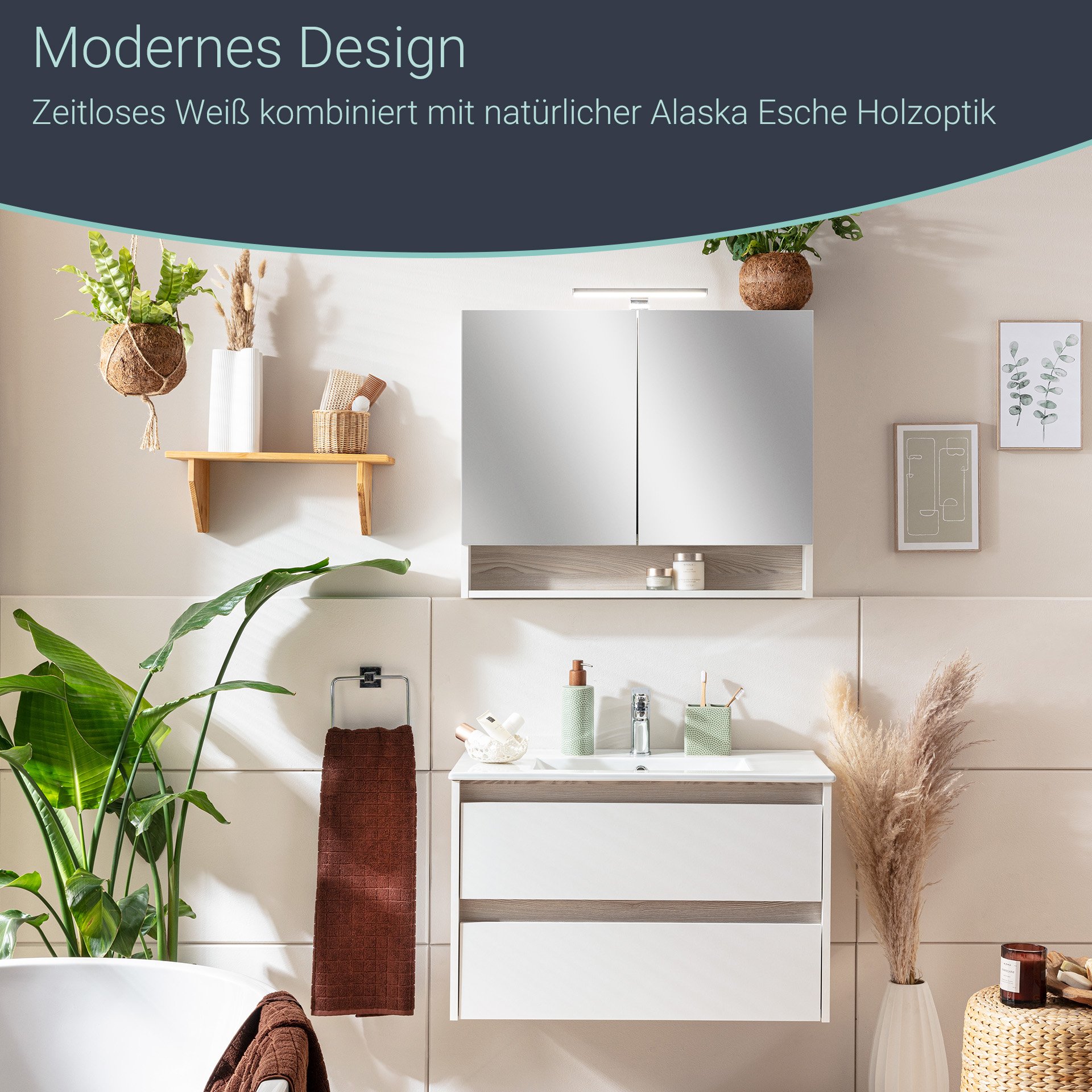 BadeDu OKA Waschtisch Set mit Spiegelschrank 81 cm breit, Weiß/Braun, Waschbecken Keramik Weiß + LED Aufsatzleuchte