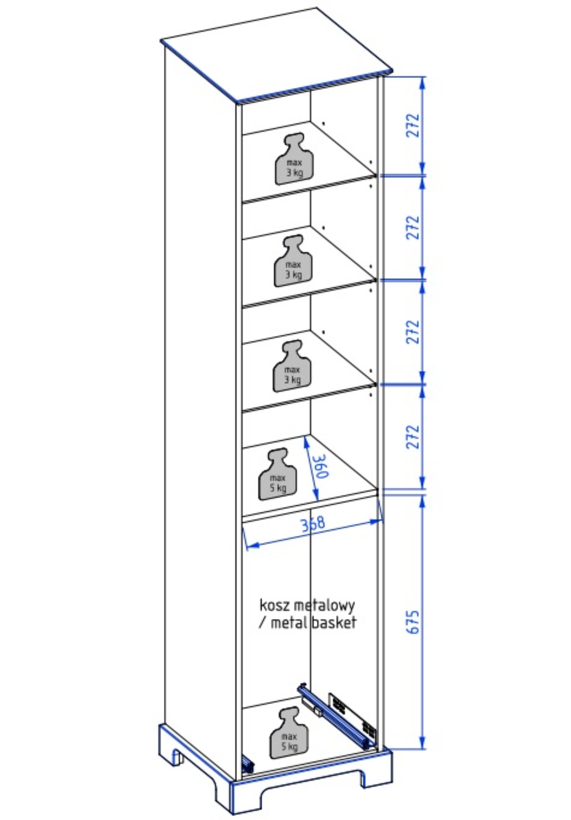 - Ausstattung: 3 Glaseinlegeböden, 1 Tür, 1 Auszug mit Wäschekorb