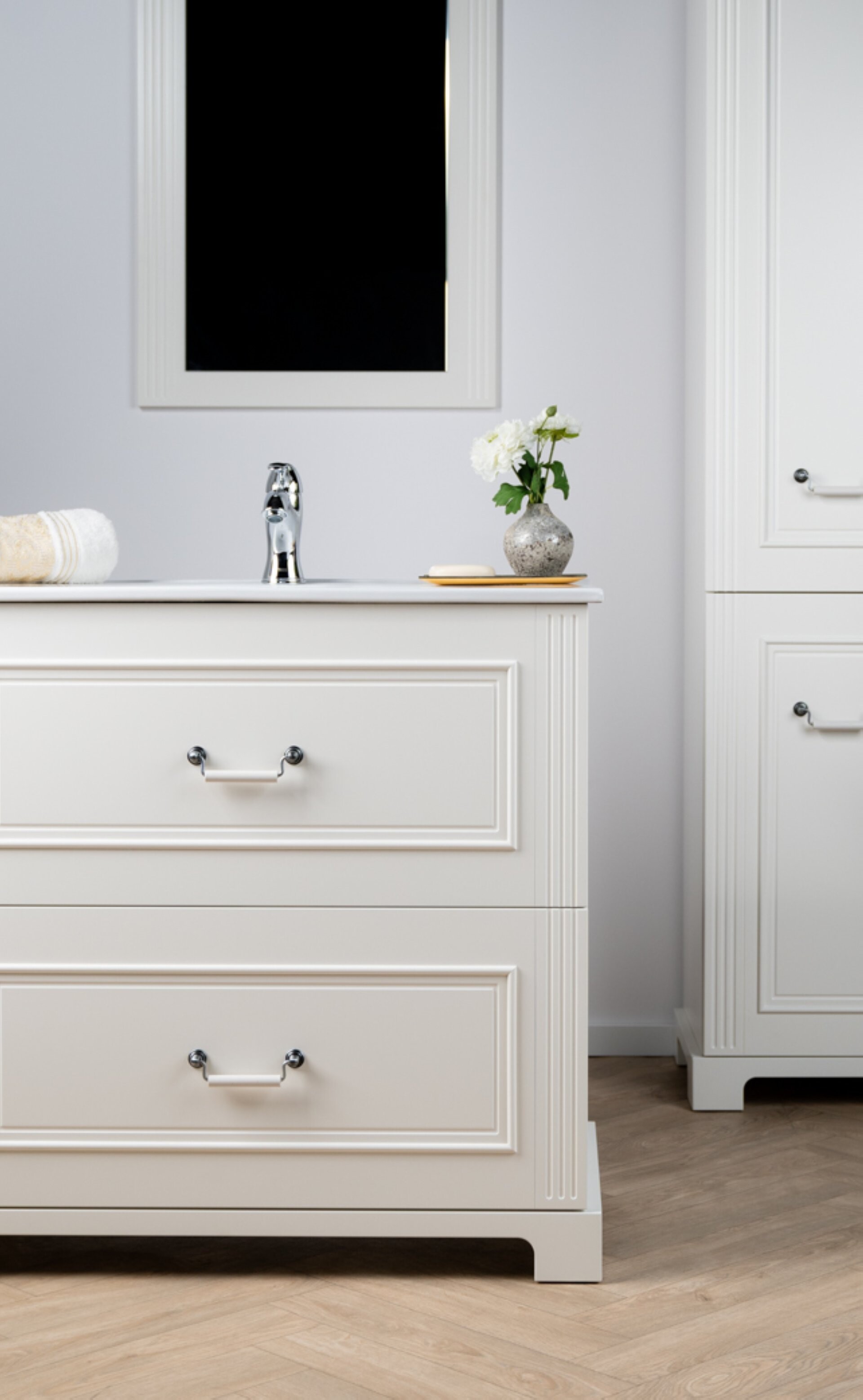 Mit dem BadeDu RILA Spiegel mit einer Breite von 60 cm holst Du Dir den modernen Landhausstil in Dein Bad. Das zeitlose, edle Weiß matt bringt Harmonie und Eleganz in Dein Badezimmer. Da der BadeDu RILA Spiegel Weiß matt unbeleuchtet ist, eröffnen sich vielfältige Gestaltungsmöglichkeiten. Den rechteckigen Badspiegel kannst Du mit Pendel-, Wand- oder LED-Leuchten gekonnt in Szene setzen. So entstehen individuelle Lichtakzente, die Dein tägliches Pflegeritual begleiten. Sein profilierter Rahmen aus Holz greift die typische Linienführung der modernen Landhaus Badmöbel auf. So entsteht ein stimmiges Gesamtbild, das für entspannte Momente im Bad sorgt. Die matte weiße Oberfläche des Rahmens reflektiert das Licht sanft und lässt Dein Spiegelbild weich und natürlich erscheinen. Der Spiegel macht als Solist ebenso Eindruck, wie auch als Ergänzung zu einem Waschplatz aus der Serie RILA in der gleichen Breite. Lass Deiner Kreativität freien Lauf. Der BADEDU RILA Spiegel 60 cm breit, Weiß matt wird mit Wandbefestigung geliefert und ist damit schnell montiert. Er vermittelt in Deinem zu Hause eine stilvolle Atmosphäre, die den Charme skandinavischer Badezimmermöbel mit der Wertigkeit klassischer Badezimmermöbel verbindet.