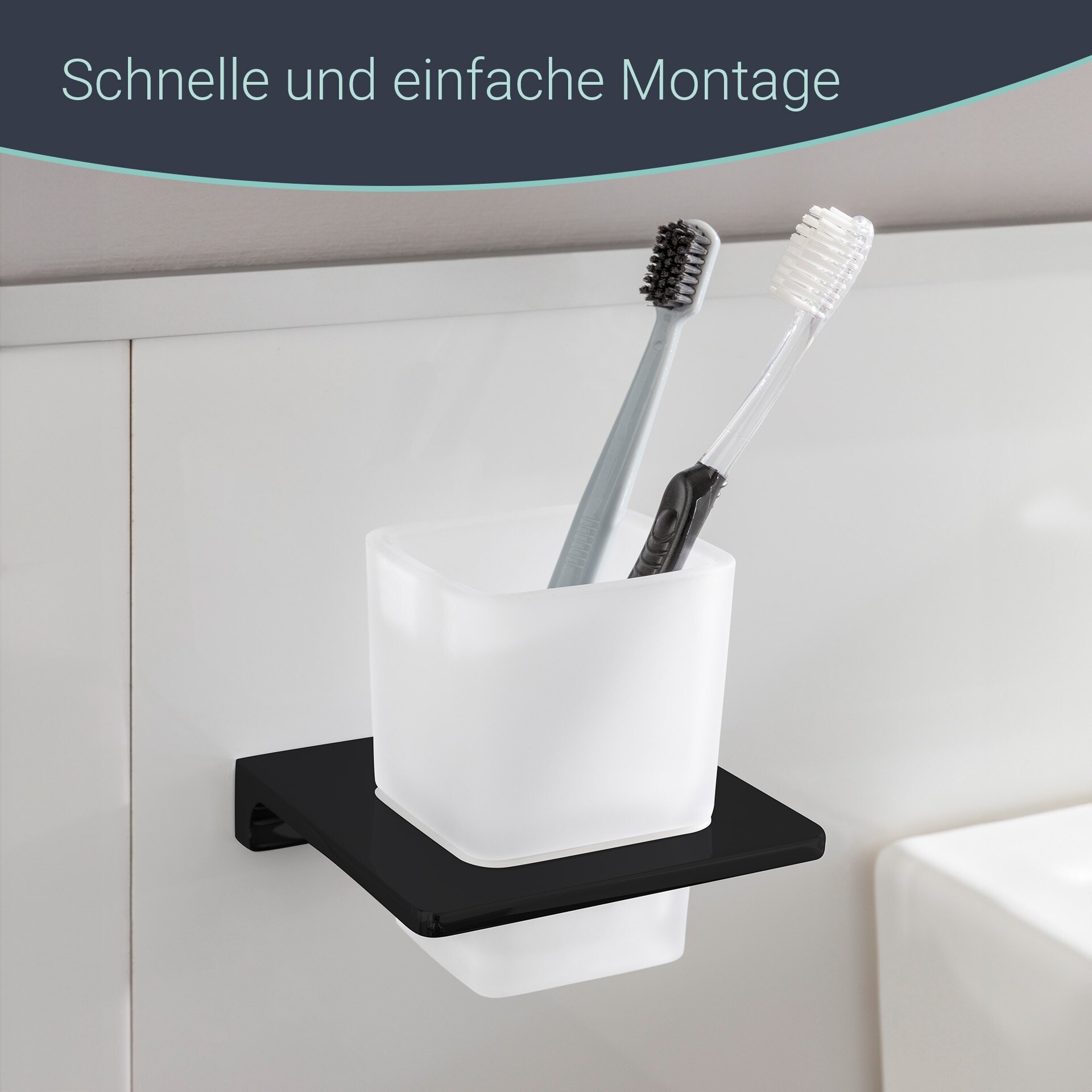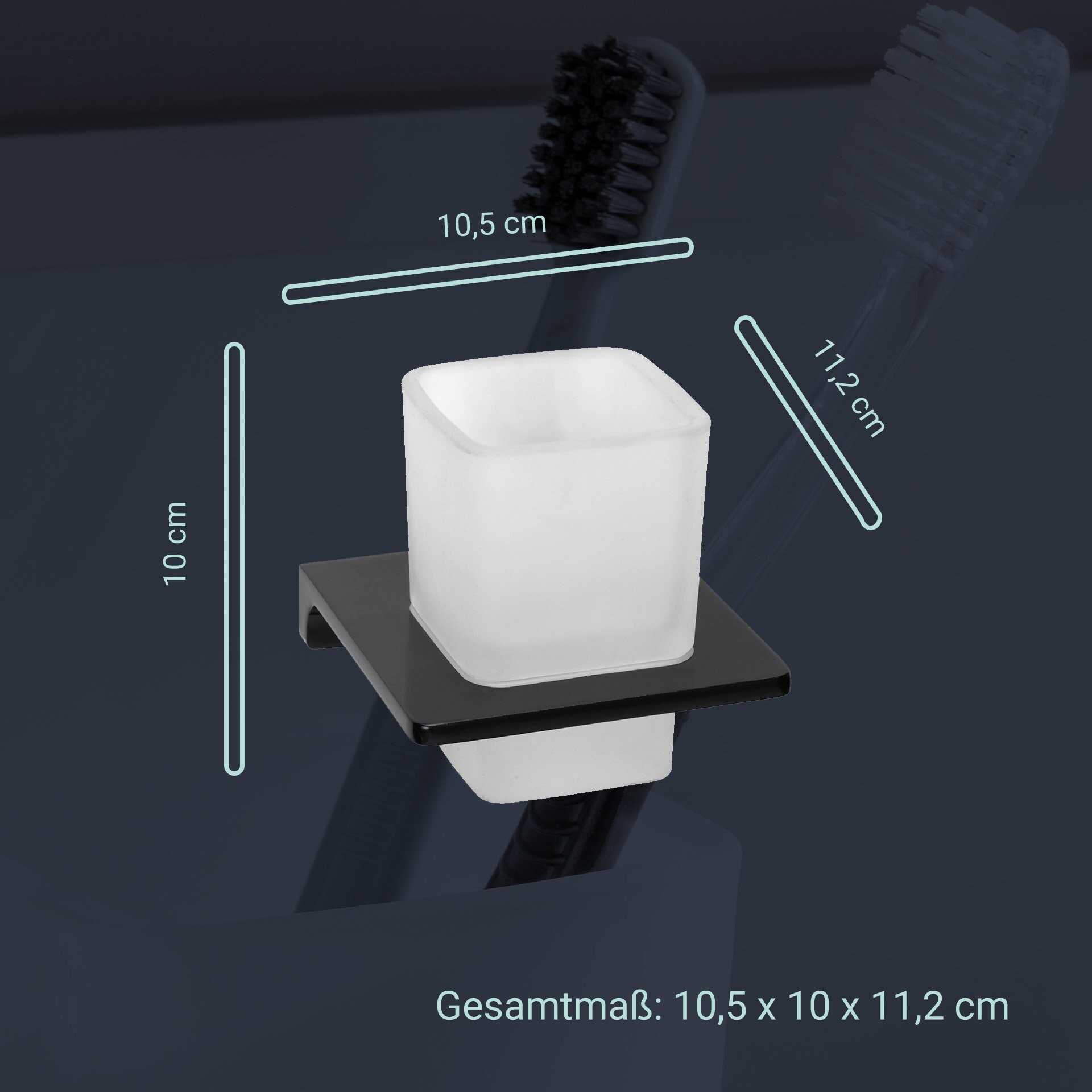 Mit dem SIRIUS Zahnputzbecher aus satiniertem Glas und matt schwarzer Halterung der Firma BadeDu wertest Du Dein Badezimmer nicht nur optisch, sondern auch funktional auf. Du kannst Deine Zahnbürste und Zahnpasta darin aufbewahren. Es entsteht Ordnung rund ums Waschbecken. Langlebigkeit durch exquisite Metallausführung garantiert. Zur Reinigung einfach den Becher aus der Halterung nehmen. Mit dem hochwertigen Montagematerial ist der BadeDu SIRIUS Glas mit Halter Schwarz matt sicher und stabil an der Wand befestigt.