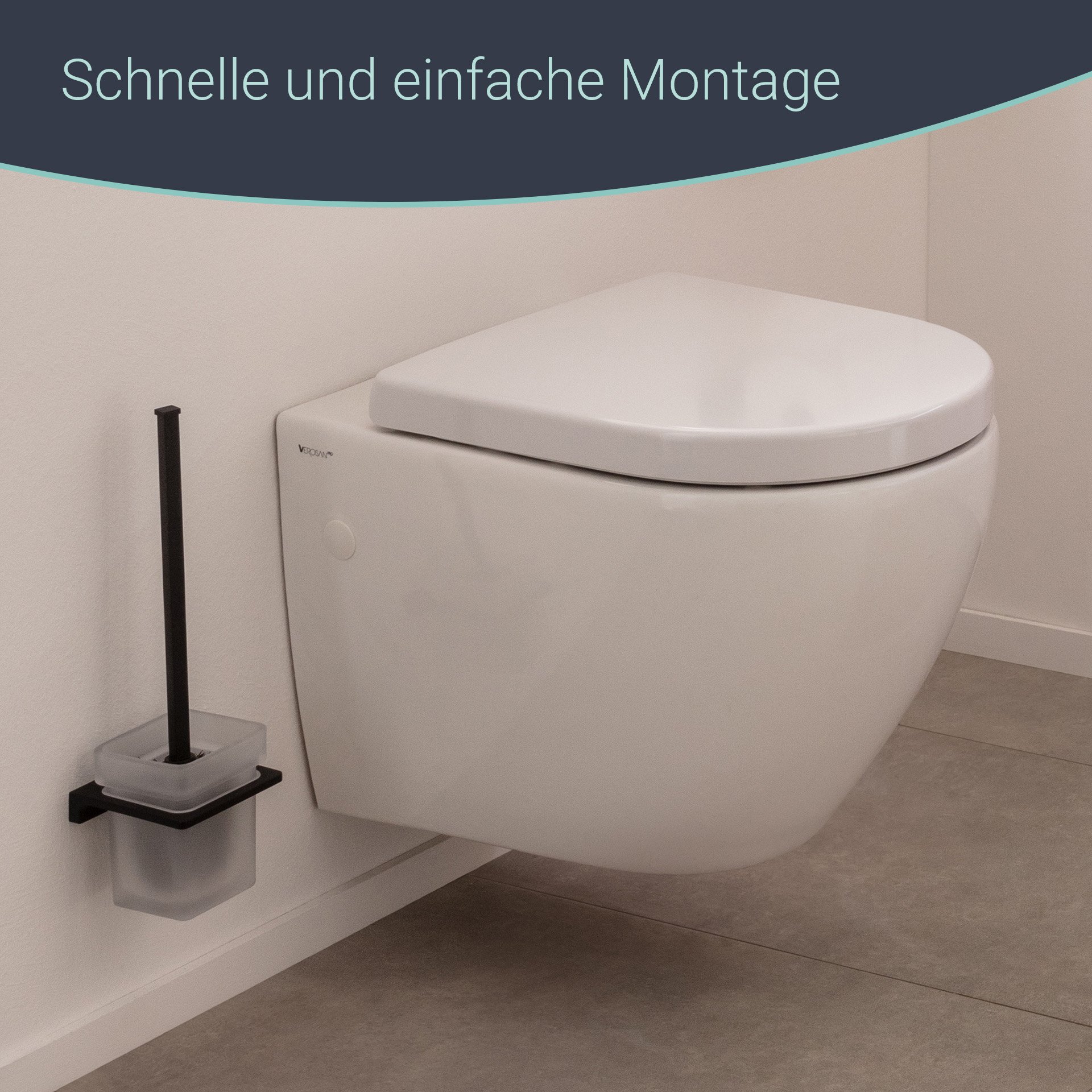 Diese exklusive Toilettenbürste mit Halter in mattem Schwarz von BadeDu lässt keine Wünsche offen. Durch die geschwungene Linienführung von Halterung und Glasschale strahlt das Badaccessoires Leichtigkeit aus. Die quadratische Schale aus mattiertem Glas kannst Du zum Reinigen ganz einfach aus der schwarzen Halterung nehmen. Passend im Design ist die Toilettenbürste mit starken Borsten für eine effektive Reinigung. Und sollten die Borsten mal verschlissen sein, einfach das Unterteil von der viereckigen Stange lösen und durch ein Neues ersetzen. Mit dem hochwertigen Montagematerial bist Du sicher, dass alles perfekt, stabil und sicher an der Wand befestigt ist.