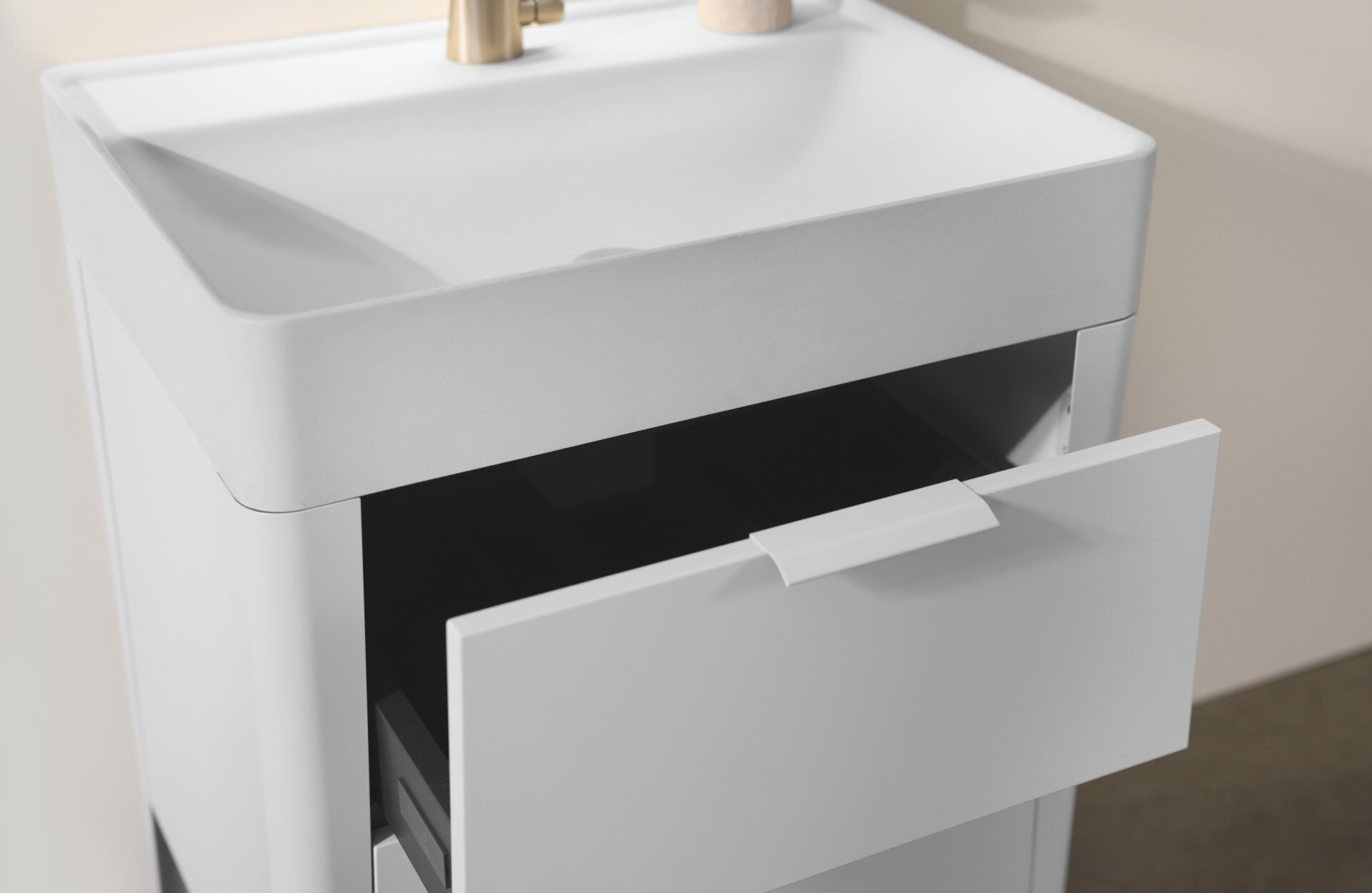 Organische Formen prägen das 60 cm breite 2-teilige Badmöbelset in mattem Weiß aus der Serie SORA von BadeDu. Vier filigrane Metallfüße aus Aluminium tragen die Kombination aus Waschbecken und Unterschrank mit einer Leichtigkeit, die sofort ins Auge fällt. Die vier Füße aus Metall verjüngen sich nach unten und greifen die Linienführung des Waschbeckens auf. So entsteht ein formvollendetes Spiel aus Stabilität und Eleganz in Deinem Badezimmer. Inspiriert wurden die Designer vom Midcentury Design mit feinen Anklängen aus dem Industrial Style. Der Waschbeckenunterschrank ist mit zwei großräumigen Schubladen ausgestattet. Sanftes Schließen ist durch das moderne Soft-Close-System gesichert. In der oberen Schublade befindet sich ein Organizer, der Deine kleinen Kosmetikartikel ordnet. Lippenstift, Eyeliner und andere Dinge für das tägliche Pflegeritual sind hier immer ordentlich aufgeräumt und griffbereit. Zwei Metallgriffe in Frontfarbe fügen sich dezent in das Design ein. Sie unterstreichen die ruhige, klare Ausstrahlung des Möbels. Formvollendet sitzt das weiße Waschbecken aus edlem Quarzkomposit auf dem Unterschrank. Komfortabel ist die tiefe und breite Waschmulde, die Wasserspritzer dort lässt, wo sie hingehören. Edel wirkt die samtig-matte Oberfläche des Waschbeckens. Durch seine präzise Verarbeitung vereint der moderne Waschtisch Langlebigkeit mit Pflegeleichtigkeit stilvoll. Das BADEDU SORA Waschbecken mit Unterschrank 60 cm breit, Weiß matt, Waschbecken Quarzkomposit Weiß, aus Aluminium, mit Füßen überzeugt mit seiner reduzierten Formensprache und den Metallakzenten. Mit diesem vormontierten 2-teiligen Badmöbelset entsteht in Deinem Bad ein Ort der Ruhe und Leichtigkeit, der ein modernes Lebensgefühl vermittelt.