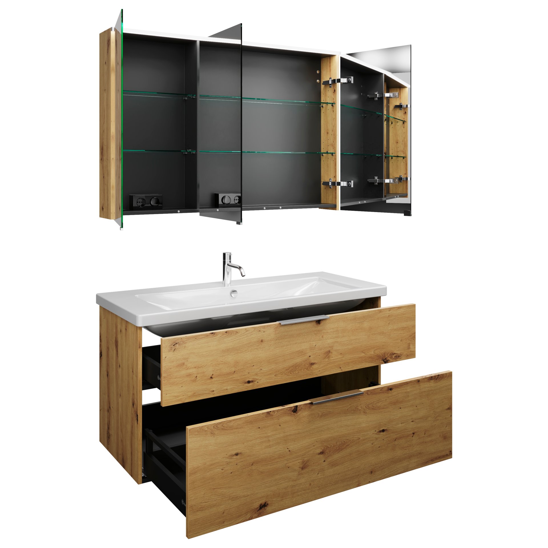 - Ausstattung: 3 Türen mit Innenspiegel, 2 Glaseinlegeböden, Schalter- und Steckdosenelement, LED Aufsatzleuchte (1 x 11,3 W, neutralweiß, IP24, 4250 Kelvin)