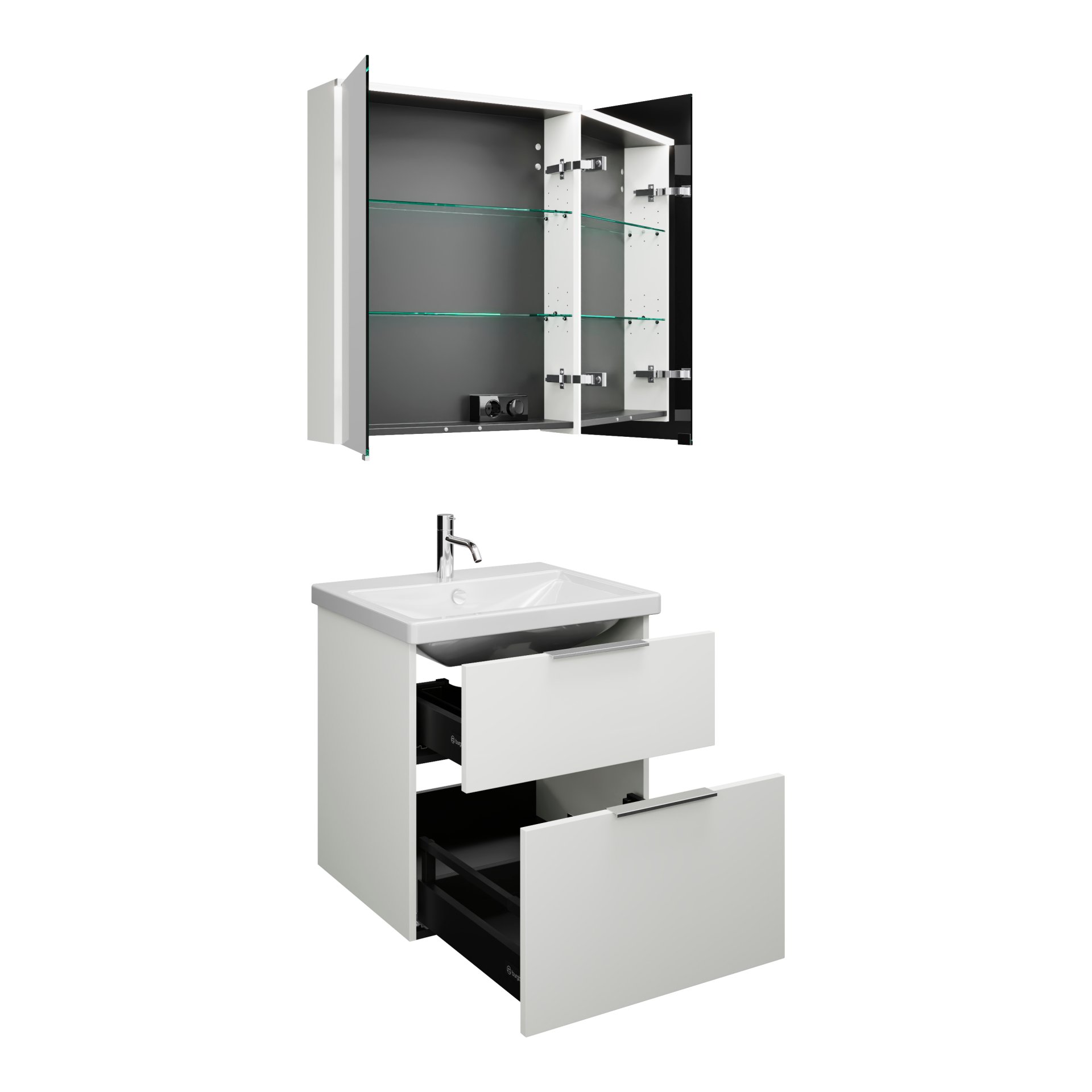 - Ausstattung: 2 Türen mit Innenspiegel, 2 Glaseinlegeböden, Schalter- und Steckdosenelement, LED Aufsatzleuchte (1 x 6 W, neutralweiß, IP24, 4250 Kelvin)