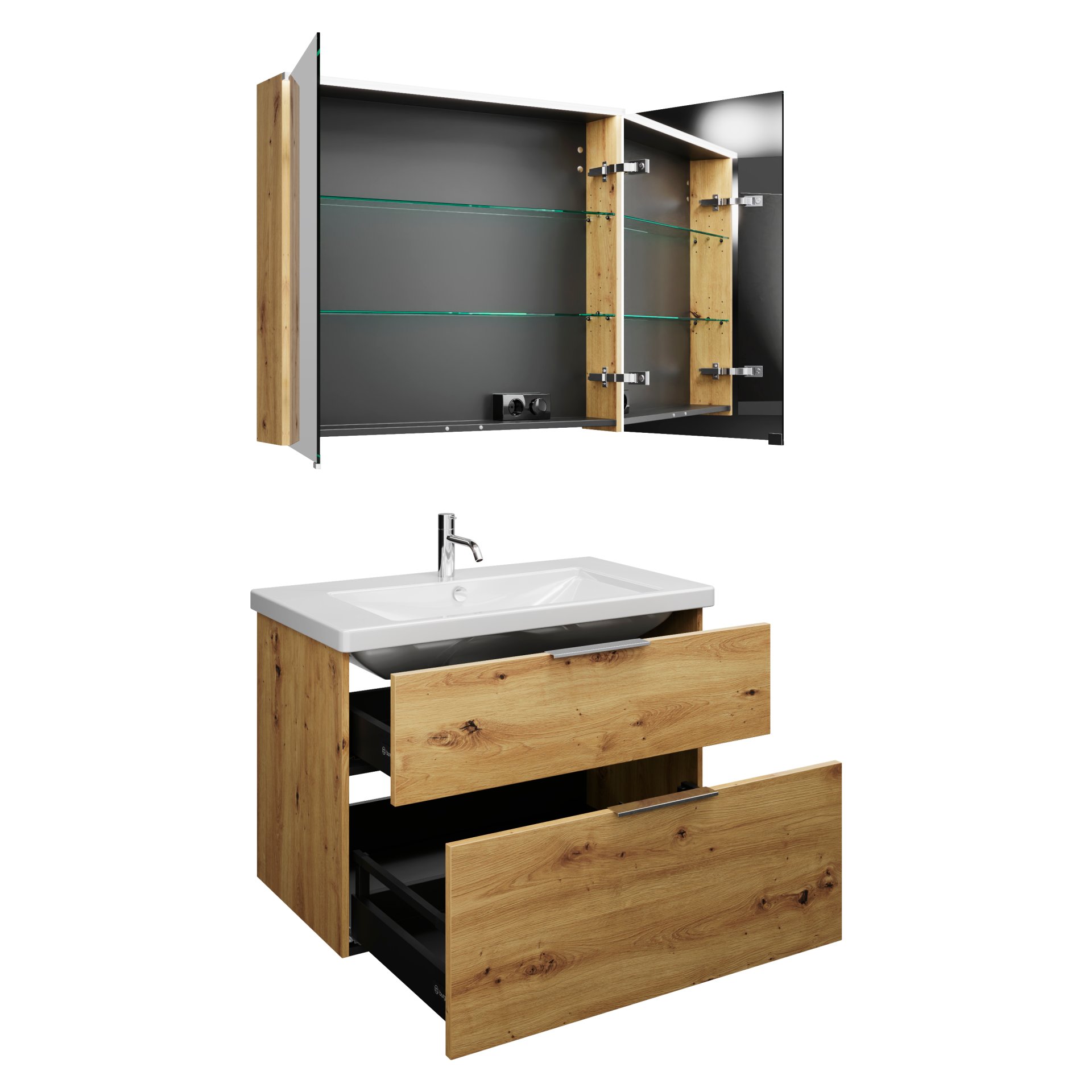 - Ausstattung: 2 Türen mit Innenspiegel, 2 Glaseinlegeböden, Schalter- und Steckdosenelement, LED Aufsatzleuchte (1 x 8,4 W, neutralweiß, IP24, 4250 Kelvin)
