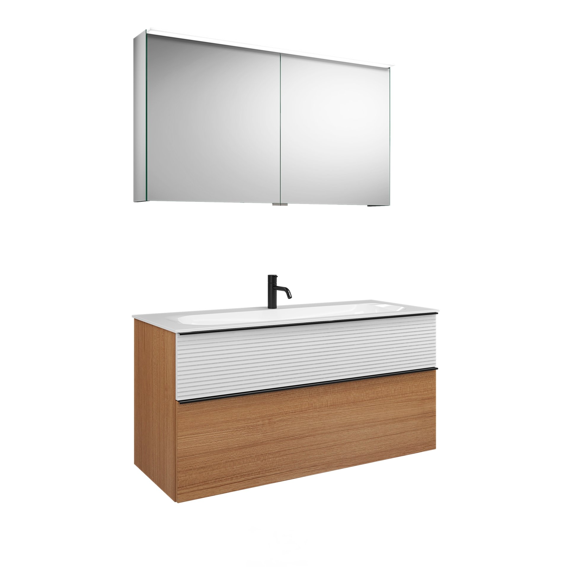 Burgbad FIUMO Waschtisch Set mit Spiegelschrank 122 cm breit, Weiß/Braun, Waschbecken Gussmarmor Weiß