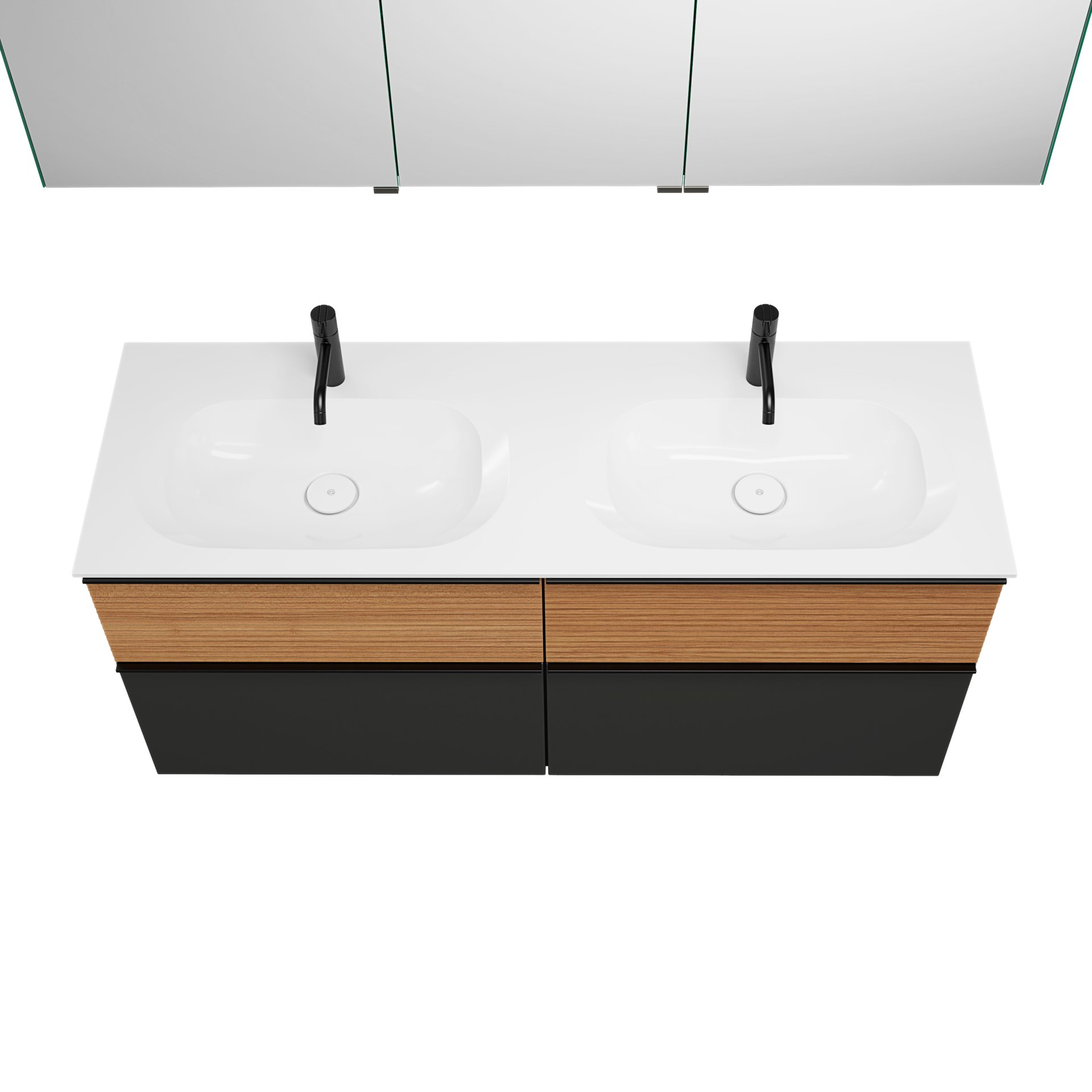 Burgbad FIUMO Waschtisch Set mit Spiegelschrank 142 cm breit, Braun/Anthrazit, Doppelwaschbecken Gussmarmor Weiß, 4 Schubladen, Anschlag links