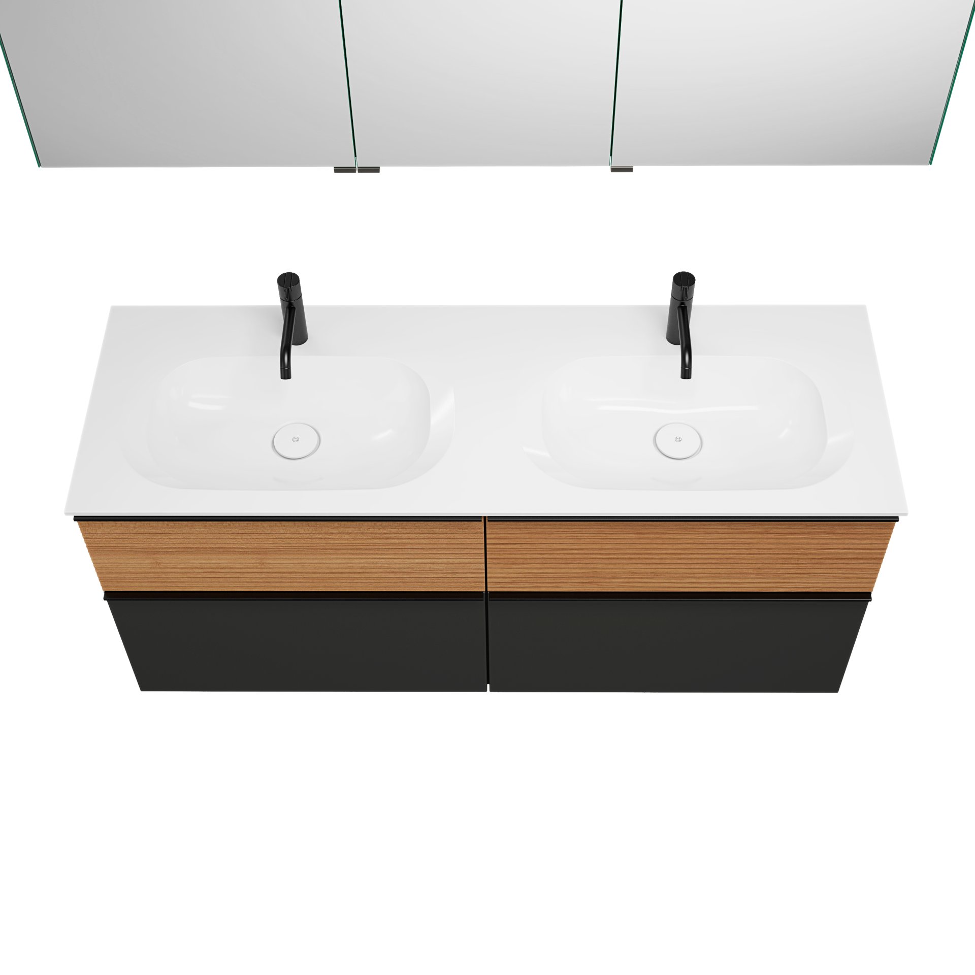 Burgbad FIUMO Waschtisch Set mit Spiegelschrank 142 cm breit, Braun/Anthrazit, Doppelwaschbecken Gussmarmor Weiß, 4 Schubladen, Anschlag rechts