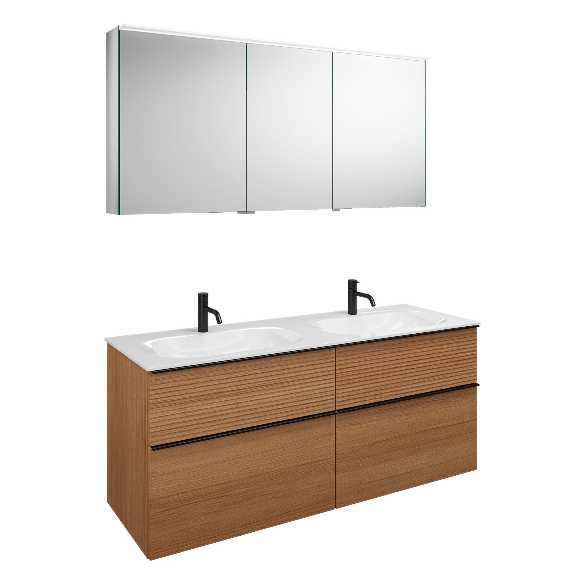 Burgbad FIUMO Waschtisch Set mit Spiegelschrank 142 cm breit, Braun, Doppelwaschbecken Gussmarmor Weiß, 4 Schubladen, Anschlag rechts