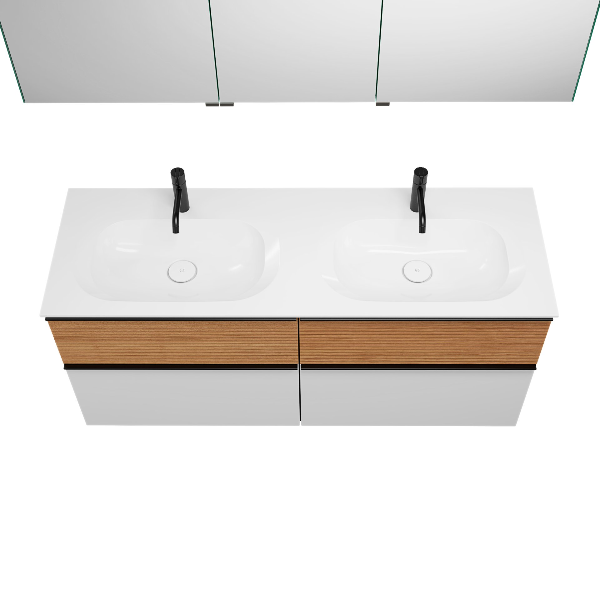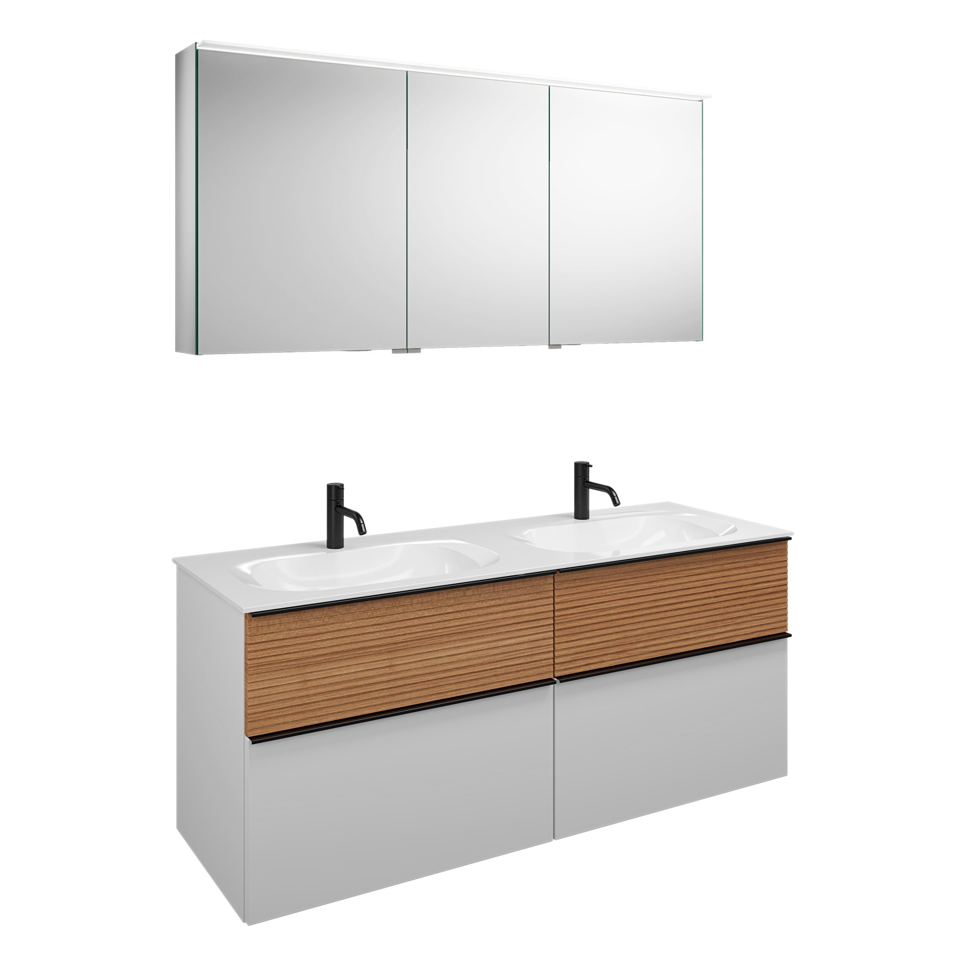 Burgbad FIUMO Waschtisch Set mit Spiegelschrank 142 cm breit, Braun/Weiß, Doppelwaschbecken Gussmarmor Weiß, 4 Schubladen, Anschlag rechts