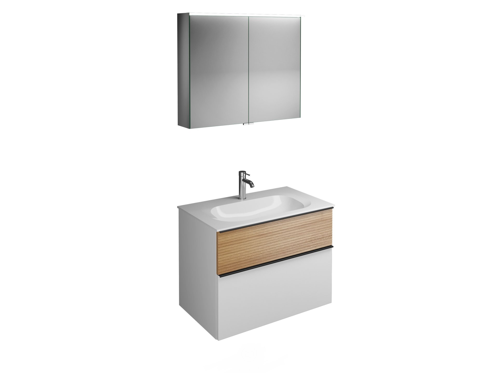 Burgbad FIUMO Waschtisch Set mit Spiegelschrank 82 cm breit, Braun/Weiß, Waschbecken Gussmarmor Weiß