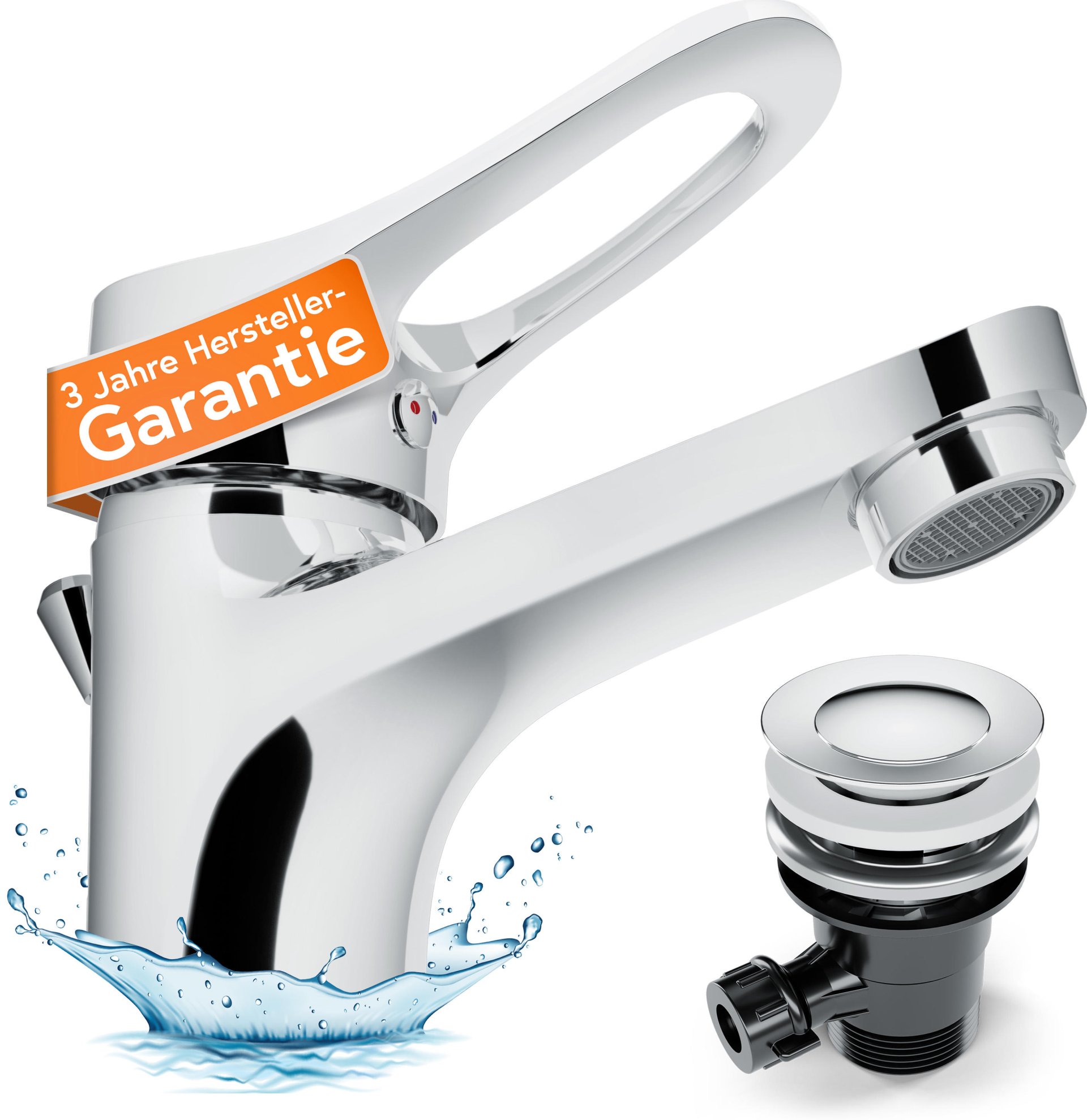 - Waschtischarmatur mit Zugstange, Ablaufgarnitur zum Öffnen und Schließen des Ablaufs