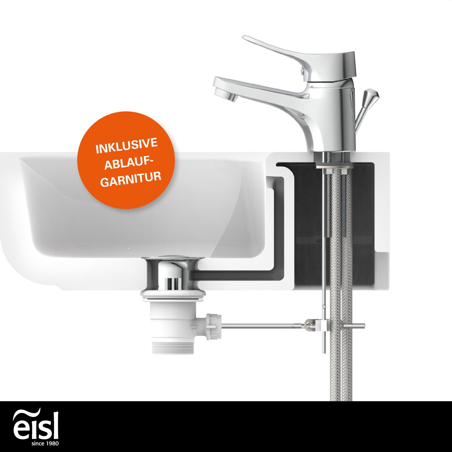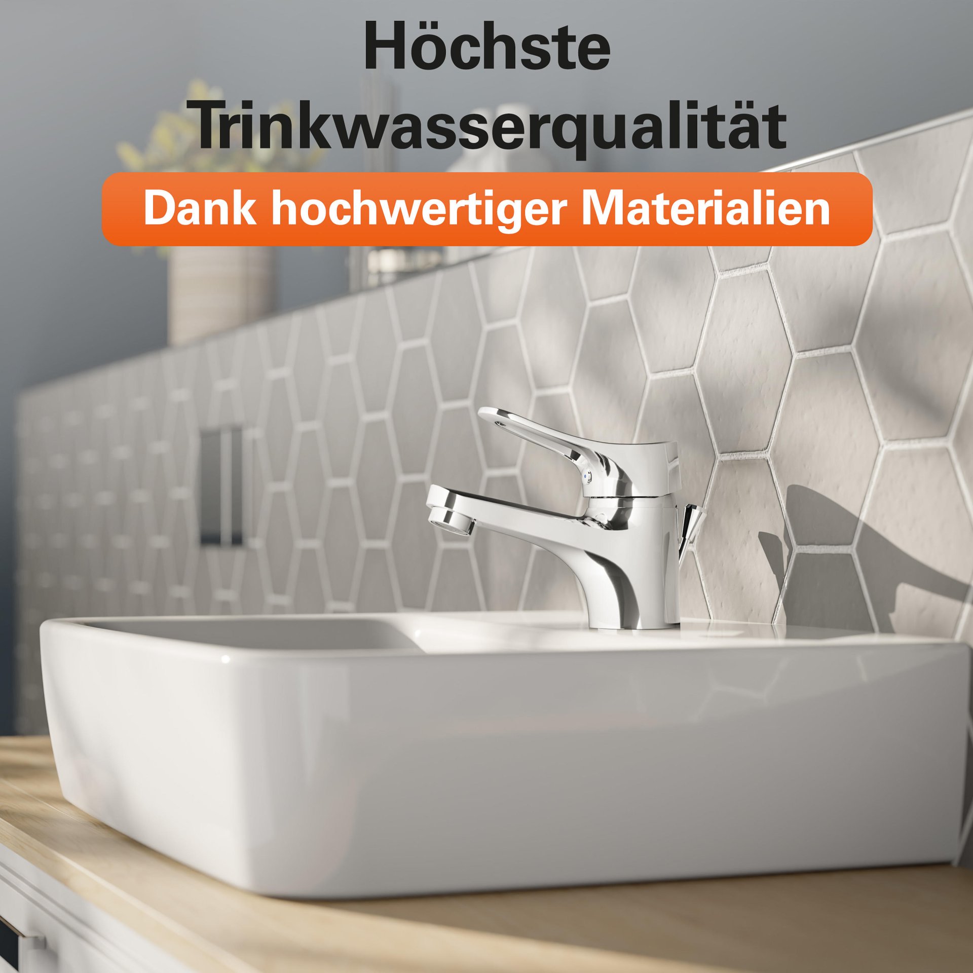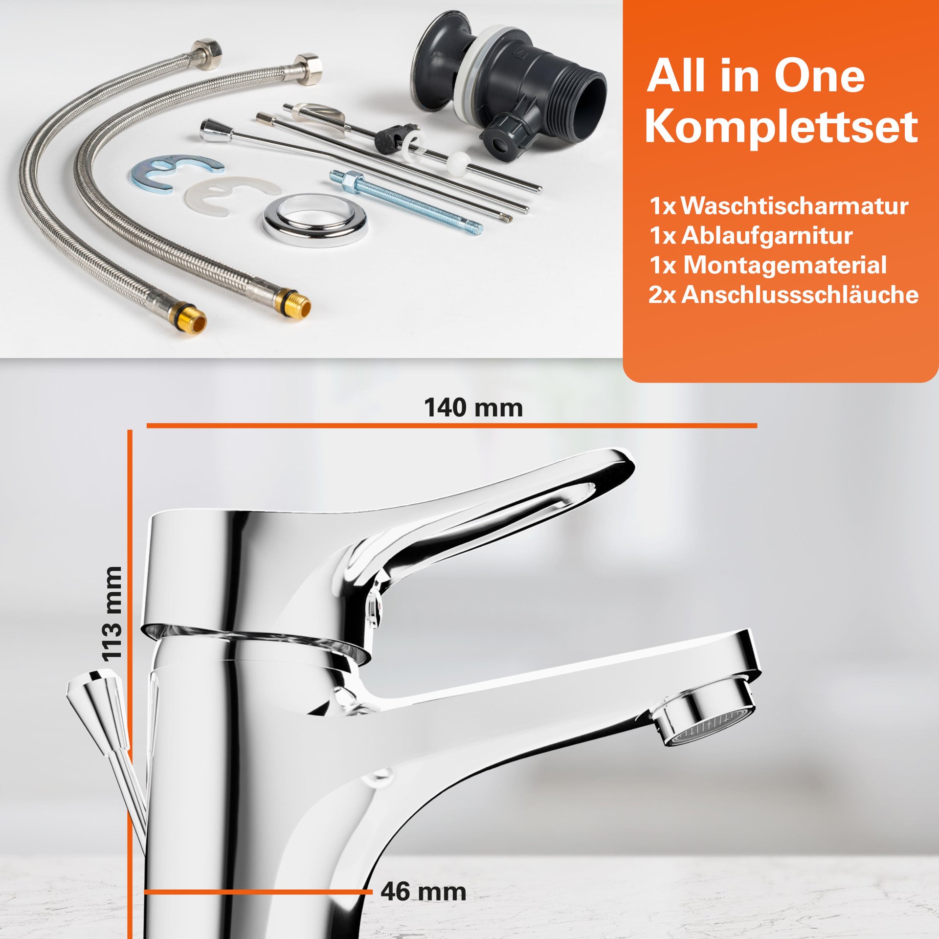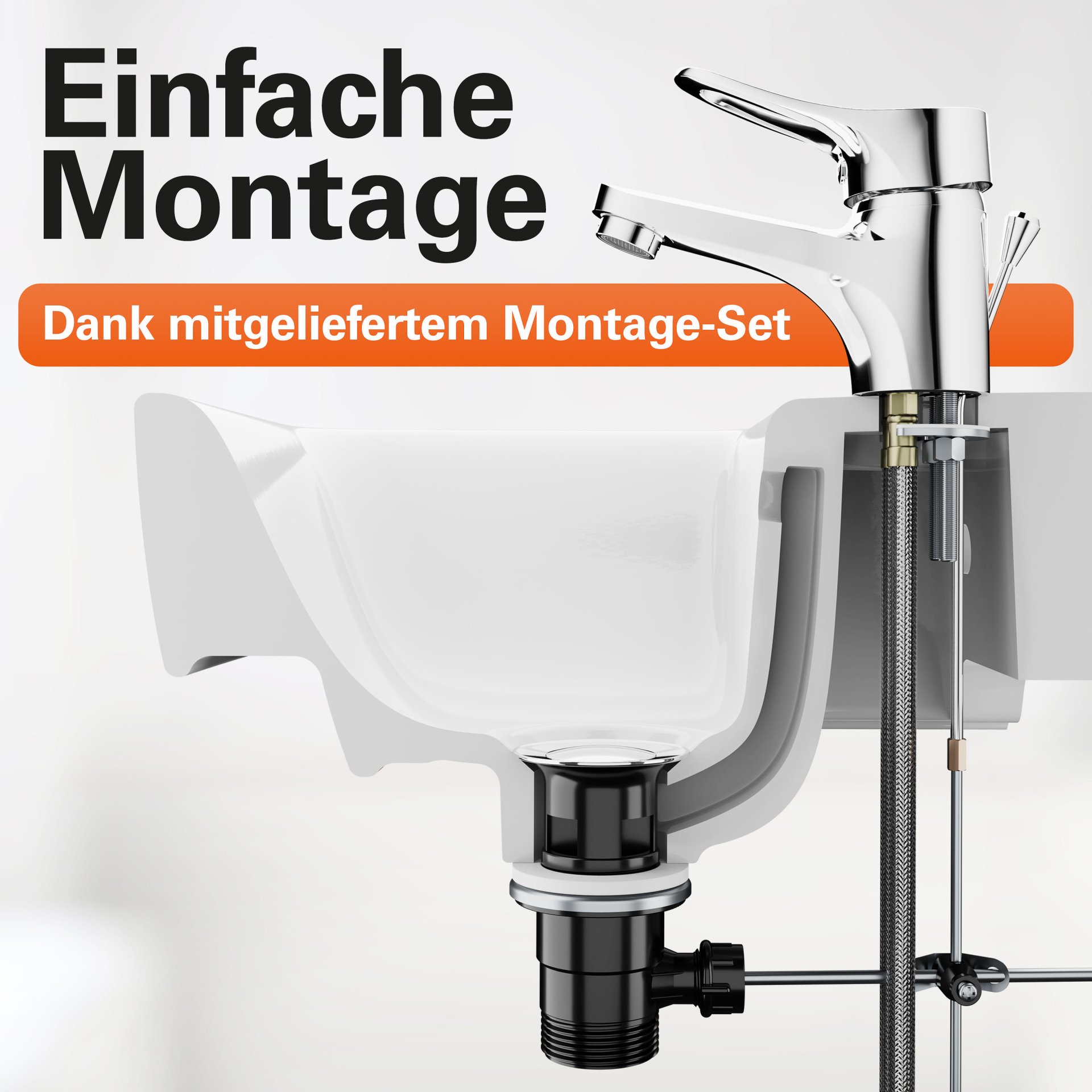 - Vollständiges Montageset mit hochwertigen, flexiblen Anschlussschläuchen an das Hauswassersystem