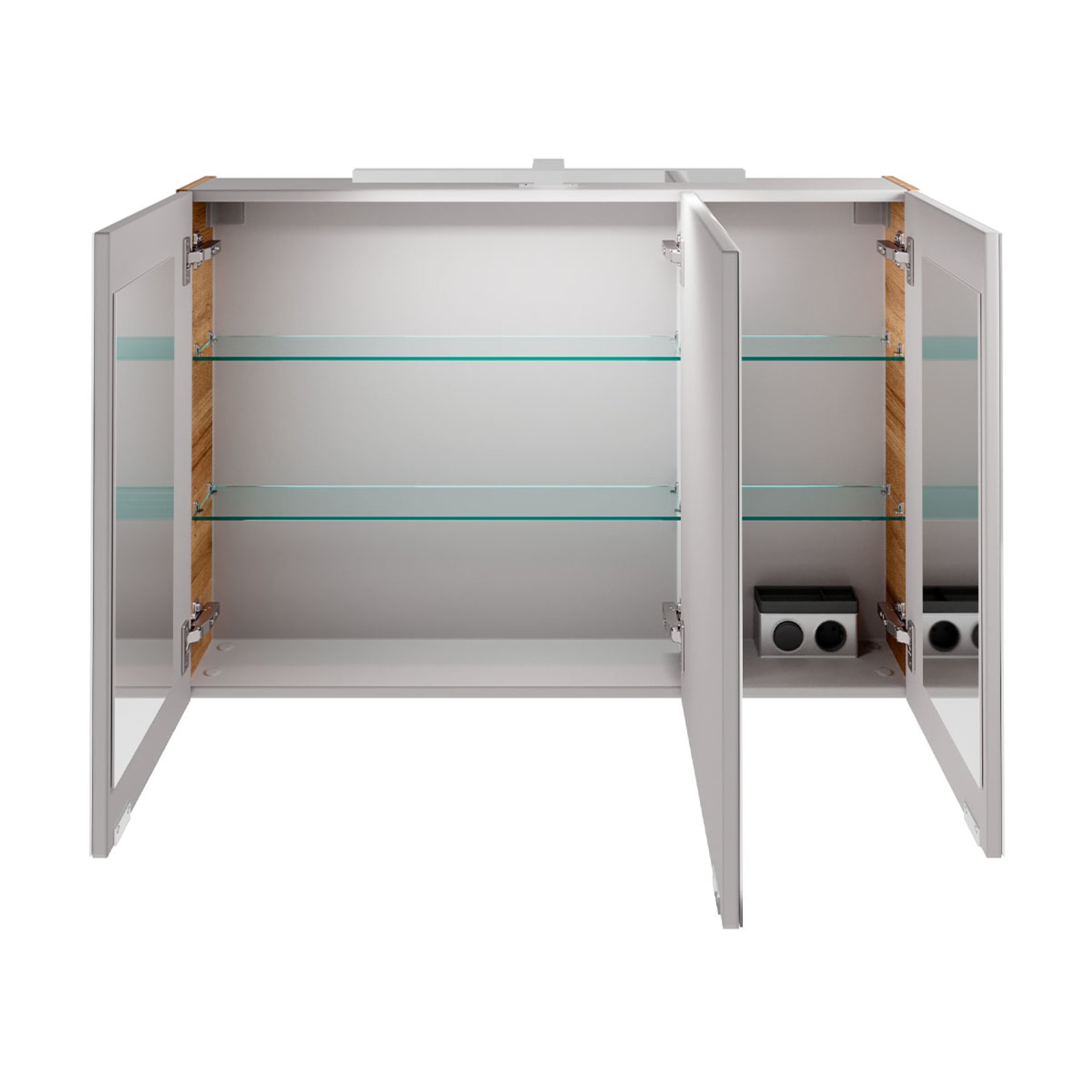- Ausstattung: 3 Türen, Tür links und rechts mit Innenspiegel, 4 Glasböden, gedämpfte Scharniere, Querteile und Rückwand silbergrau