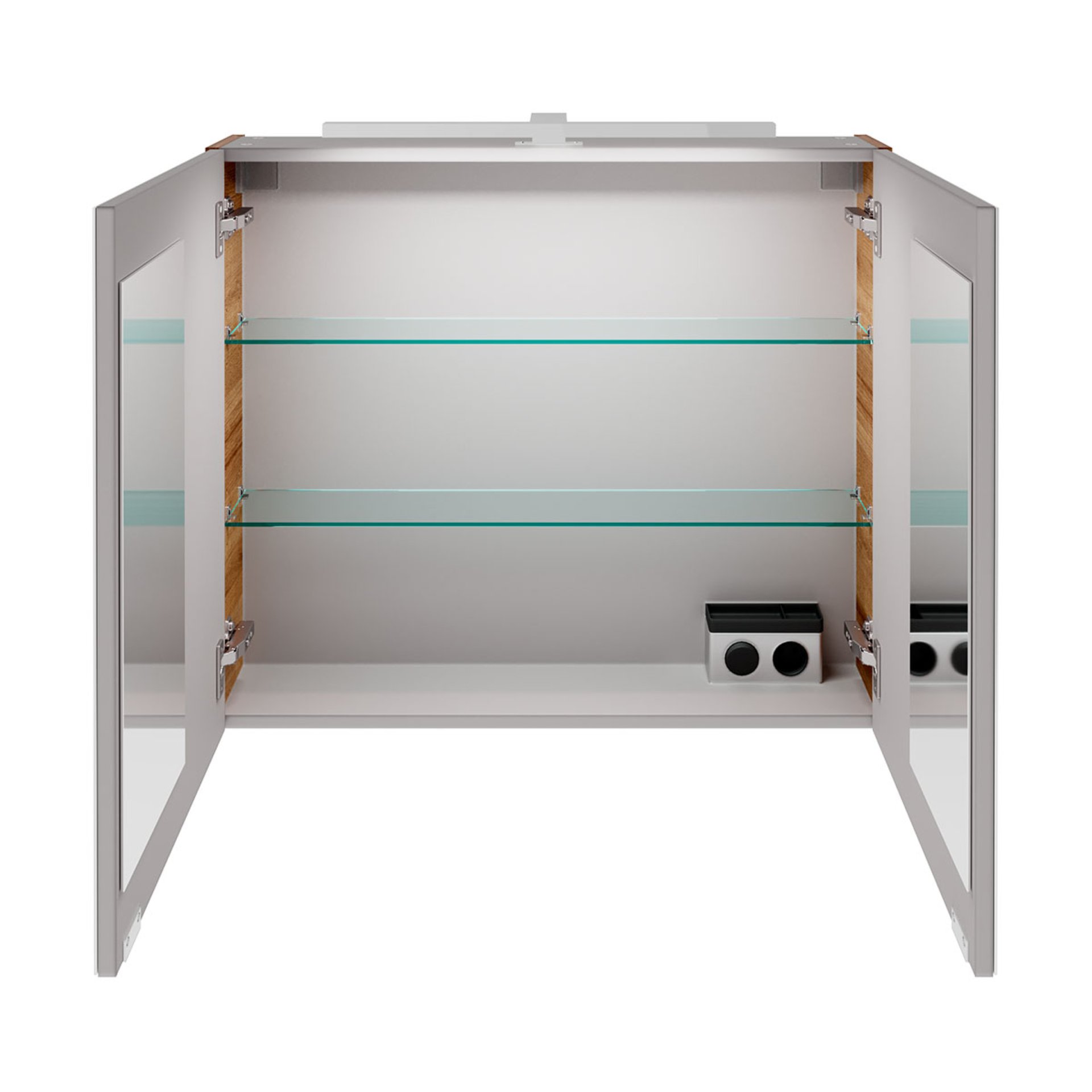 - Ausstattung: 2 Türen mit Innenspiegel, 2 Glasböden, gedämpfte Scharniere, Querteile und Rückwand silbergrau