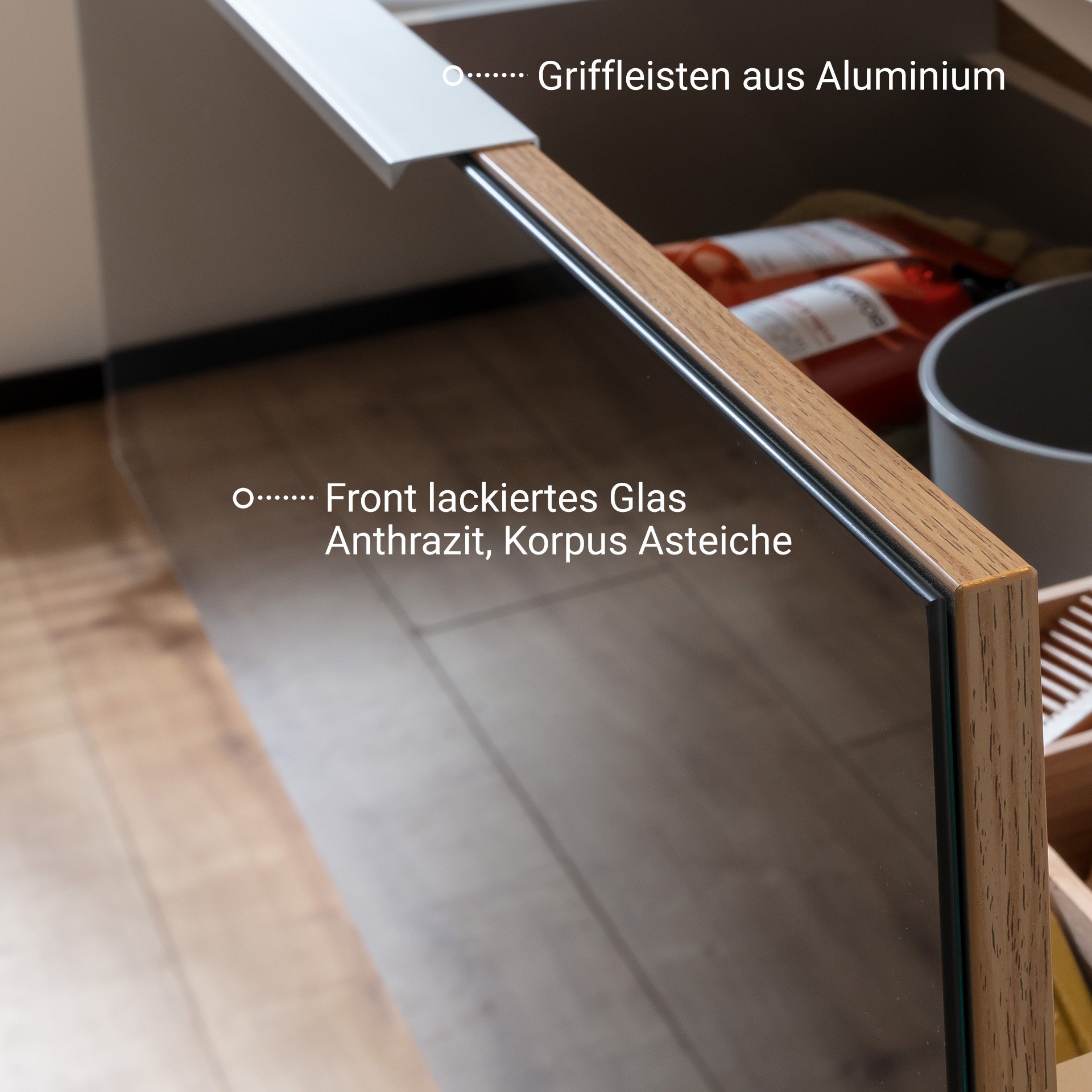 - Design: Korpus Ast-Eiche und Front lackiertes Glas Anthrazit